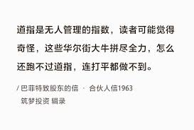 巴菲特曰:“ 道指 是无人管理的指数,读者可能觉得奇怪,这些华尔街大牛拼尽全力,怎么还跑不过道指,连打平都做不到。”
