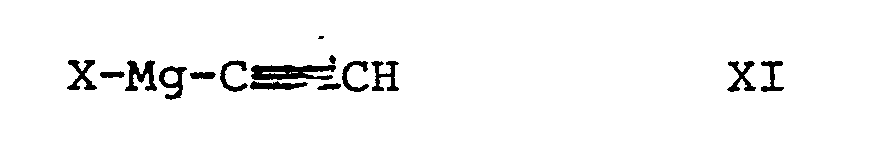 Diese Umsetzung wird unter den üblichen Bedingungen einer Grignard-Synthese durchgeführt. This reaction is carried out under the usual conditions of a Grignard synthesis. Die Ueberführung der Verbindung der Formel V in die Verbindung der Formel VI kann aber auch durch Umsetzung der Verbindung der Formel V mit einem Alkalimetallacetylid, beispielsweise Natriumacetylid oder Lithiumacetylid erfolgen, wobei man unter den üblichen, für die Reaktion eines Ketons mit einem Acetylid geeigneten Bedingungen arbeitet. The conversion of the compound of formula V to the compound of formula VI can also be effected by reacting the compound of formula V with a Alkalimetallacetylid, for example, sodium acetylide or lithium acetylide, the reaction being carried under the usual, for the reaction of a ketone with an acetylide suitable conditions , Ueblicherweise wird diese Umsetzung in flüssigem Ammoniak durchgeführt. Typically, this reaction is carried out in liquid ammonia.