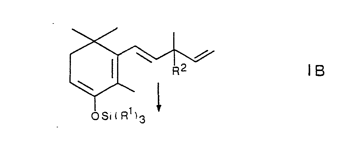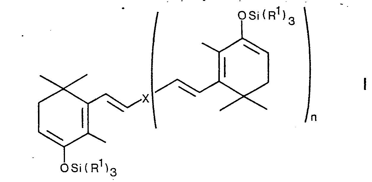 Gruppe 6,11-Dimethylhexadeca-2,4,6,8,10,12,14-heptaen-2,15-diyl stehen, die Reste R 1 gleiche oder verschiedene Bedeutung haben und Alkylgruppen bezeichnen, und der Rest R 2 eine Trialkylsiloxygruppe -OSi(R l ) 3 oder eine Aethergruppe darstellt, mit Percarbonsäure oxidiert und, gewünschtenfalls, das erhaltene α-Siloxyketon der allgemeinen Formel Group 6,11-Dimethylhexadeca-2,4,6,8,10,12,14-heptaene-2,15-diyl, the radicals R 1 are identical or different meaning and denote alkyl groups, and the radical R 2 is a trialkylsiloxy -OSi (R l) 3, or represents an ether group, is oxidized with percarboxylic acid and, if desired, the obtained α-Siloxyketon of the general formula worin n, X und R 1 die obigen Bedeutungen haben, zu einem a-Hydroxyketon der allgemeinen Formel wherein n, X and R 1 have the above meanings, to an a-hydroxyketone of the general formula worin n für die Zahl 0 und Y für eine Gruppe wherein n is the number 0 and Y is a group oder n für die Zahl 1 und Y für die Gruppe 6,11-Dimethylhexadeca-2,4,6,8,10,12,14- heptaen-2,15-diyl stehen, und R 3 die Hydroxygruppe oder eine Aethergruppe darstellt, hydrolysiert. or n is the number 1 and Y-6,11-Dimethylhexadeca 2,4,6,8,10,12,14- are diyl heptaene-2,15-for the group and R 3 represents the hydroxy group, or an ether, hydrolyzed. [0004] [0004]