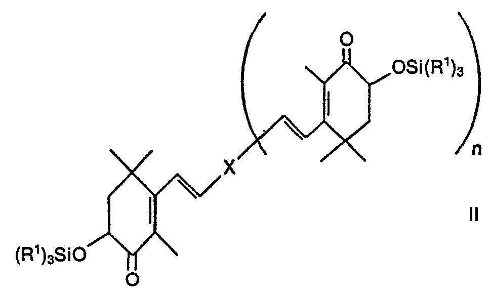 Das erfindungsgemässe Verfahren ist dadurch gekennzeichnet, dass man einen Silyl-enoläther der allgemeinen Formel The inventive method is characterized in that a silyl-enol ethers of the general formula - worin n für die Zahl 0 und X für eine Gruppe wherein n is the number 0 and X is a group oder n für die Zahl 1 und X für die Gruppe 6,11-Dimethylhexadeca-2,4,6,8,10,12,14-heptaen-2,15-diyl stehen, die Reste R 1 gleiche oder verschiedene Bedeutung haben und Alkylgruppen bezeichnen, und der Rest R 2 eine Trialkylsiloxygruppe -OSi(R 1 ) 3 oder eine Äthergruppe darstellt, mit Percarbonsäure oxidiert und, gewünschtenfalls, das erhaltene a-Siloxyketon der allgemeinen Formel or n is the number 1 and X is the group of 6,11-Dimethylhexadeca-2,4,6,8,10,12,14-2,15-diyl heptaene, the radicals R 1 are identical or different and denote alkyl groups, and the radical R 2 is a trialkylsiloxy group -OSi (R 1) 3, or an ether group, is oxidized with a percarboxylic acid and, if desired, the obtained a-Siloxyketon of the general formula