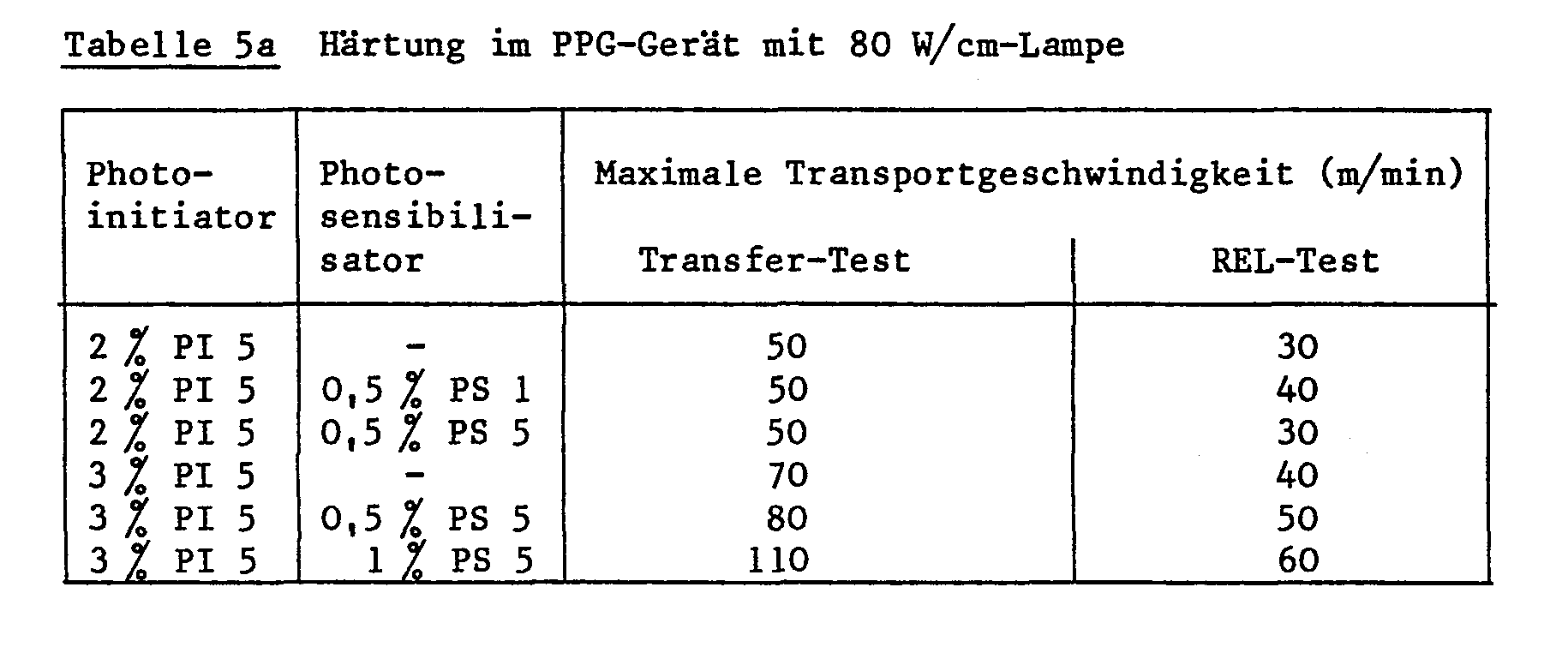Die so hergestellten Weisslacke werden in einer Dicke von 30 um mit einer Rakel auf Glasplatten aufgetragen. The white paints thus prepared are applied in a thickness of 30 microns with a doctor blade on glass plates. Die Proben werden in einem PPG-Bestrahlungsgerät mit einer Lampe von 80 W/cm in einem Durchgang belichtet. The samples are exposed in a PPG-irradiation apparatus with a lamp of 80 W / cm in a single pass. Dabei wird die Geschwindigkeit des Durchganges der Proben durch das Bestrahlungsgerät laufend gesteigert bis keine ausreichende Härtung mehr eintritt. The speed of passage of the sample through the irradiation apparatus is continually increased until sufficient curing occurs more. Die maximale Geschwindigkeit, bei der noch ein wischfester Lackfilm entsteht, ist in Tabelle 1 als "Härtungsgeschwindigkeit" angegeben. The maximum speed at which still produces a indelible paint film is given in Table 1 as "cure rate".