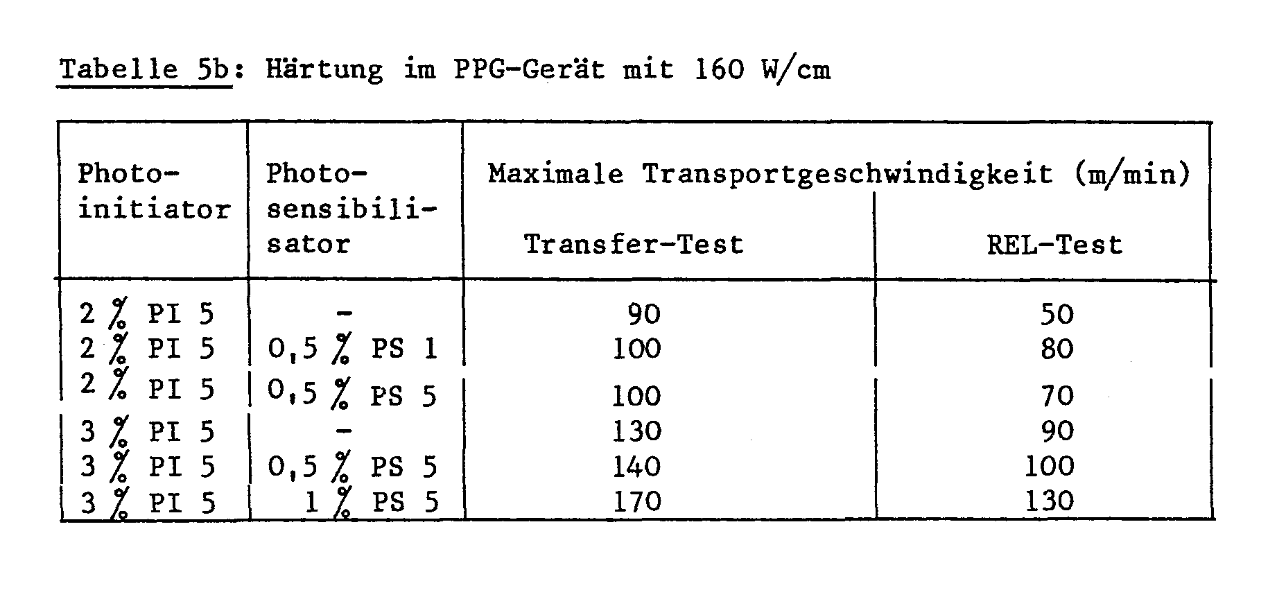 Als Sensibilisatoren werden 0,1 und 0,25 Z PS 1, PS 5 sowie die folgenden Verbindungen zugesetzt: As sensitizers are 0.1 and 0.25 Z PS 1, PS 5 and the following compounds are added: - PS 8 = 3,4-Di(ethoxycarbonyl)-thioxanthon PS 8 = 3,4-di (ethoxycarbonyl) -thioxanthon