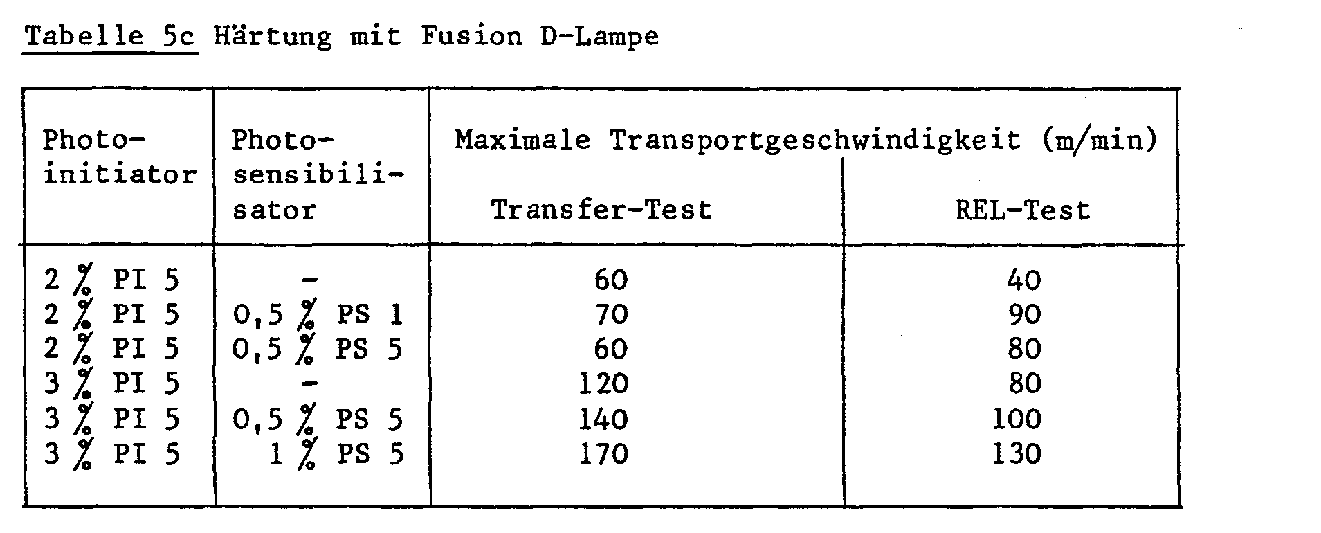Die Bestrahlung geschieht wie oben beschrieben. The irradiation is done as described above. Unmittelbar nach der Bestrahlung wird die Durchhärtung in einem REL-Durchhärtungsprüfgerät getestet. Immediately after the irradiation, the curing is tested in a REL-Durchhärtungsprüfgerät. Dabei wird auf die bedruckte Probe ein mit Stoff überspannter Aluminium-Zylinder aufgesetzt und unter einem Druck von 220 g/cm 2 innerhalb 10 sec einmal um die eigene Achse gedreht. In this case, is placed on the printed sample, a material with extravagant aluminum cylinder and is rotated once under a pressure of 220 g / cm 2 within 10 sec on its own axis. Wenn dabei auf der Probe sichtbare Beschädigungen entstehen, so ist die Druckfarbe ungenügend durchgehärtet. If there arise on the sample visible damage, so the ink is insufficiently cured. In den Tabellen wird die maximale Transportgeschwindigkeit angegeben, bei der der REL-Test noch bestanden wurde. The tables show the maximum transport speed is specified at which the REL test was still passed. [0094] [0094]