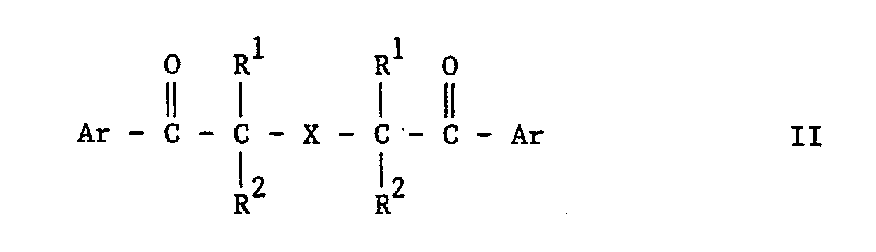 Bevorzugt sind weiterhin Gemische, die als Komponente B) einen Photoinitiator der Formel I oder II enthalten, worin Ar eine unsubstituierte oder durch Chlor, C 1 -C 4 -Alkyl, Methylendioxy, -OR 5 , -SR 6 , -N(R 7 )(R 8 ) oder durch eine Gruppe der Formel Preferably mixtures which B) contain as component a photoinitiator of formula I or II in which Ar is an unsubstituted or substituted by chlorine, C 1 -C 4 alkyl, methylenedioxy, -OR 5, -SR 6, -N (R 7 are further ) (R 8) or by a group of the formula substituierte Phenyl- oder 4-Benzoylphenylgruppe bedeutet, X einen Rest der Formel substituted phenyl or 4-benzoylphenyl group, X is a radical of formula bedeutet, R 1 und R 2 unabhängig voneinander C 1 -C 4 -Alkyl, -CH 2 CH 2 COO(C 1 -C 4 -Alkyl), Allyl oder Benzyl bedeuten oder R 1 und R 2 zusammen unverzweigtes C 4 -C 5 -Alkylen bedeuten, R 3 und R 4 unabhängig voneinander C 1 -C 12 -Alkyl, durch OH, C 1 -C 4 -Alkoxy, CN oder -COO(C 1 -C 4 -Alkyl) substituiertes C 2 -C 4 -Alkyl, Allyl, Cyclohexyl oder Benzyl bedeuten, oder R 3 und R 4 zusammen C 4 -C 6 -Alkylen bedeuten, das durch -0- oder -N(R 12 )- unterbrochen sein kann, R 5 C 1 -C 4 -Alkyl, 2-Hydroxyethyl, 2,3-Epoxypropyl, Phenyl oder Benzyl bedeutet, R 6 C 1 -C 12 -Alkyl, Allyl, Cyclohexyl, durch OH, -COO(C 1 -C 8 -Alkyl) oder -N(CH 3 ) 2 substituiertes C l -C 4 -Alkyl, Benzyl, Phenyl, p-Tolyl oder -CH 2 CH 2 OCH 2 CH 2 SH bedeutet, R 7 und R 8 unabhängig voneinander C 1 -C 4 -Alkyl, durch -OH, C 1 -C 4 -Alkoxy, -CN oder -COO(C 1 -C 4 -Alkyl) substituiertes C 2 -C 4 -Alkyl, Cyclohexyl oder Allyl bedeuten oder R und R zusammen C 4 -C 6 -Alkylen bedeuten, das durch -0- oder -N( means R 1 and R 2 are independently C 1 -C 4 alkyl, -CH 2 CH 2 COO (C 1 -C 4 alkyl), allyl or benzyl or R 1 and R 2 together are unbranched C 4 -C 5 alkylene, R 3 and R 4 are independently C 1 -C 12 alkyl substituted by OH, C 1 -C 4 alkoxy, CN or -COO (C 1 -C 4 alkyl) substituted C 2 -C 4 - alkyl, allyl, cyclohexyl or benzyl, or R 3 and R 4 together are C 4 -C 6 -alkylene, which by -0- or -N (R 12) - may be interrupted, R 5 is C 1 -C 4 - alkyl, 2-hydroxyethyl, 2,3-epoxypropyl, phenyl or benzyl, R 6 is C 1 -C 12 alkyl, allyl, cyclohexyl, by OH, -COO (C 1 -C 8 alkyl), or -N (CH substituted 3) 2 C l -C 4 alkyl, benzyl, phenyl, p-tolyl or -CH 2 CH 2 OCH 2 CH 2 SH, R 7 and R 8 are independently C 1 -C 4 alkyl, by -OH , C 1 -C 4 alkoxy, -CN or -COO mean (C 1 -C 4 alkyl) substituted C 2 -C 4 alkyl, cyclohexyl or allyl, or R and R together are C 4 -C 6 alkylene, the (by -0- or -N R 12 )- unterbrochen sein kann, und R 12 Wasserstoff, C 1 -C 4 -Alkyl oder C 2 -C 4 -Hydroxyalkyl bedeutet, insbesondere solche, die einen Photoinitiator der Formel I enthalten, worin Ar einen unsubstituierten oder in 4-Stellung durch Chlor, Methyl, Methoxy, Methylthio, Dialkylamino oder Morpholino substituierten Phenylrest, Rund RC 1 -C 4 -Alkyl und Rund R 4 C 1 -C 4 -Alkyl oder 2-Methoxyethyl oder R und R zusammen mit dem N-Atom Morpholin bedeuten. R 12) - may be interrupted, and R 12 is hydrogen, C 1 -C 4 alkyl or C 2 -C 4 hydroxyalkyl, in particular those which contain a photoinitiator of the formula I wherein Ar is an unsubstituted or in the 4-position mean substituted by chlorine, methyl, methoxy, methylthio, dialkylamino or morpholino phenyl round is C 1 -C 4 alkyl and R and R 4 is C 1 -C 4 alkyl or 2-methoxyethyl or R and R together with the N-atom morpholine , [0027] [0027]