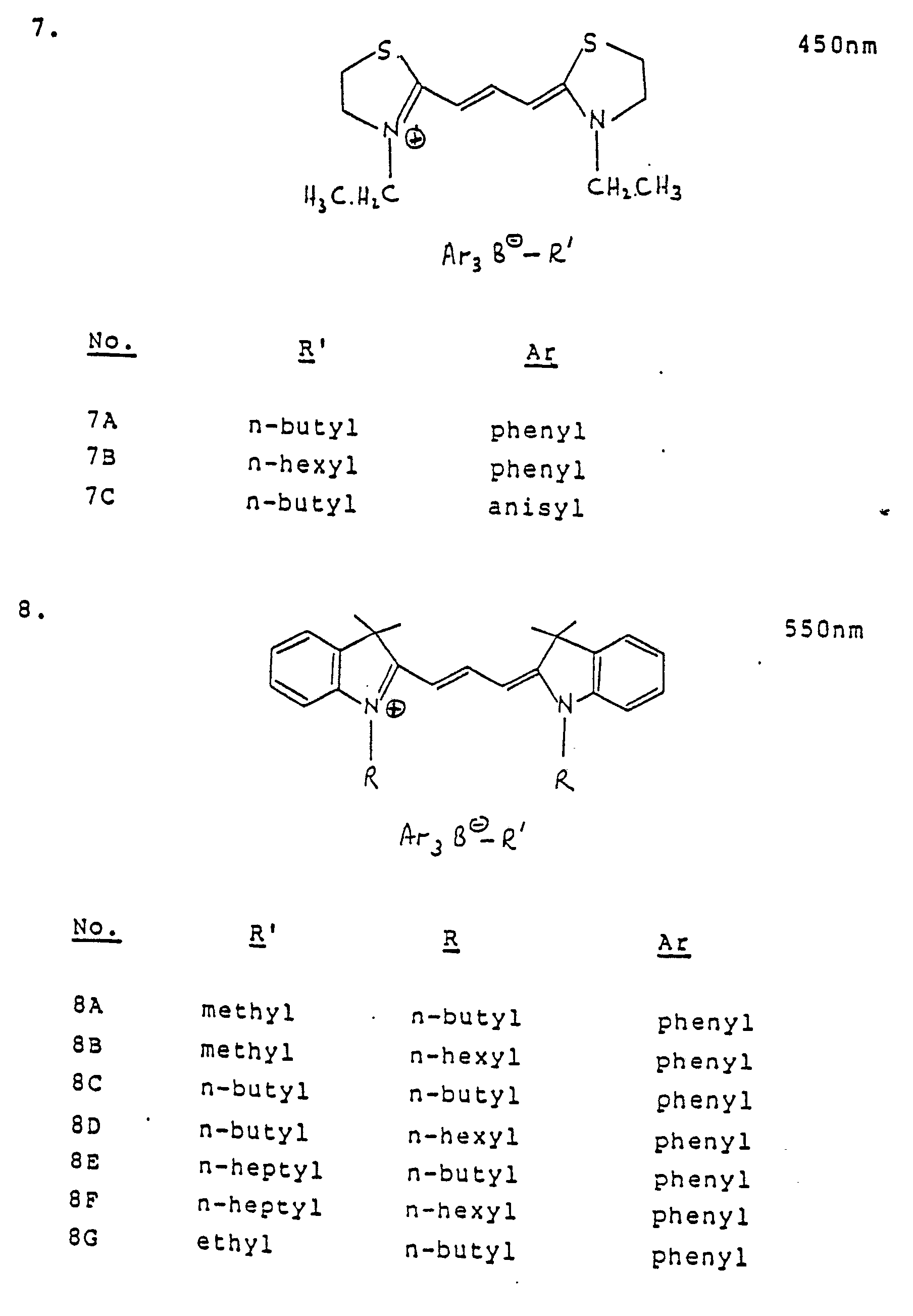The mechanism whereby the compounds absorb energy and generate free radicals is not entirely clear. It is believed that upon exposure to actinic radiation, the dye ion is excited to a singlet state in which it accepts an electron from or donates an electron to the counter ion. For a cationic dye-borate anion compound, this can be illustrated by the following equation:
