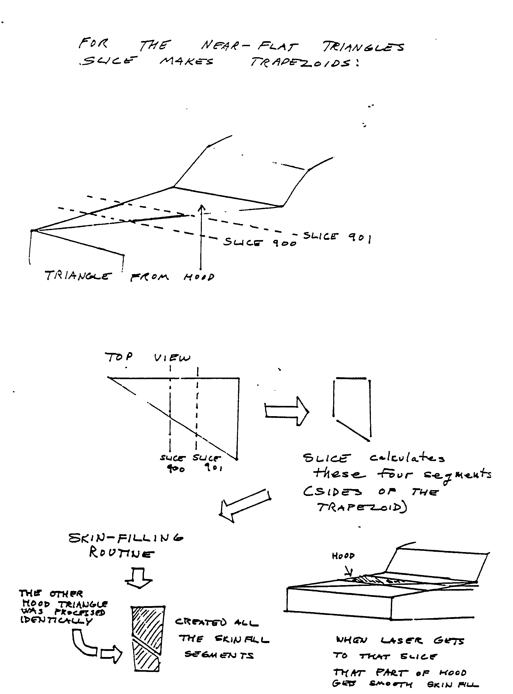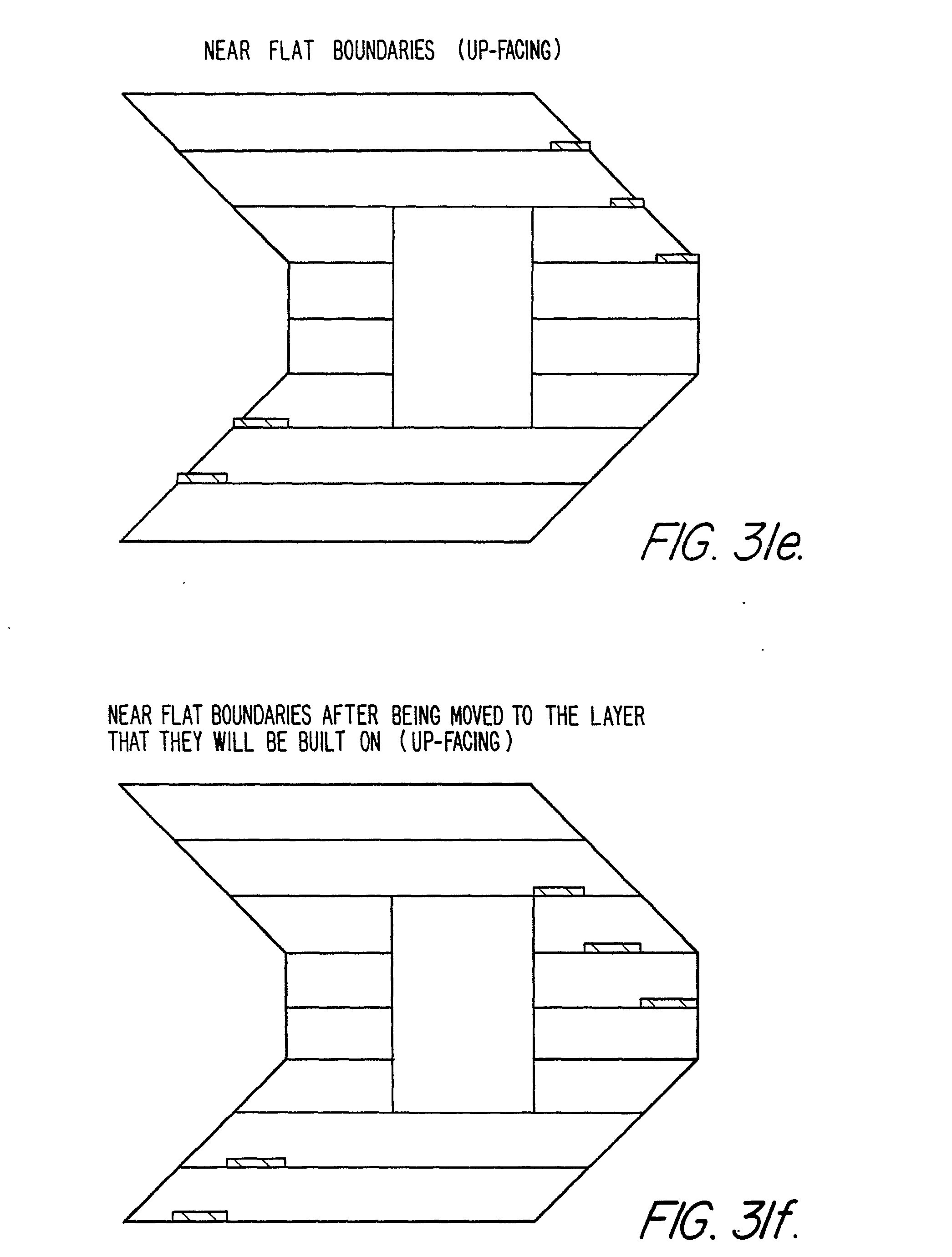 This problem of holes was approached by deciding to create skin fill in the offset region between layers when the triangles forming that portion of a layer had a slope less than a specified amount from the horizontal plane. This skin fill is known as near-horizontal or near-flat skin. This technique worked well for completing the creation of solid parts. A version of this technique also completed the work necessary for solving the transition problem. The same version of this technique that solved the transition problem also yielded the best vertical feature accuracy of objects.