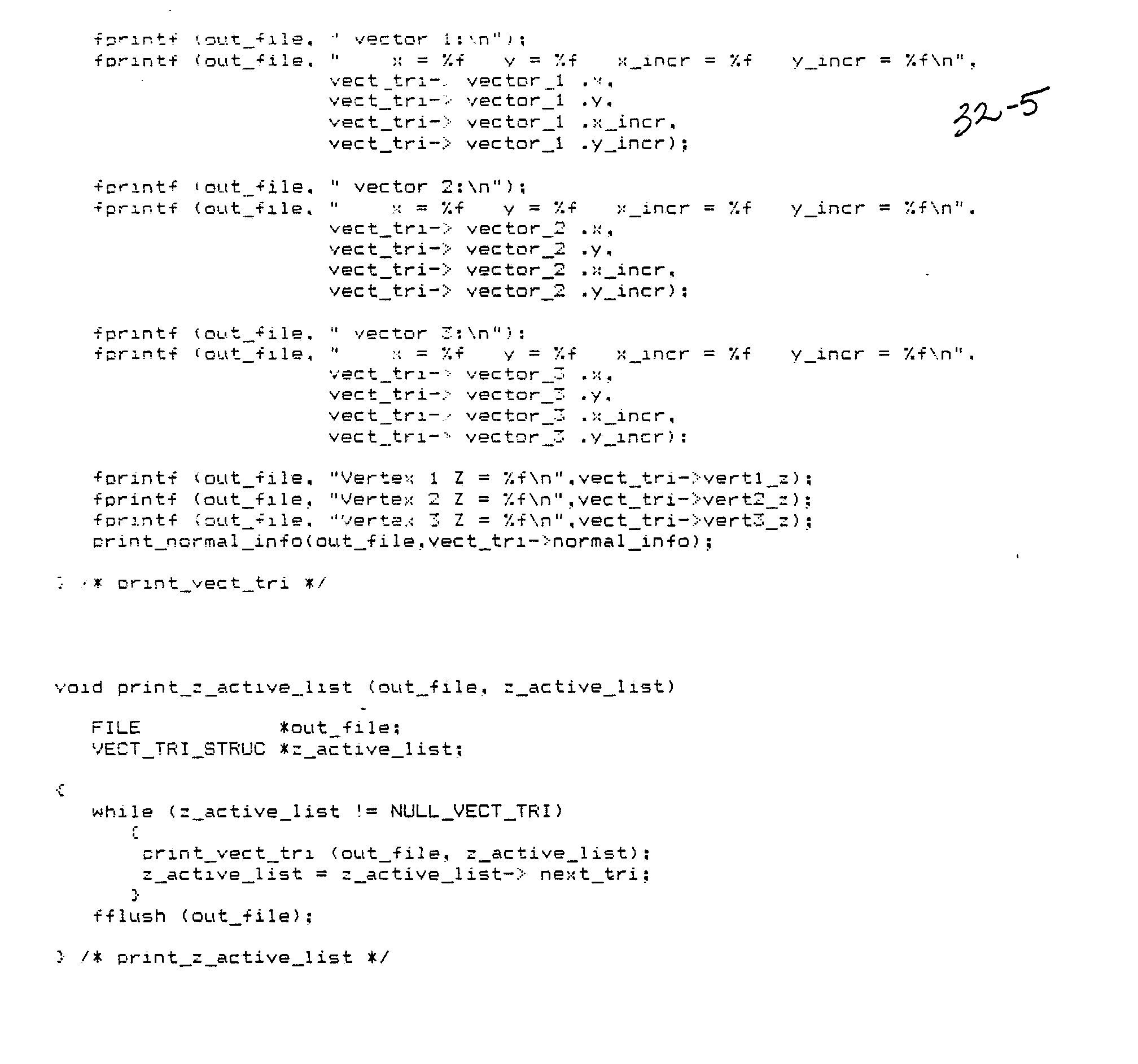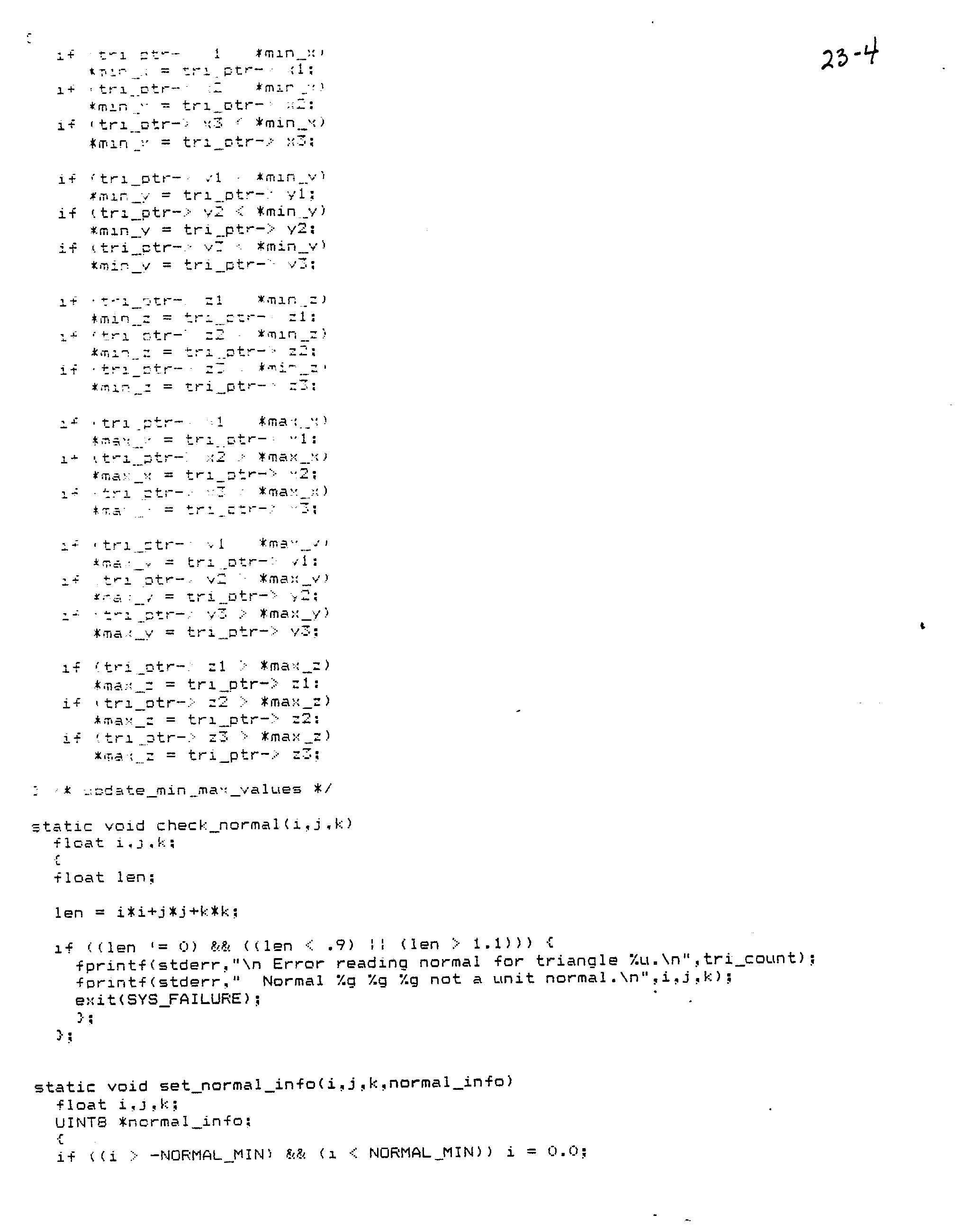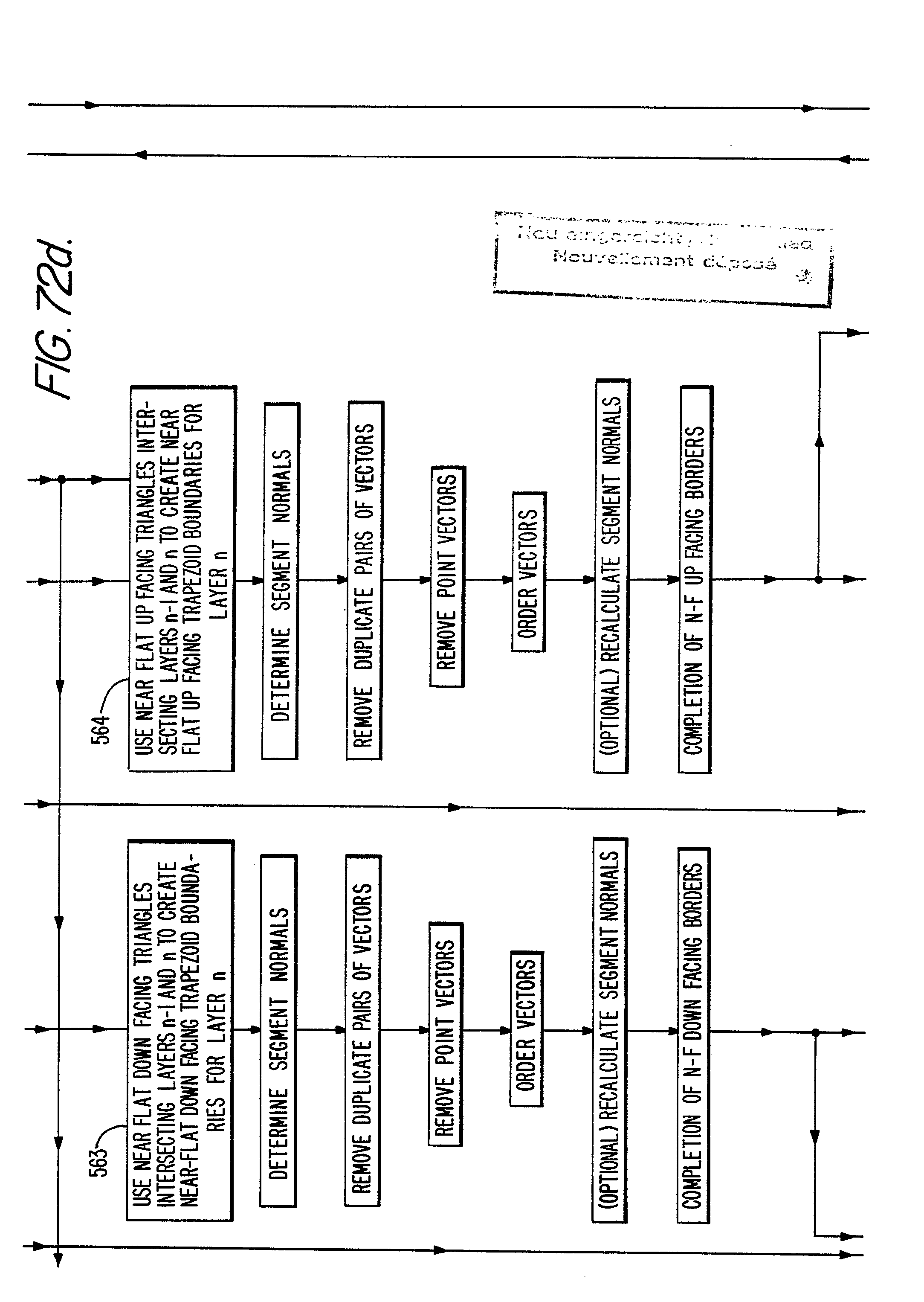 With beam width compensation, however, the segment normals are used in the offsetting substep (substep 641 in Figure 85) to determine in what direction the offset should be. Since the segment normals should point away from a solid, the offset is performed in the opposite direction to the segment normal. Therefore, it is now necessary to recompute segment normals for layer border vectors. For the other border vector types, this substep, indicated as optional in the Figures 58 and 72 flowcharts, is mandatory in Figures 84 and 85. As discussed earlier, segment normals may get reversed because of the flipping of triangles due to rounding. In this substep, they are corrected for by using the left hand rule, and by checking against the segment normals of other border vectors in the loop.