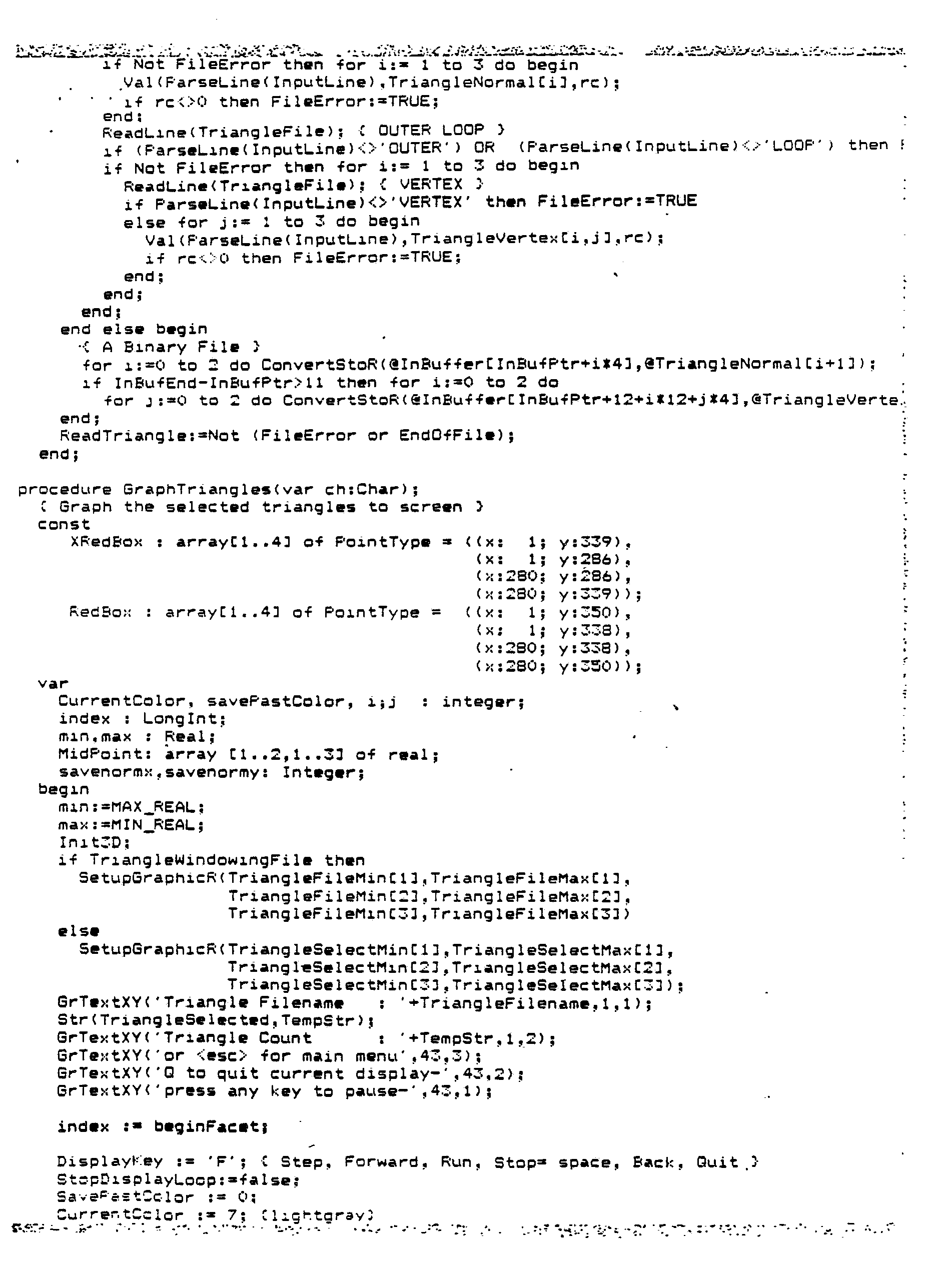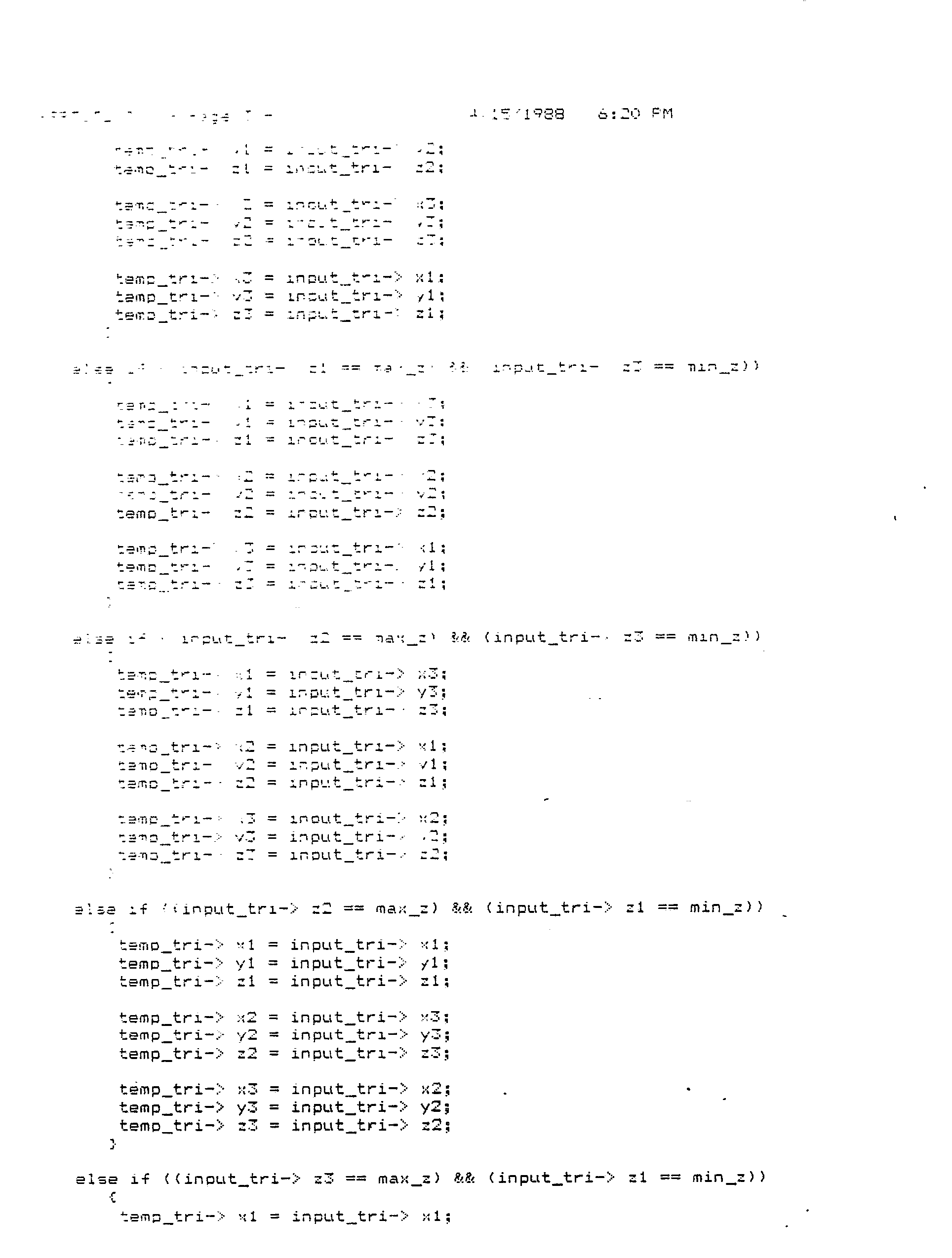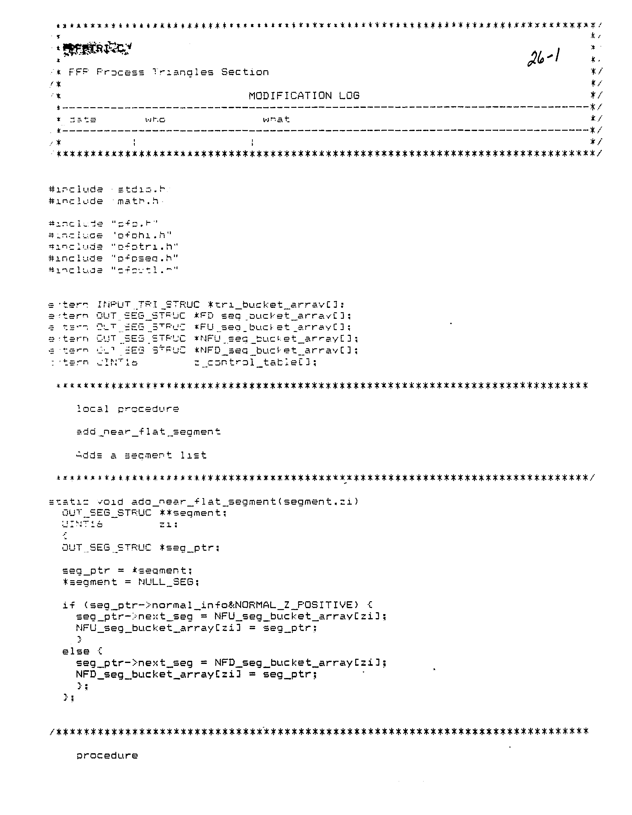 With beam width compensation, however, the segment normals are used in the offsetting substep (substep 641 in Figure 85) to determine in what direction the offset should be. Since the segment normals should point away from a solid, the offset is performed in the opposite direction to the segment normal. Therefore, it is now necessary to recompute segment normals for layer border vectors. For the other border vector types, this substep, indicated as optional in the Figures 58 and 72 flowcharts, is mandatory in Figures 84 and 85. As discussed earlier, segment normals may get reversed because of the flipping of triangles due to rounding. In this substep, they are corrected for by using the left hand rule, and by checking against the segment normals of other border vectors in the loop.