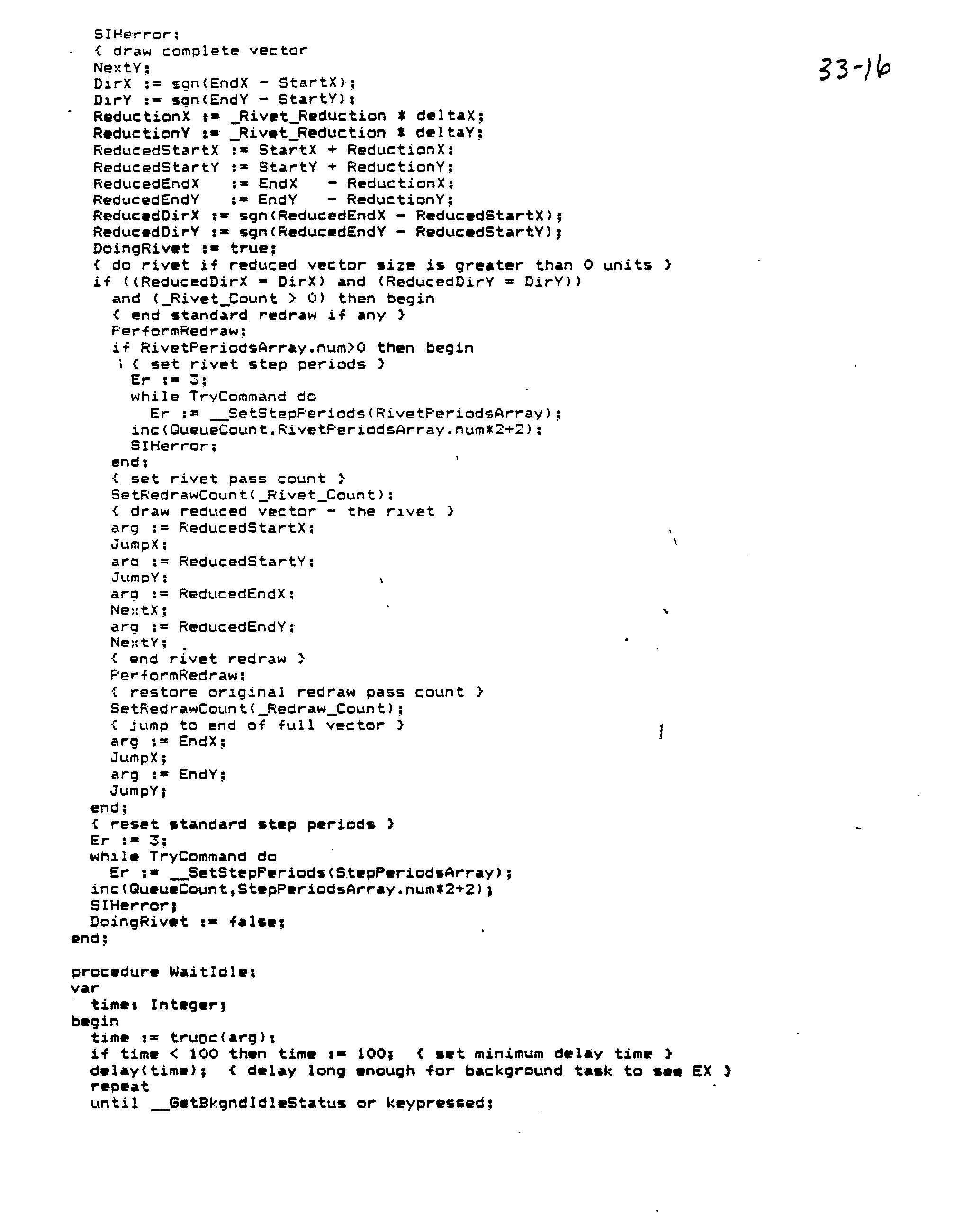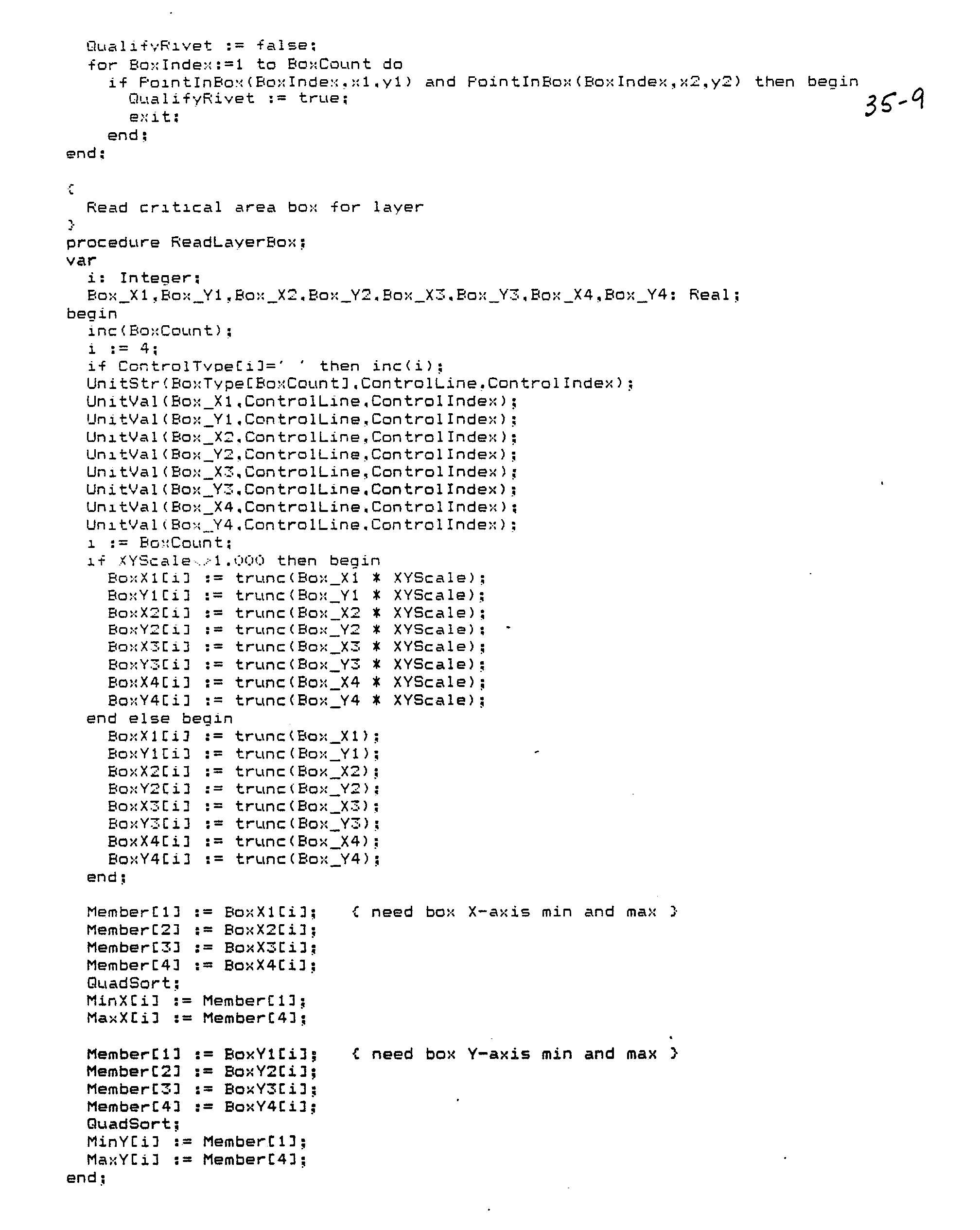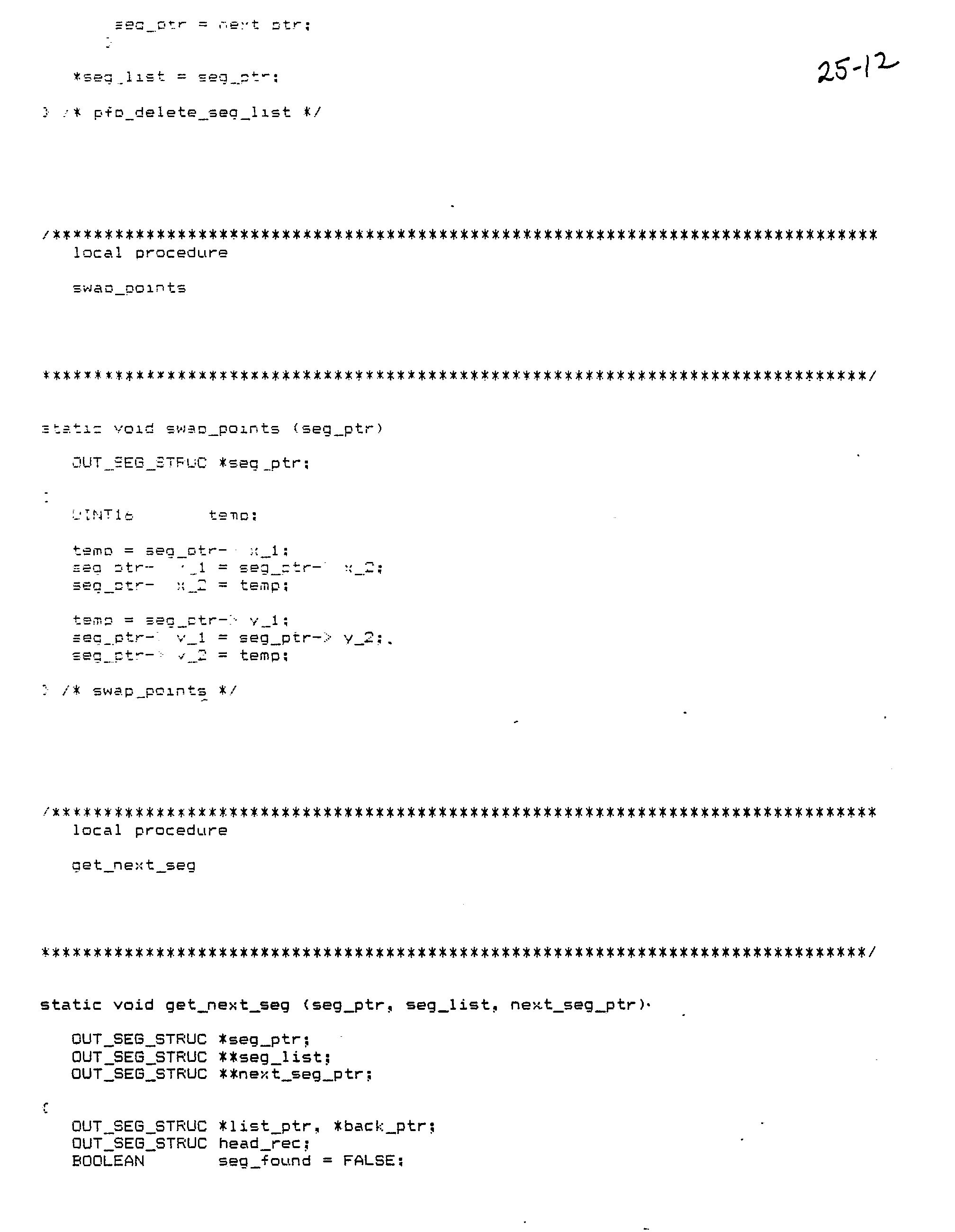 Substeps 641-644 have already been discussed extensively. In substep 641, an endpoint of a boundary vector is offset in the direction opposite its segment normal, and the boundary vectors tentatively recomputed. In substep 642, a precise comparison of the boundary vectors in the loop is performed to detect a crossover. If a crossover is not detected, in substep 643, the changes to the boundary vectors are made permanent, and the process repeats with the next endpoint in the loop. If a crossover is detected, in substep 644, the endpoint last offset is backed up until the crossover is eliminated, the border vectors recomputed and the changes made permanent, and the process is repeated with the next endpoint in the loop.