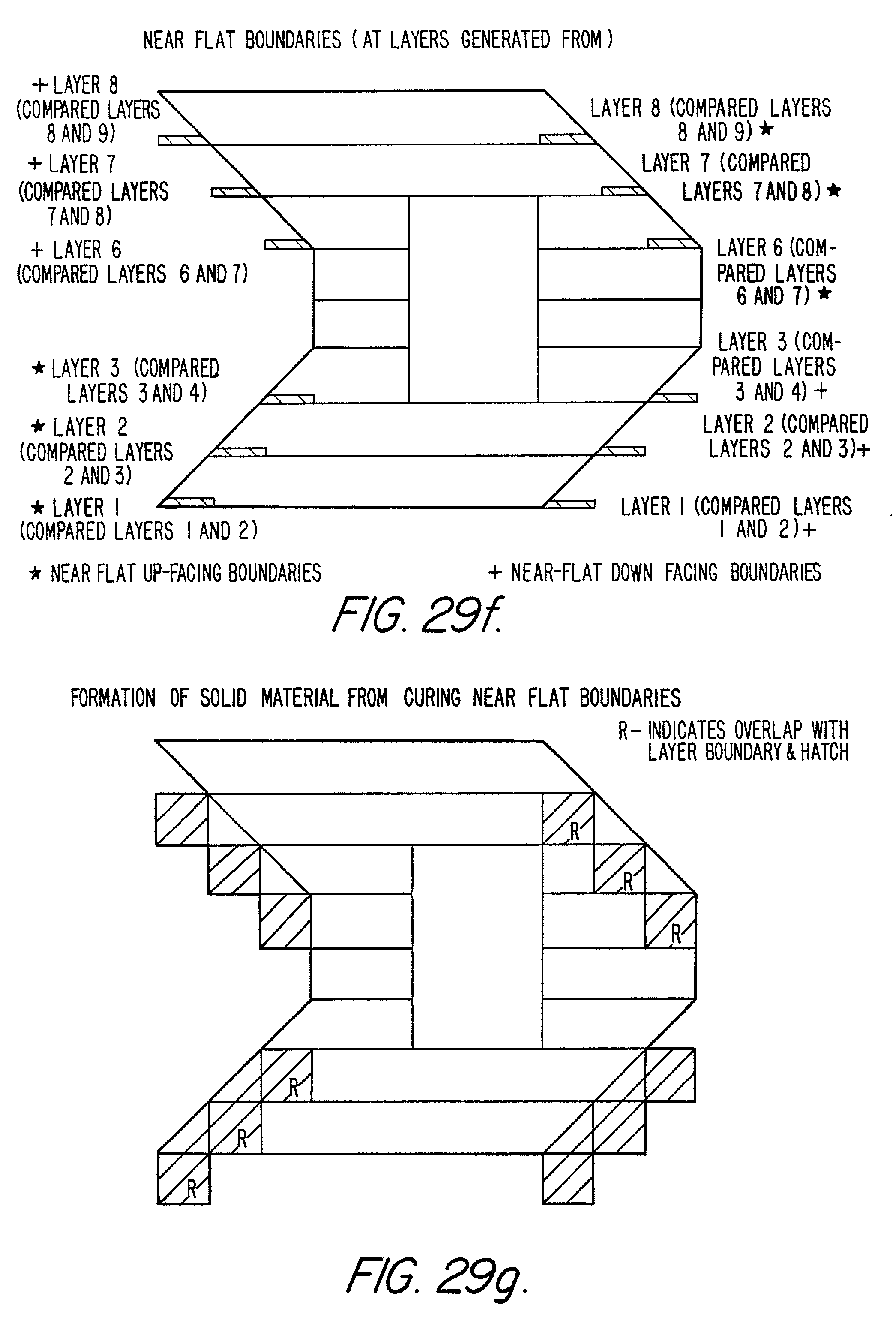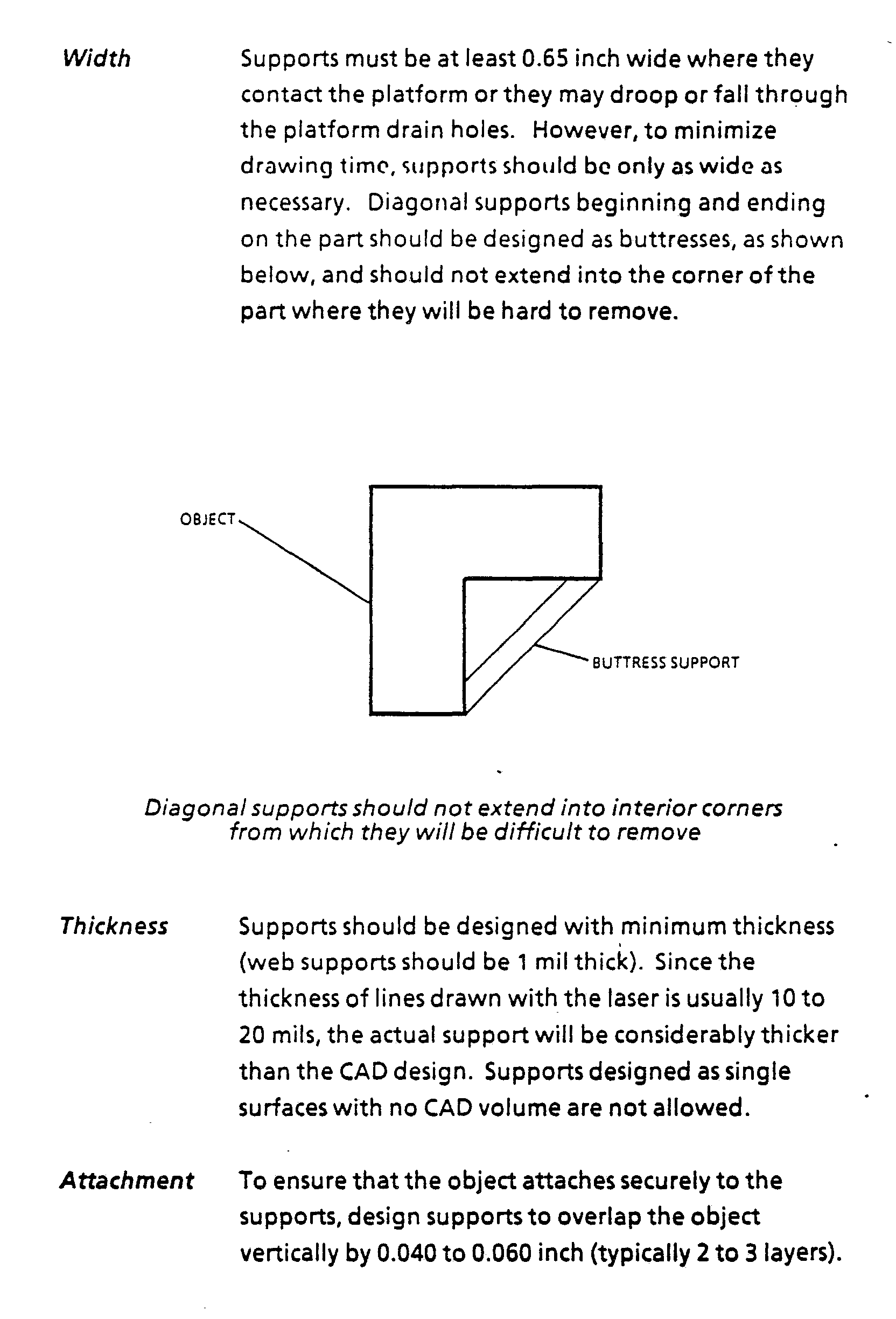 A fourth benefit is that web supports will be built on the platform at the time when the part is being built. Each layer of the part is cured by first curing its border vectors, followed by its hatch or skin fill vectors. In curing the polymer at the border, a problem called birdnesting may arise. Birdnesting is a distortion that occurs when cured polymer representing a border of a layer is cured and left free-floating in the resin. The distortion results through the delay in the drawing of hatch and skin fill vectors, which will provide structure to the border. By the time the hatch or skin fill vectors are drawn, the border may have moved due to movement of the liquid polymer in which it is floating. Birdnesting is discussed in more detail in related co-pending U. S. Patent Application S.N. 183,015, which, as indicated at the outset, is herein incorporated by reference as though set forth in full herein.