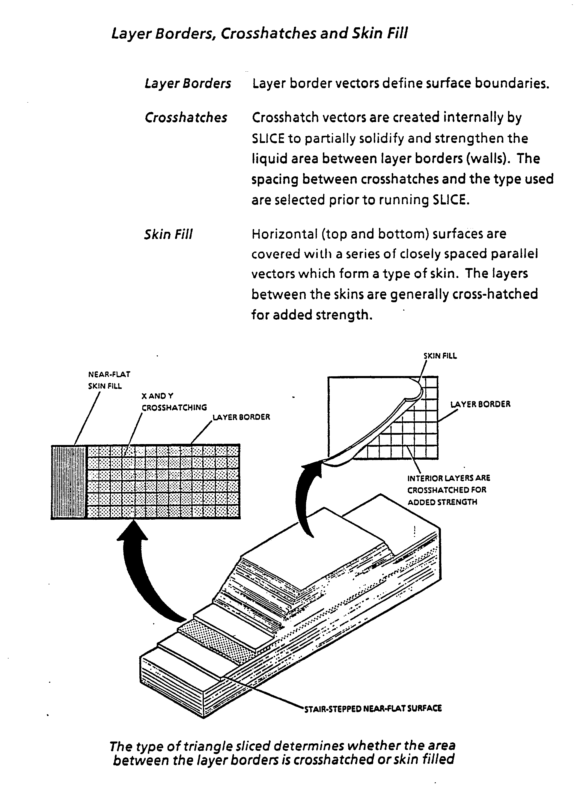 The stereolithographic unit (SLA) next calculates the section boundary, hatch, and horizontal surface (skin) vectors. Hatch vectors consist of cross-hatching between the boundary vectors. Several "styles" or slicing formats are available. Skin vectors, which are traced at high speed and with a large overlap, form the outside horizontal surfaces of the object. Interior horizontal areas, those within top and bottom skins, are not filled in other than by cross-hatch vectors.