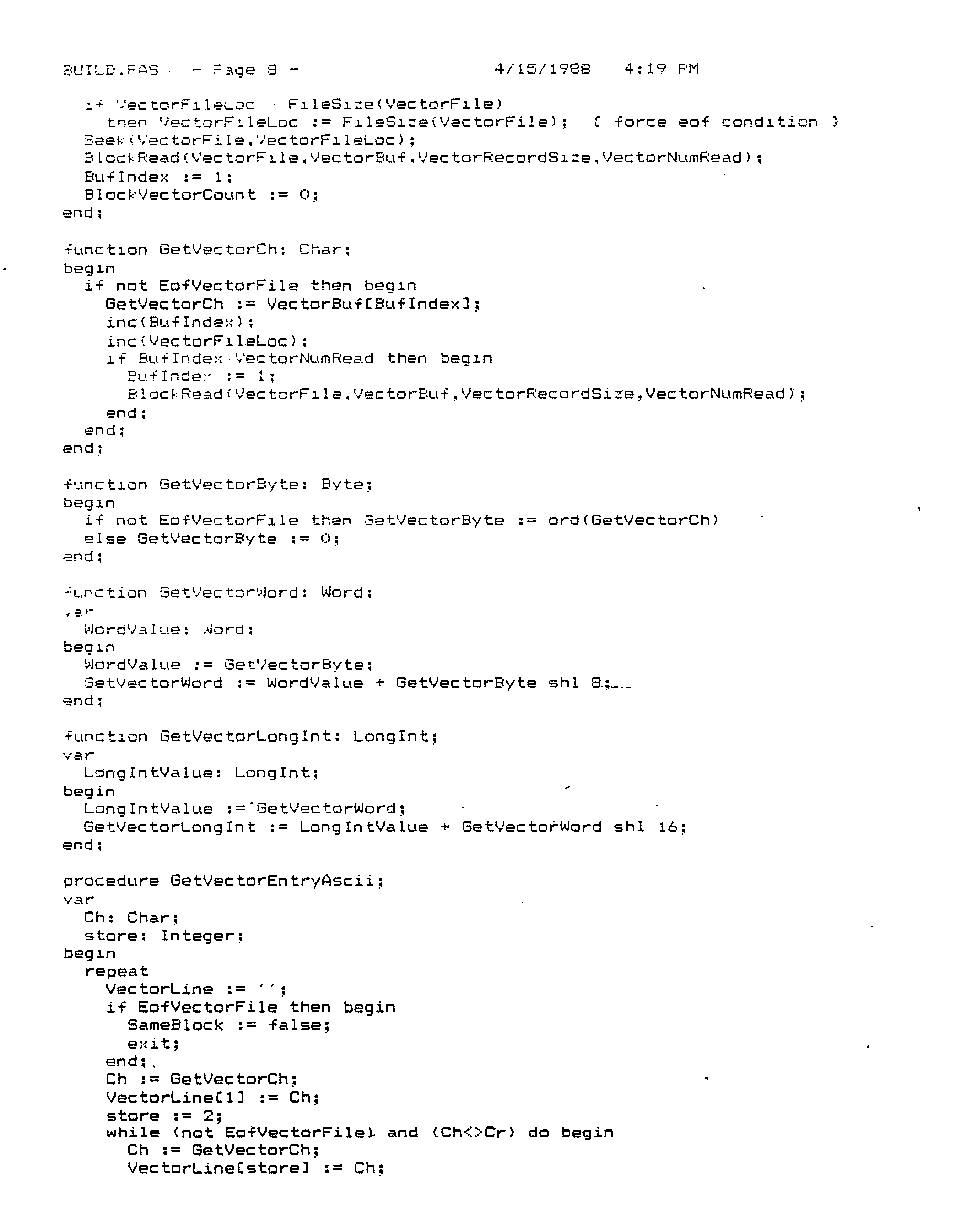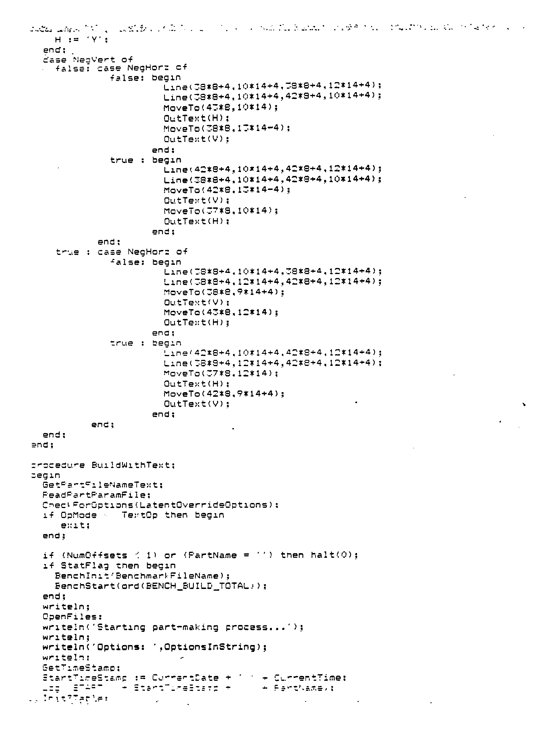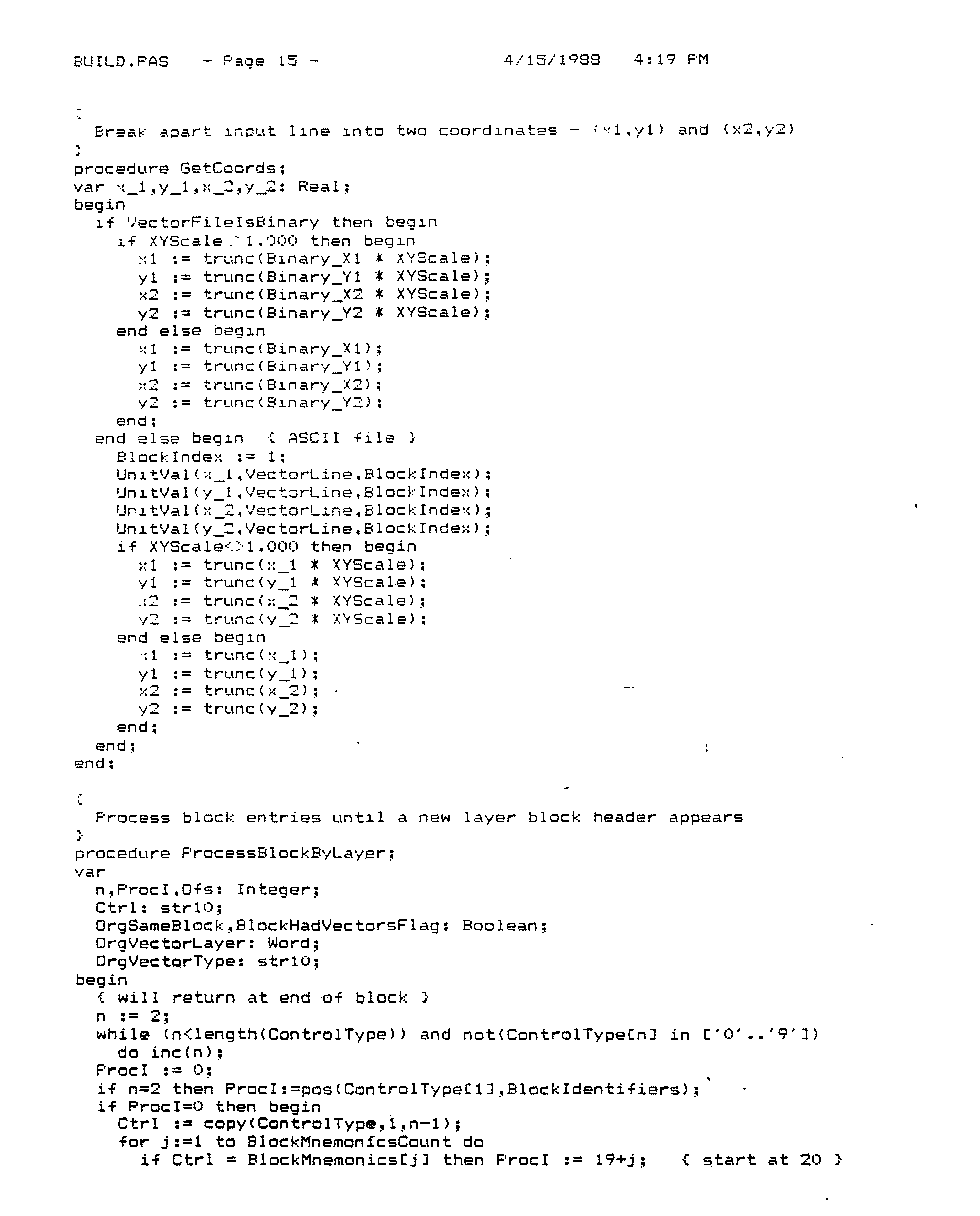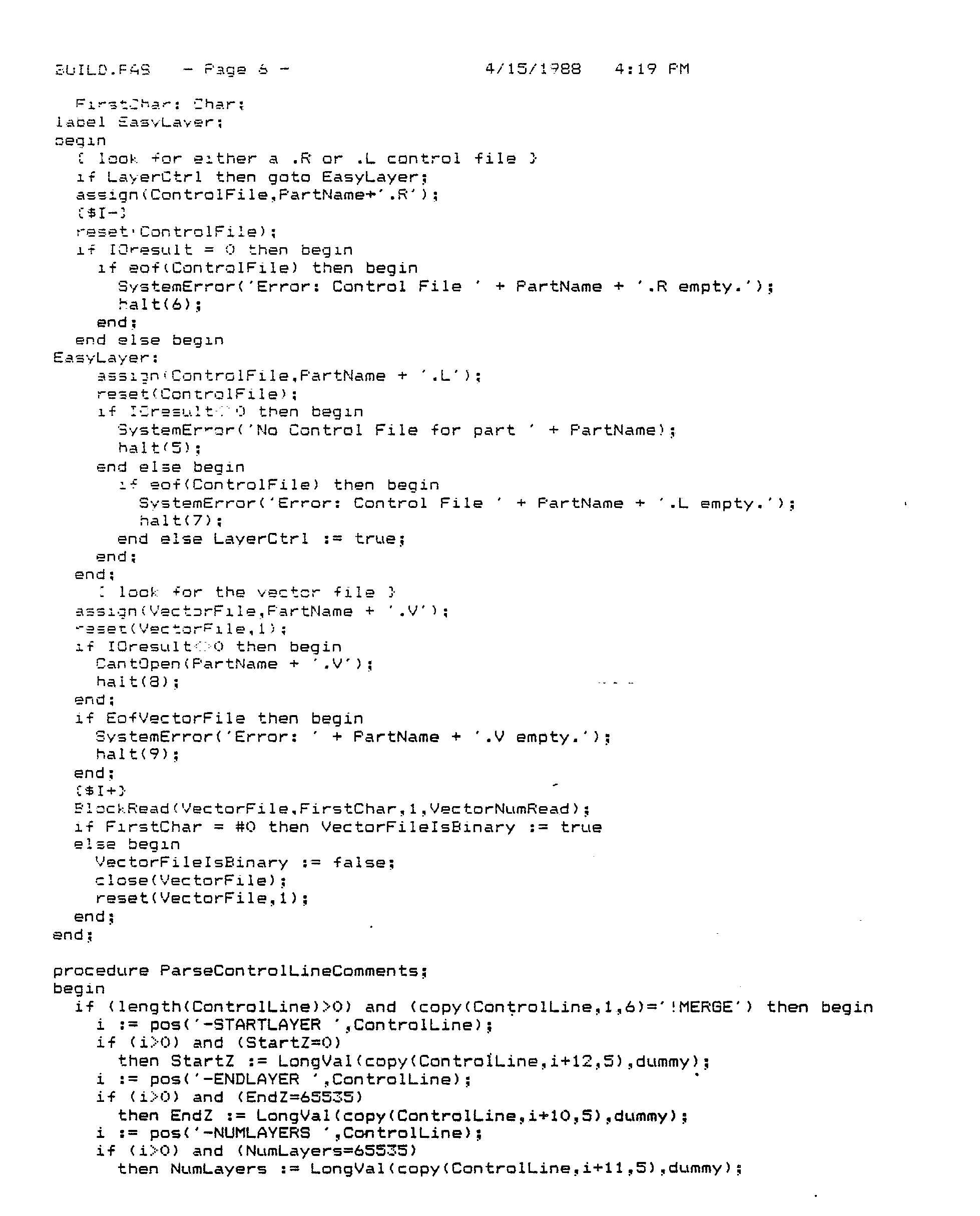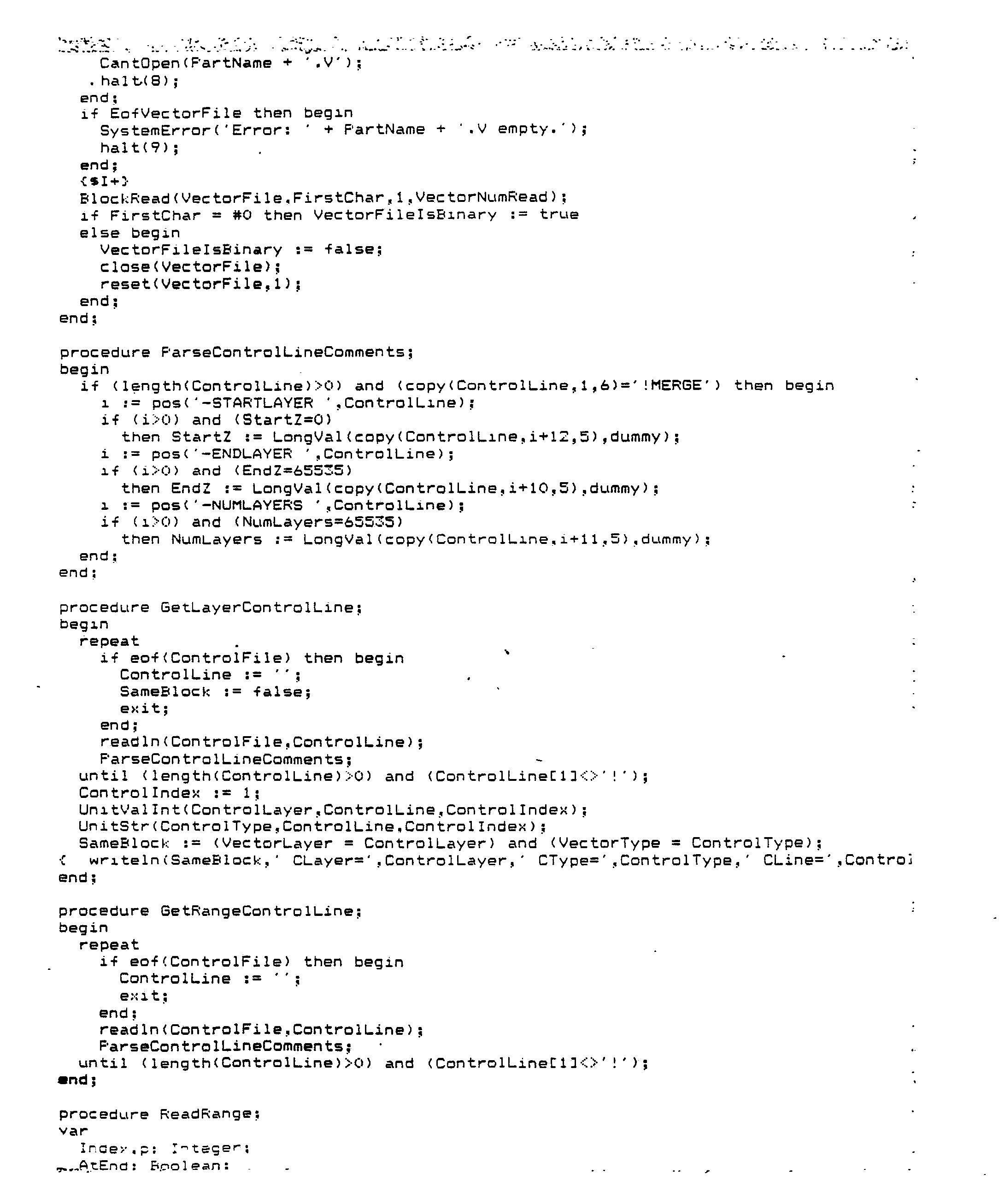 In substep 640, overlapping border vectors are combined, and point vectors are removed. This substep is performed because it allows small vectors to be attached to longer vectors thereby removing some of the improper offsetting that results from limiting endpoint offsetting when the only fear of crossover exists instead of basing offset limiting what this step really does is attempt to line up vectors that changed directions due to integration. In addition, this substep represents a significant departure of SLICE version 3.20 from past versions of SLICE. Since it lays the ground work for implementing the improved offsetting algorithm based on crossover detect.
