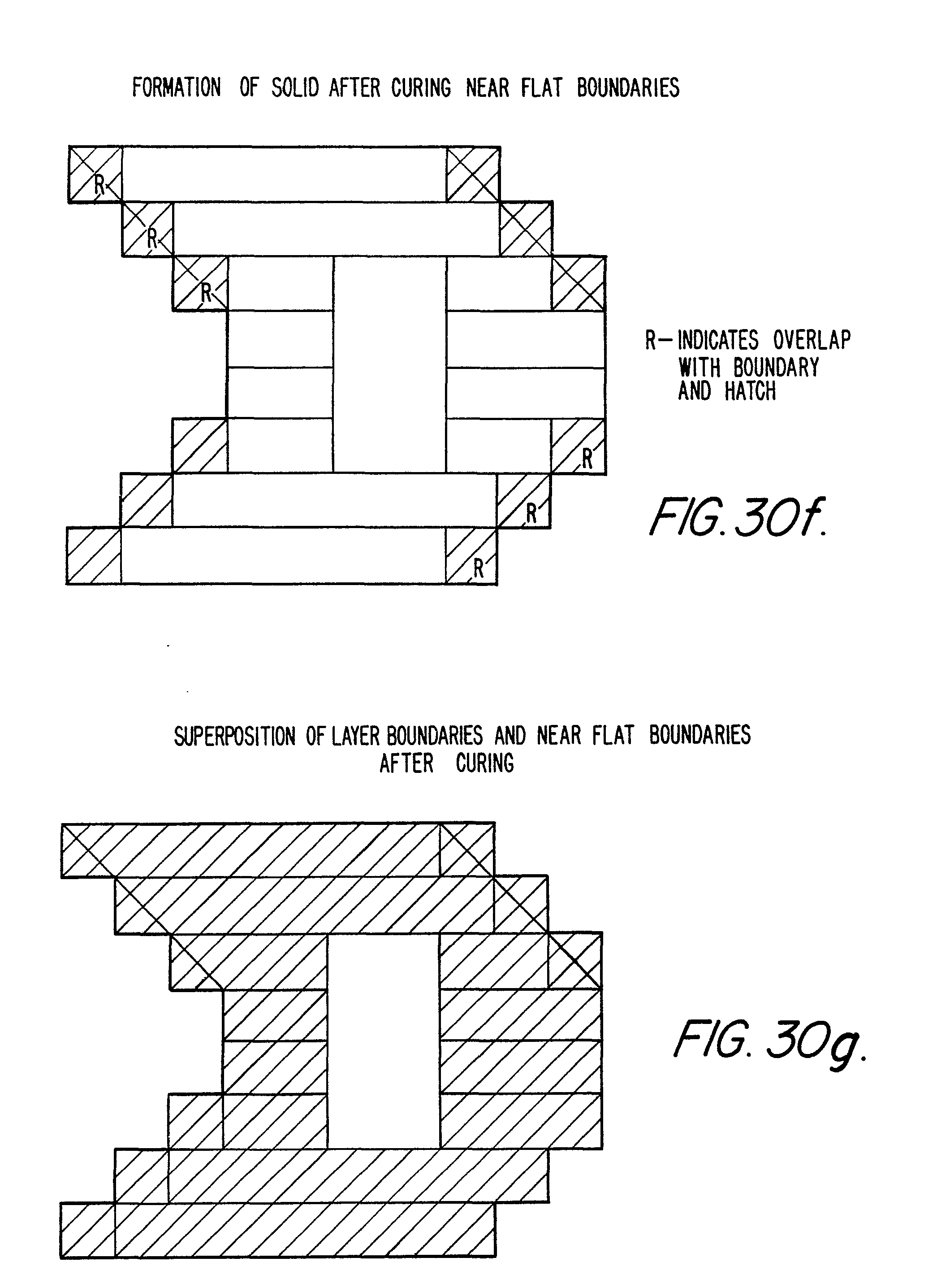 Another approach to solving the transition problem was to build parts with a solid wall thickness based on completely solidifying the material between two surface boundaries. This procedure experienced problems with distortion of parts and with relatively long exposure times required. This procedure provided good structural strength and produced better results in connection with the transition from vertical to horizontal features.