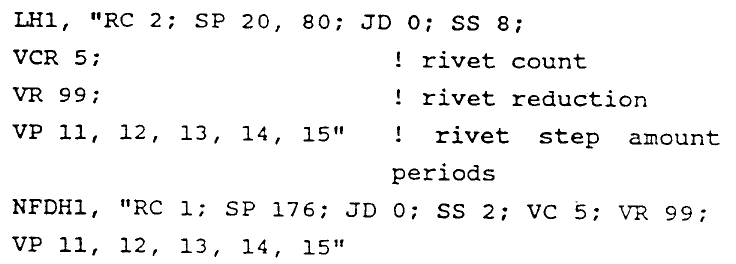 FIG. 32 shows an example of a .PRM file, entitled SUPER.RPM for illustrative purposes only. The .PRM file is described in greater detail in EP-A-0 354 637, and only the aspects of the example pertaining to default riveting parameters will be described here. First, the only default riveting parameters indicated are for the layer cross hatch vectors for the first object (described in the Figure by the mnemonic "LH1", which as per the table above, in earlier implementations, would have been described with the mnemonics "X", "Y" or "I", for X, Y, or 60/120 cross hatch, respectively) and for the near flat down facing skin vectors for the first object (described in the Figure with the mnemonic, "NFDH1," which, as per the table, would have been described in earlier implementations with the mnemonics "F", "G", and "K", for X, Y, or 60/120 cross hatch, respectively). The relevant portion of the file is reproduced below: