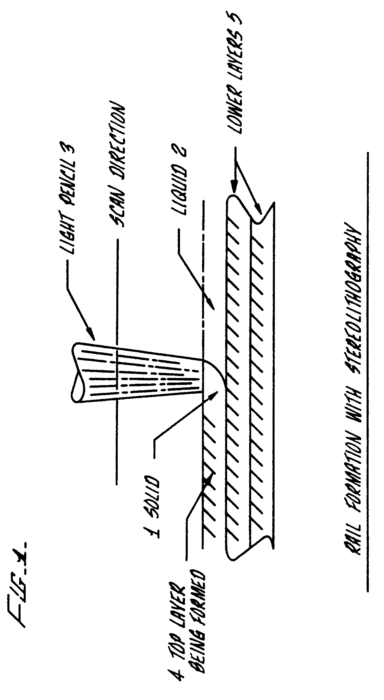 In one method of stereolithography a programmed movable spot beam of UV light shining on a surface or layer of UV curable liquid is used to form a solid cross-section of the object at the surface of the liquid. The object is then moved, in a programmed manner, away from the liquid surface by the thickness of one layer, and the next cross-section is then formed and adhered to the immediately preceding layer defining the object. This process is continued until the entire object is formed.