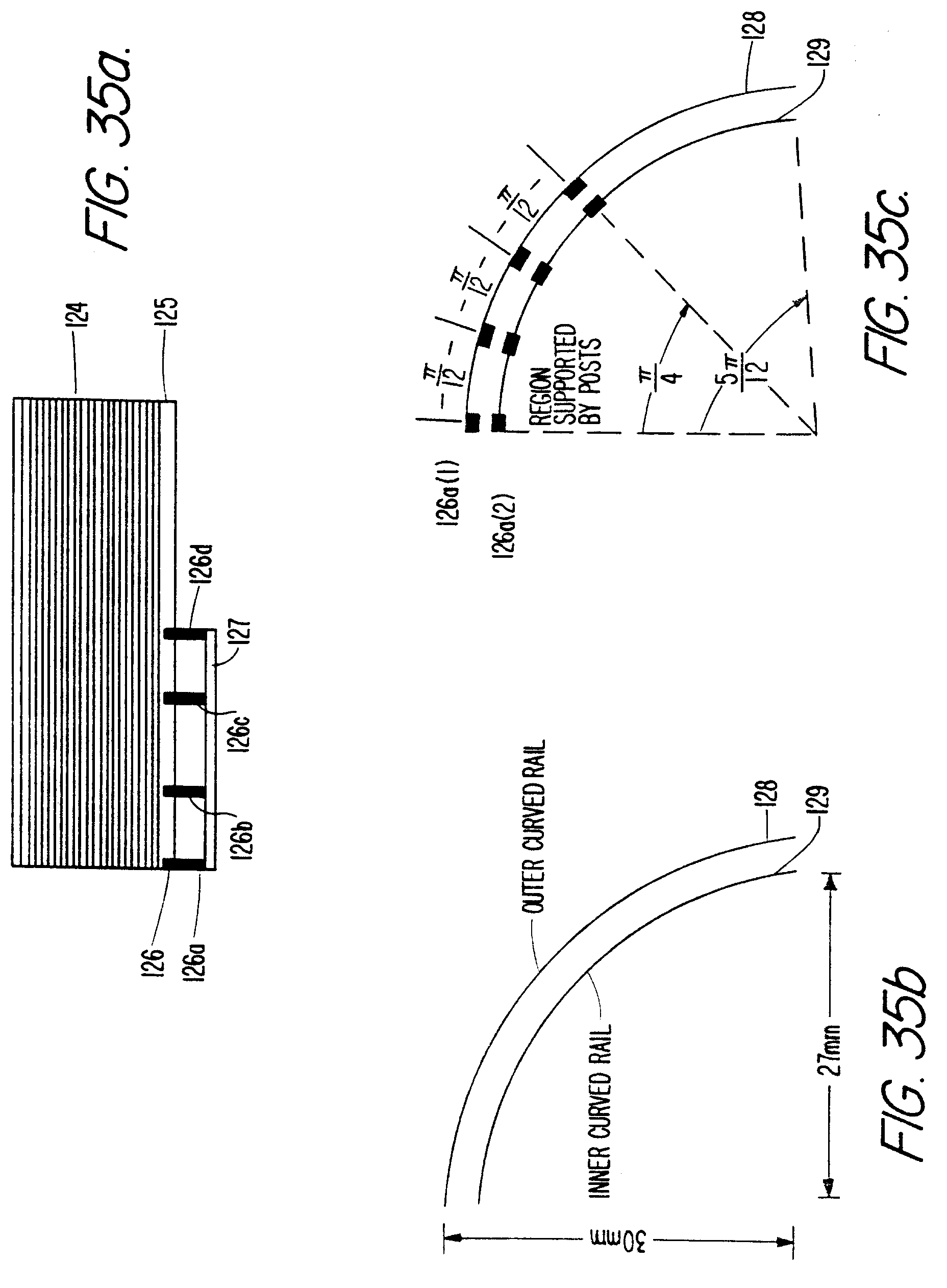 With reference to FIG. 35a, post layers 126 comprise post-pairs 126a, 126b, 126c, and 126d, and as illustrated in FIG. 35c, each post-pair advantageously comprises two posts. Post-pair 126a, for example, comprises posts 126a(1) and 126a(2), respectively. Also, as shown in FIG. 35(C), π/4 radians, a little over half, of the concentric arc is supported by posts, with each post pair advantageously uniformally spaced by π/12 radians along the supported portion of the arc.