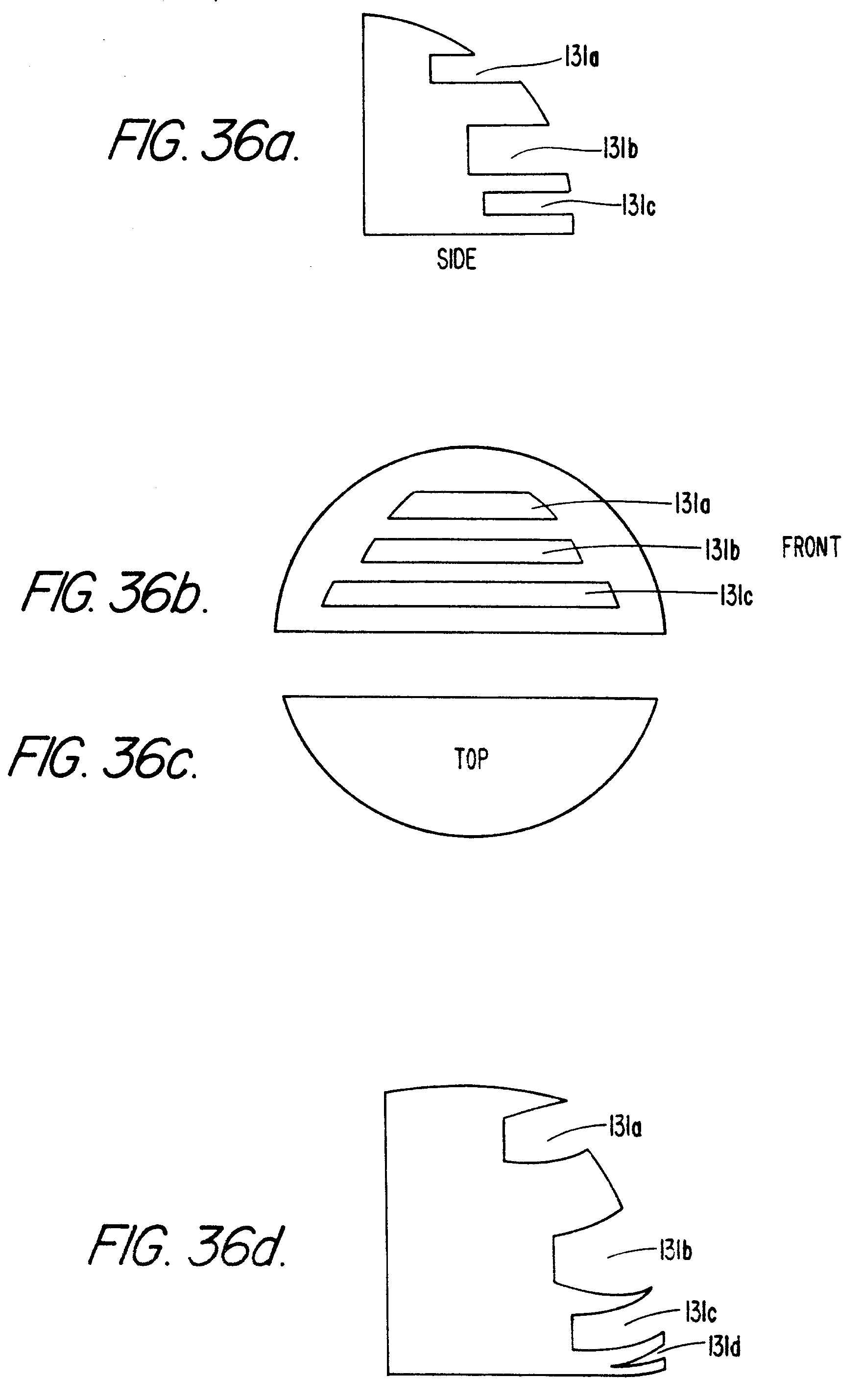 Sneer can be illustrated with the aid of FIGS. 36a-36c, respectively, which illustrates a side, front, and top view of a particular part having slotted sections 131a, 131b, and 131c. The effects of sneer are illustrated in FIG. 36d, which shows that the areas of the part at the outer radius distort more, and in some instances, shown at slot 131c in the Figure, the distortion is so great as to cause the solid portion of the part to split. This is indicated with reference numeral 131d in the Figure.