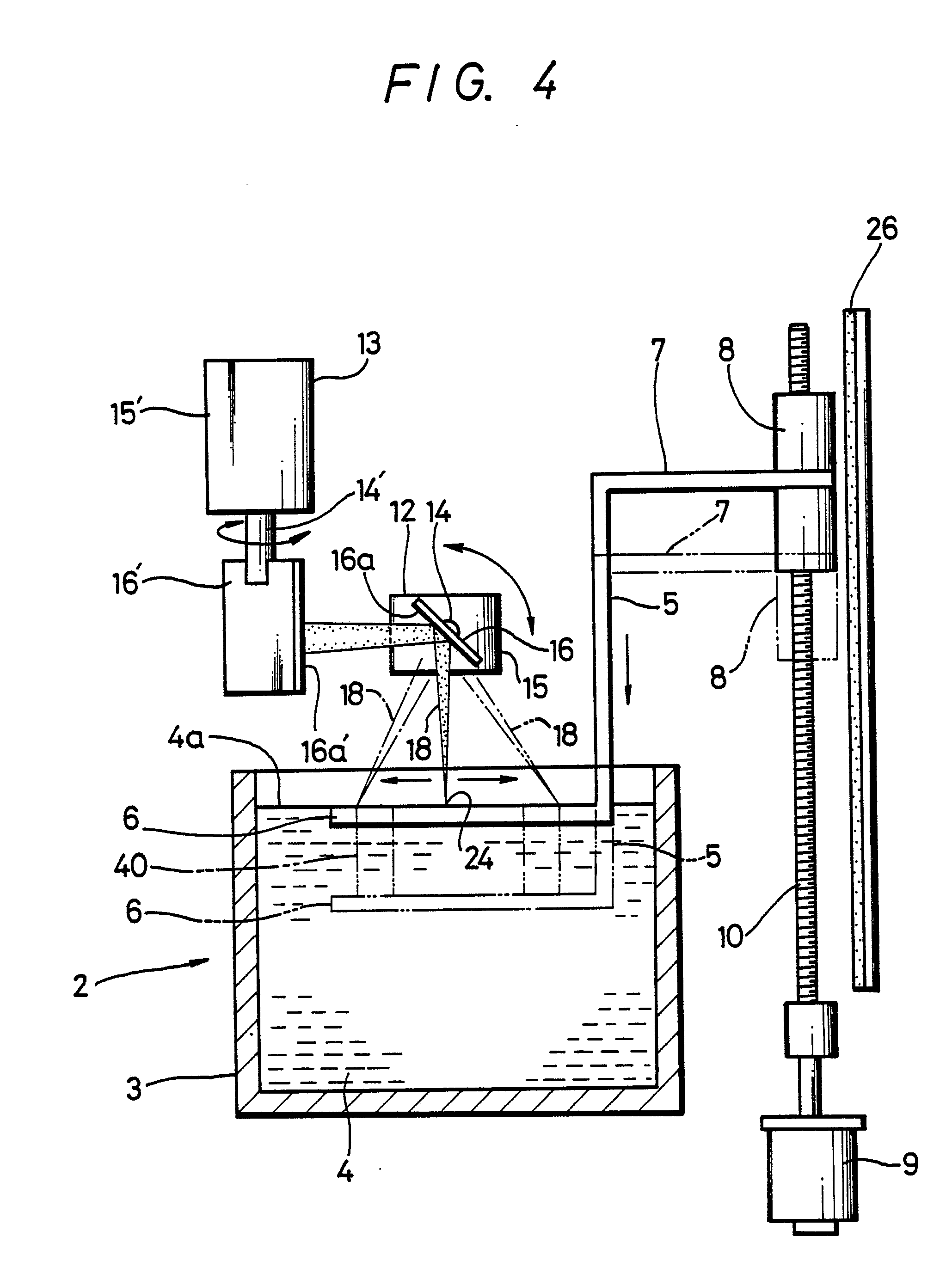 Referring to figures 3 and 4, the beam scanning section 11 includes a galvano scanner 12 which controllably deflects an exposure laser beam, emitted from a laser beam oscillator which will be explained later, in the left and right direction in figure 4 (this direction will hereinunder be referred to as the "first scanning direction") relative to a liquid surface 4a of the liquid photo-curable resin 4. Further, the beam scanning section 11 includes another galvano scanner 13 which deflects the exposure beam in the direction (this direction will hereinafter be referred to as "second scanning direction") perpendicular to the first scanning direction. These galvano scanners 12 and 13 are comprised of drive sections 15, 15′ having rotary shafts 14, 14′ rotatable around their axes at high speed and galvano mirrors 16, 16′ secured to the rotary shafts 14, 14′.