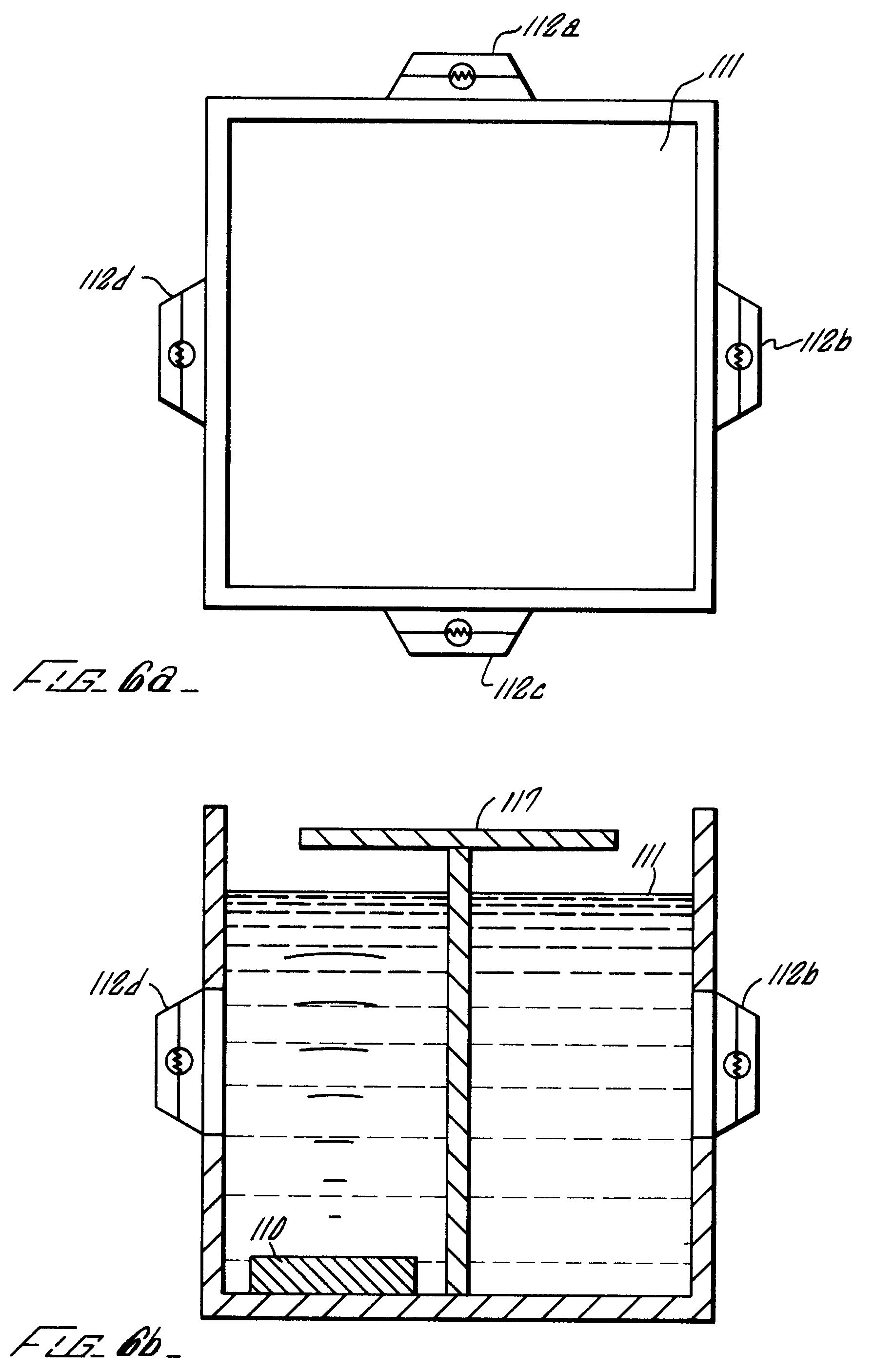 Other embodiments of the subject invention are possible. FIGs. 6a and 6b illustrate a single chamber vat into which is placed resin layer 111 floating on a volume of intermediate liquid. FIG. 6a shows a top view where the vat is equipped with a pluralility of spaced, UV flood lamps 112a, 112b, 112c, and 112d. FIG. 6b shows a side view of the vat, which is equipped with platform 117 situated in the same chamber as UV flood lamps 112 and ultrasonic transducer 110. Part building and part cleaning take place as described earlier with the two chamber vat embodiment. However, before post-curing can take place, the resin layer should be pumped off or scooped away by a pump or scoop (not shown), or alternatively, a hinged shutter (not shown) can be added, which shutter is situated so that after the platform/part has been moved to a predetermined location for post-curing, the hinged shutter can be closed throughout post-curing to substantially block UV light emitted by the UV flood lamps from the resin layer.