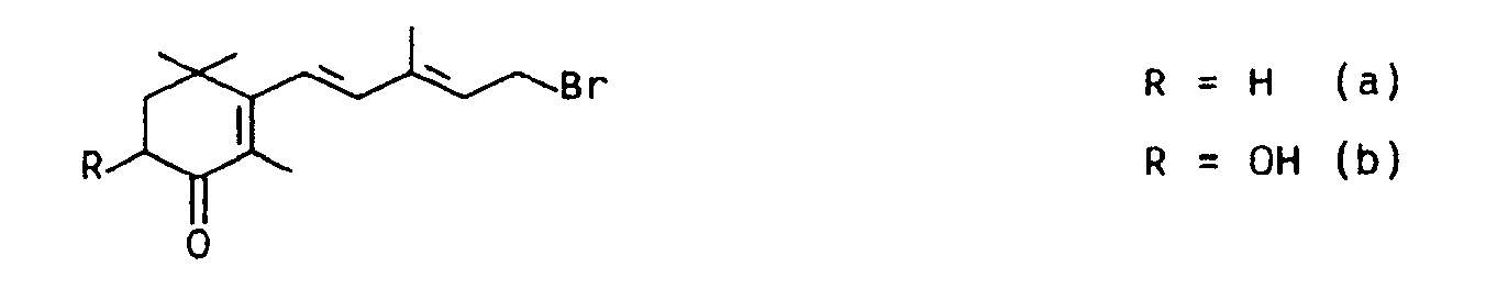 Die nach dem oben geschilderten Syntheseprinzip C₁₅+C₁₀+C₁₅ als C₁₅-Bausteine für Canthaxanthin bzw. Astaxanthin geeigneten Phosphoniumsalze werden hierbei durch Umsetzung der entsprechenden Allylbromide der Formel The appropriate according to the above-described synthetic principle C₁₅ C₁₀ + + C₁₅ as C₁₅ canthaxanthin or astaxanthin blocks for phosphonium salts are here by reacting the corresponding allyl bromides of the formula mit Triphenylphosphin hergestellt. made with triphenylphosphine. [0005] [0005]