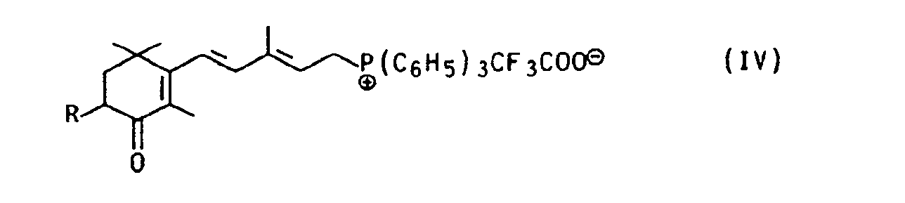 Aus den Phosphoniumsalzen der Formel IVa bzw. IVb erhält man durch Umsetzung mit dem C₁₀-Dialdehyd 2,7-Dimethyl-2,4,6-octatrien-1,8-dial unter den für solche Wittig-Kondensationen typischen Reaktionsbedingungen die Carotinoide Canthaxanthin Ia bzw. Astaxanthin Ib in guten Ausbeuten. From the phosphonium salts of formula IVa and IVb are obtained by reaction with the C₁₀-dialdehyde 2,7-dimethyl-2,4,6-octatriene-1,8-dial under typical for such Wittig condensation reaction conditions, the carotenoid canthaxanthin Ia Astaxanthin or Ib in good yields.
