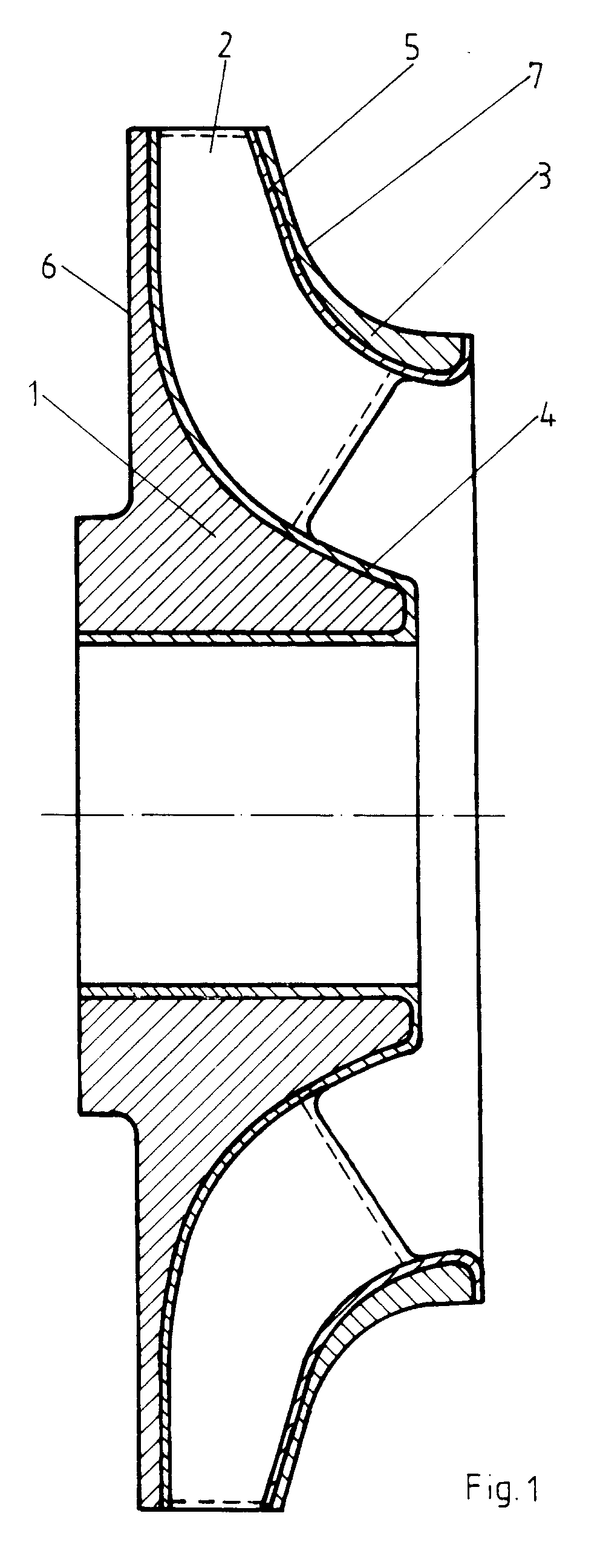 Das Modell besteht aus einer selbsttragenden, dünnen Schale 4, 5 aus lichthärtendem Polymer. The model consists of a self-supporting thin shell 4, 5 light-curing polymer. Diese Schale 4, 5 wird ohne Werkzeug mit Hilfe eines direkt über eine rechnergestützte Konstruktionszeichnung gesteuerten Laserstrahles durch Härten des flüssigen Polymers nach dem in der Beschreibungseinleitung erörterten, bekannten Verfahren der Stereolithographie hergestellt. This shell 4, 5, without tools using a directly through a computer-aided design drawing of the laser beam controlled by curing the liquid polymer discussed in the introduction according to the known method of stereolithography produced. Dabei bildet das Schalenteil 4 die äußere Form der Nabenscheibe 2 und das Schalenteil 5 die äußere Form der Deckscheibe 3. Diese von der Schale 4, 5 begrenzten Flächen sind formbestimmend und begrenzen in dem später gegossenen Laufrad den Strömungsquerschnitt. Here, the shell portion 4 forms the outer shape of the hub plate 2 and the shell portion 5, the outer shape of the cover disc 3. This. Of the shell 4, 5 bounded surfaces are in the form of determining and defining the later cast impeller the flow cross section