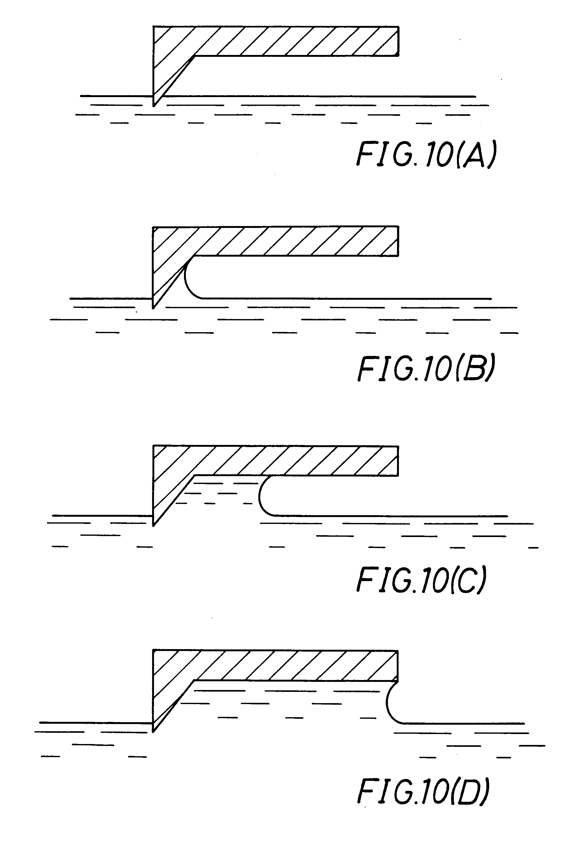 - FIGS. 8(A) and 8(B) illustrate the liquid storing effect of the irregularities of the lower surface of the recoater;