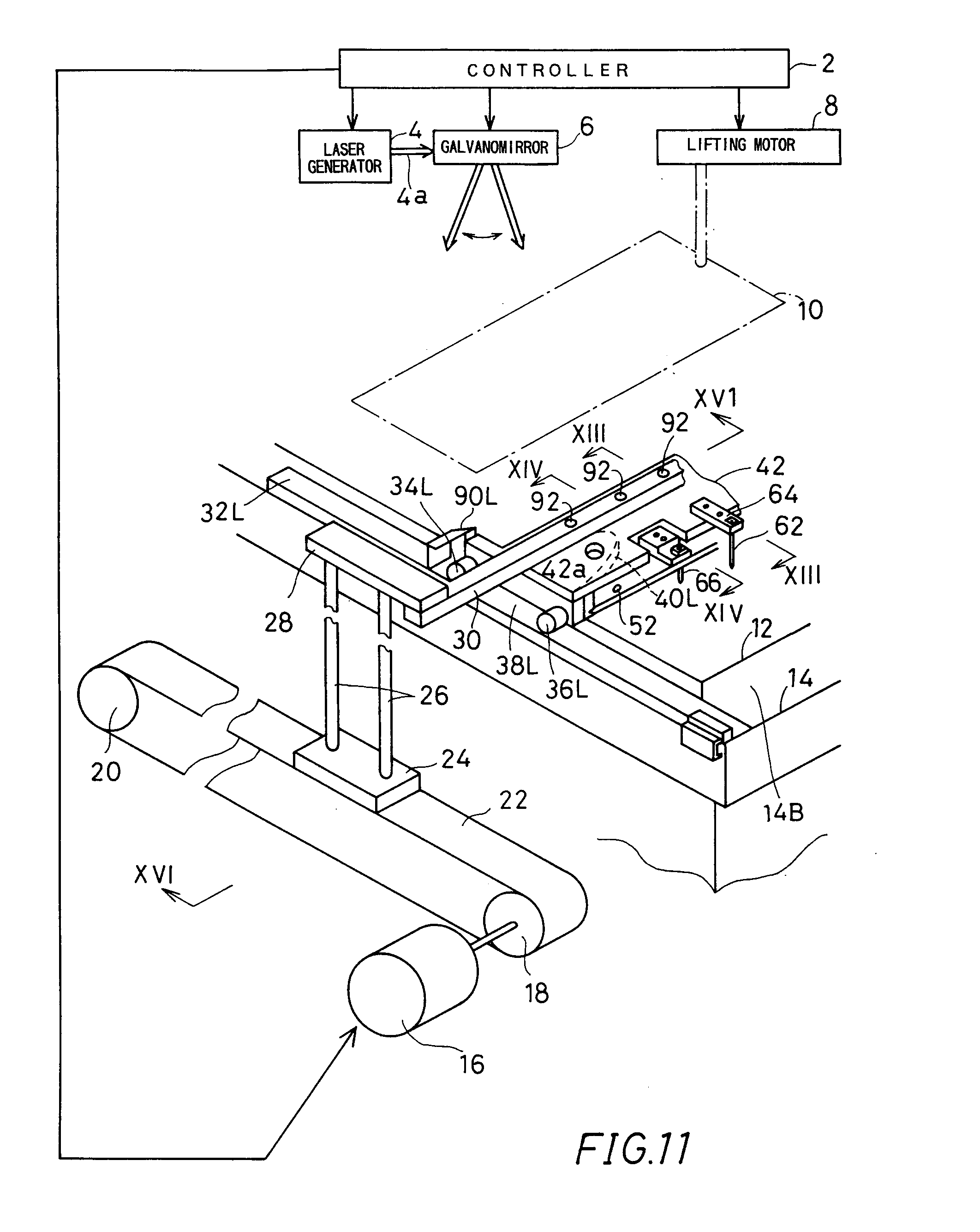 A lower plate 44 is suspended under the plate 42. Specifically, it is suspended by bolts 48 threaded in threaded holes 44a of the lower plate 44. Compression springs 50 are interposed between the flanges 40L and 40R and the lower plate 44. Thus, the lower plate 44 is urged downwardly, and can be raised upwardly by fastening the bolts 48 therein, while the lower plate 44 is lowered by unfastening the bolts 48. In other words, the lower plate 44 is vertically adjustable in relation to the carriages 38L and 38R and the plate 42 traveling along the guide rails 32L and 32R.