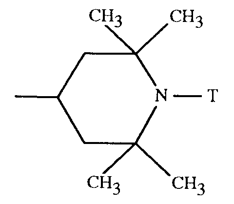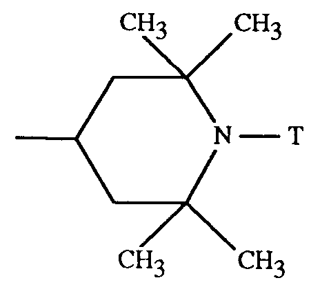 where T is hydrogen, oxyl, hydroxyl, alkyl of 1 to 12 carbon atoms, said alkyl substituted by at least one hydroxyl or lower alkoxy, benzyl or alkanoyl of 2 to 18 carbon atoms;