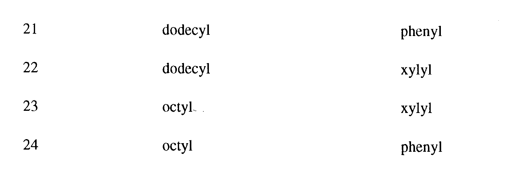 E.P. Application No. 483,488 claims the synergistic stabilizer composition comprised of a tris-aryl-s-triazine and a hindered amine and the method of stabilizing a polymer by incorporating such a composition. Again, the triazines claimed in the compositions are based on those described in U.S. Patent 3,268,474. The preferred triazines are bis-xylyl-resorcinol based s-triazines. The body of the application does show a Markush structure of a mono-resorcinol-tris-aryl based s-triazine that may be further substituted in the 5-position of the resorcinol ring with alkyl groups. However, no triazines with such further substitution on the resorcinol ring are prepared or tested.
