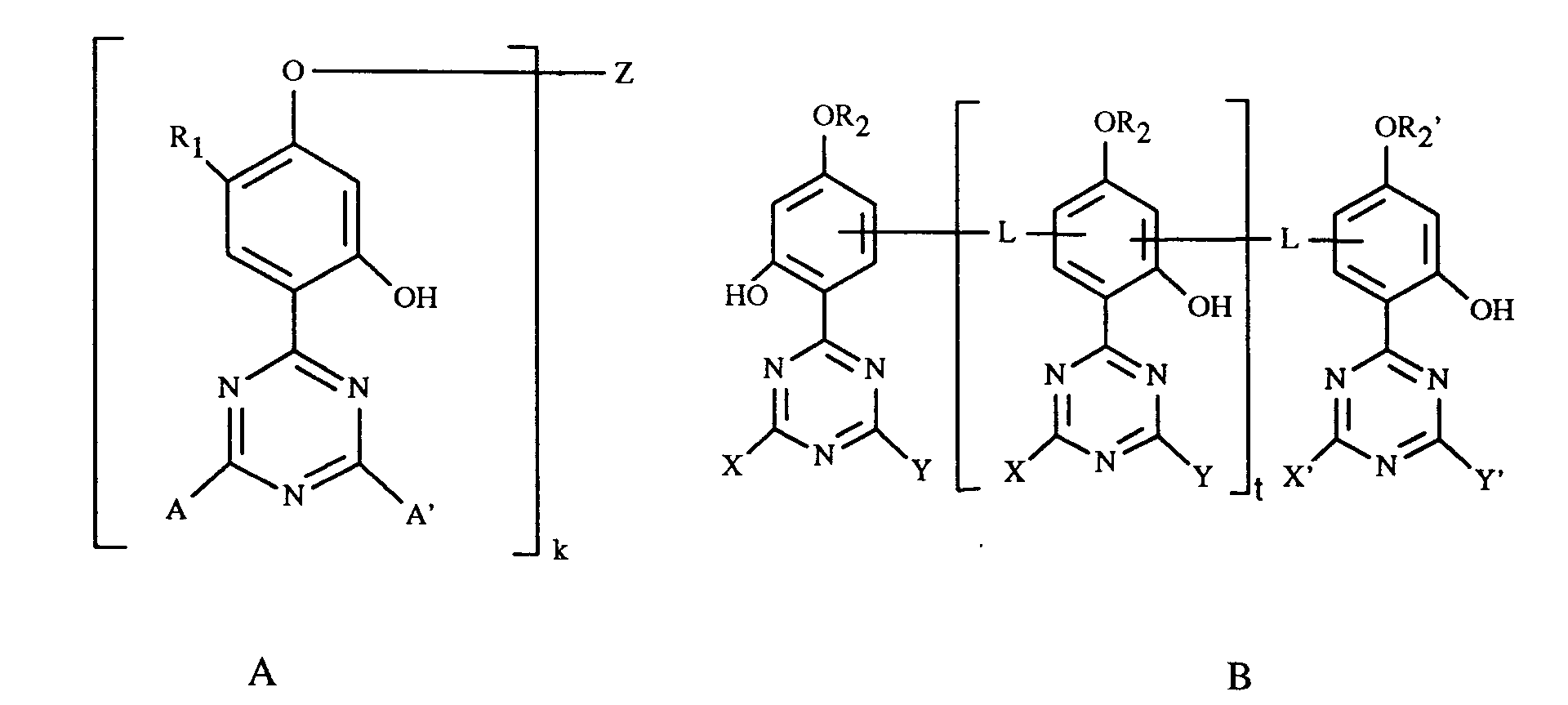 E.P. Application No. 468,921 claims aqueous dispersions of s-triazines with at least one anionic or non-ionic compound. The Markush structure in the claim section includes tris-aryl-s-triazines possibly having one resorcinol ring substituted by alkyl or halogen. The substitution pattern is not specified. The preferred triazines include mono-resorcinol-tris-aryl based s-triazines with no substitution on the resorcinol ring and are the only s-triazines exemplified. U.S. Patent No. 4,831,068 claims a process for stabilizing dyeings on polyester fiber materials with a s-triazine UV absorber and the polyester fiber material treated by such a process. The Markush structure and preferred triazines are the same as in E.P. Application No. 468,921. Again, only s-triazines of the preferred type are shown in the examples.