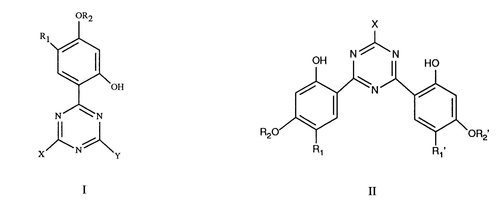 U.S. Patent No. 3,242,175 claims bis-resorcinol-tris-aryl-s-triazines with no substitution on the resorcinol rings. U.S. Patent No. 3,244,708 claims mono-, bis-, or tris-resorcinol-tris-aryl-s-triazines with no substitution on the resorcinol rings. A Markush structure in the introduction of the patent does refer to mono-resorcinol-tris-aryl-s-triazines that may be further substituted on the resorcinol ring by one or two or combinations of hydroxy, halogen, alkyl, alkoxy, phenyl, or phenylalkyl. Preferred substitution patterns are not mentioned and no such compounds are synthesized or tested.