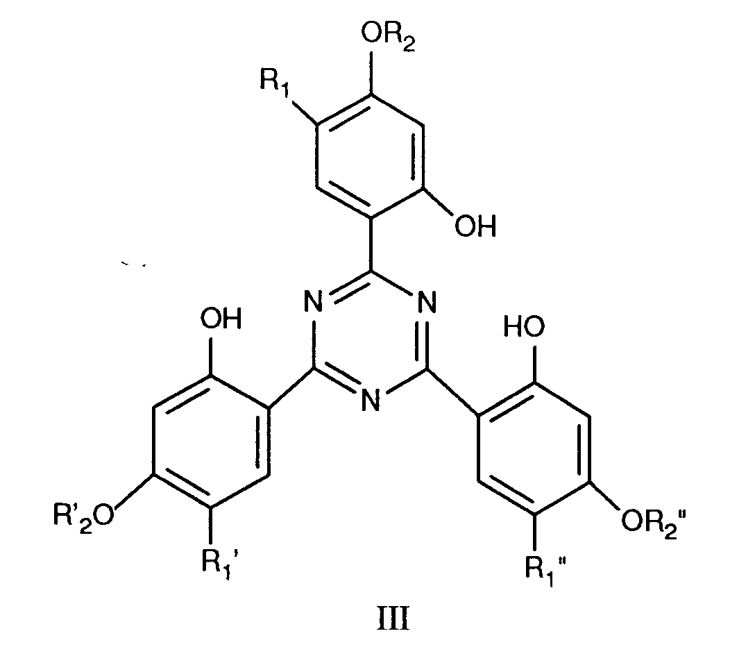 U.S. Patent No. 5,354,794 claims a polymer film composition which comprises an electro coat primer, a color coat in adhesion to the electro coat, a clear coat in adhesion to the color coat, and a tris-aryl-s-triazine UV absorber in either the color coat or clear coat or both. It is pointed out that a particular subgenus of tris-aryl-s-triazines, those based on bis- and tris-resorcinol-tris-aryl-s-triazines are especially effective in stabilizing such a coating system. A Markush structure in the composition claims describes bis- and tris-resorcinol-tris-aryl-s-triazines that may be substituted on the resorcinol rings by an alkyl of 1 to 6 carbon atoms. Specific substitution patterns are not discussed. An example of the preparation of 2,4,6-tris-(2,4-dihydroxy-5-hexylphenyl)-s-triazine is given, but this compound is not tested.