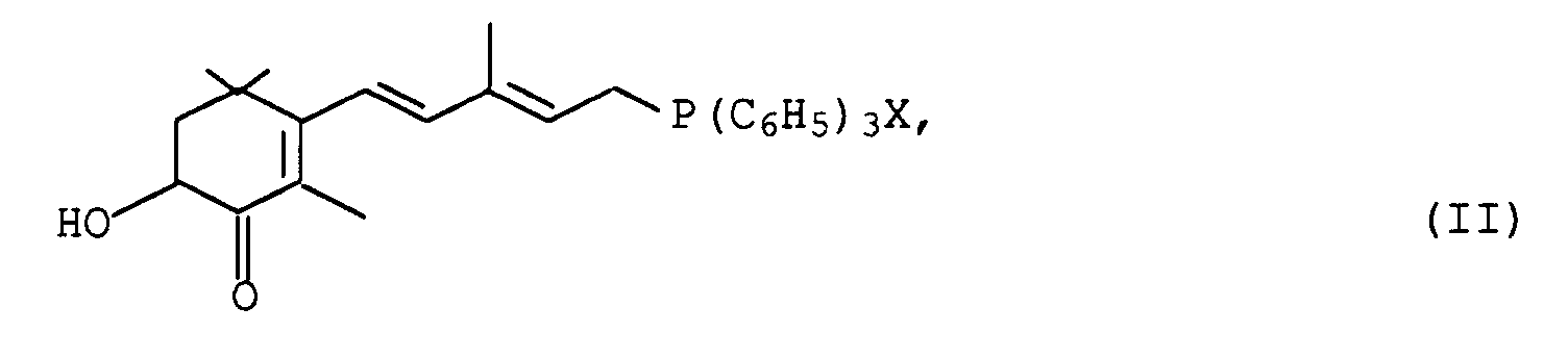 Gegenstand der Erfindung ist daher ein Verfahren zur Herstellung von Astaxanthin der Formel I The invention therefore provides a process for preparing astaxanthin of the formula I durch Umsetzen von 2 Mol des Triphenylphosphoniumsalzes der allgemeinen Formel II by reacting 2 mol of the triphenylphosphonium salt of the general formula II in der X für Chlor, Brom oder den (HSO 4 ) - -Rest, vorzugsweise für Bromsteht, in einer Wittig-Reaktion mit einem Mol des C 10 -Dialdehyds der Formel III in which X is chlorine, bromine or (HSO 4) - radical, preferably for Bromsteht, in a Wittig reaction with one mole of C 10 -Dialdehyds of the formula III das dadurch gekennzeichnet ist, daß man which is characterized in that - A. die Ausgangsverbindungen der Formeln II und III in Methanol, Ethanol oder einem Gemisch aus Methanol oder Ethanol mit Wasser suspendiert, die Suspension auf Temperaturen von 30 bis 80°C, vorzugsweise 40 bis 60°C erwärmt bis sich eine homogene Lösung gebildet hat, A. has the starting compounds of formulas II and III suspended in methanol, ethanol or a mixture of methanol or ethanol with water, the suspension to temperatures of 30 ° to 80 ° C., preferably 40 to 60 ° C. until a homogeneous solution formed,