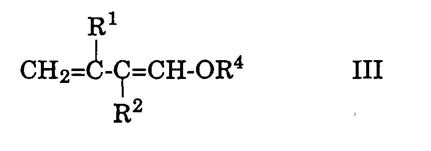 Auch das 1-Methoxy-2-methyl-1,3-butadien (der Formel III, worin R 1 Wasserstoff und R 2 und R 4 beide Methyl bedeuten) ist aus der Literatur [Japanische Patentpublikation (Kokai) 50891/1989] bekannt. Also, the 1-methoxy-2-methyl-1,3-butadiene (of formula III wherein R 1 is hydrogen and R 2 and R 4 are both methyl) is known from the literature [Japanese patent publication (Kokai) 50891/1989] known. Es kann beispielsweise analog der oben beschriebenen Herstellung von 1-Ethoxy-2-methyl-1,3-butadien ausgehend von Acetaldehyd-dimethylacetal und Methyl-(1-propenyl)-ether über das 1,1,3-Trimethoxy-2-methyl-butan hergestellt werden. It can for example analogously to the above-described preparation of 1-ethoxy-2-methyl-1,3-butadiene starting from acetaldehyde dimethyl acetal and methyl (1-propenyl) ether over the 1,1,3-trimethoxy-2-methyl butane are produced.