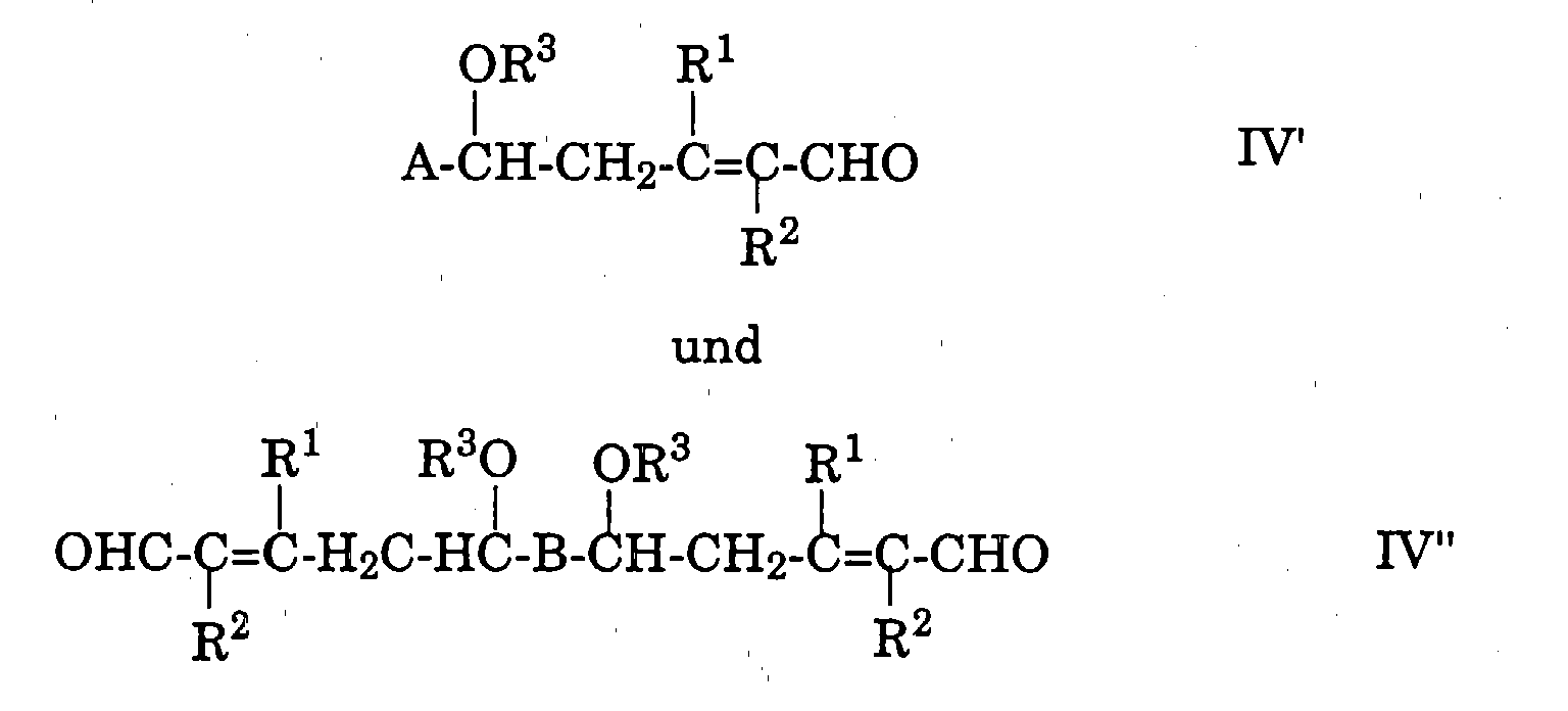 Wie oben erwähnt, besteht bei der Durchführung des erfindungsgemässen Verfahrens gegenüber dem Stande der Technik (insbesondere den obenerwähnten Arbeiten von Nazarov und Krasnaya, Makin sowie Chemla et al.) der Vorteil darin, dass ua die Telomerbildung weitgehend unterdrückt wird. As mentioned above, in carrying out the inventive method over the prior art (especially the aforementioned works of Nazarov and Krasnaya, Makin and Chemla et al.), The advantage is, inter alia, the telomer is largely suppressed. Obwohl bei dem erfindungsgemässen Verfahren die Telomerbildung als Folge der weiteren Reaktion der Verbindung der Formel IV' oder IV'' in Acetalform mit dem 1-Alkoxy-1,3-dien der Formel III nicht immer vollständig unterdrückt werden kann, ist dies schliesslich weit weniger gravierend als erwartet. Although in the process of this invention, the telomer as a result of the further reaction of the compound of formula IV 'or IV' 'in acetal form with the 1-alkoxy-1,3-dien of the formula III can not always be completely suppressed, this is finally much less severe than expected. Die nach der zwischenstufigen Hydrolyse erfolgende Abspaltung des Alkohols R 3 OH von der Verbindung der Formel IV' bzw. IV'' kann nämlich ohne weiteres in Gegenwart eines in relativ kleiner Menge als Nebenprodukt mithergestellten Telomers, zB der Formel A-CH(OR 3 )-CH 2 -C(R 1 )=C(R 2 )-CH(OR 3 )-CH 2 -C(R 1 )=C(R 2 )-CHO bzw. The acceptance following the between-stage hydrolysis elimination of the alcohol R 3 OH from the compound of formula IV 'and IV' 'Namely readily in the presence of a relatively small amount mithergestellten as a byproduct telomere, for example, the formula A-CH (OR 3) -CH 2 -C (R 1) = C (R 2) -CH (OR 3) -CH 2 -C (R 1) = C (R 2) -CHO or OHC-(R 2 )C=(R 1 )CH 2 C-(R 3 O)HC-(R 2 )C=(R 1 )CH 2 C-(R 3 O)HC-B-CH(OR 3 )-CH 2 -C(R 1 )=C(R 2 )-CH(OR 3 )-CH 2 -C(R 1 )=C(R 2 )-CHO (jeweils einmalige weitere Reaktion), erfolgen, wobei unter den speziell angewandten Reaktionsbedingungen auch eine analoge Alkoholabspaltung von dem Telomer stattfindet. (Each unique further reaction) take place, wherein under the reaction conditions applied specifically takes place, an analogous elimination of alcohol from the telomere. Die letztere Abspaltung erfolgt jedoch unvollständig, indem praktisch nur der von der endständigen Aldehydgruppe am nächsten gelegene Alkohol R 3 OH (δ-Alkoxy) abgespalten wird. The latter is, however, incomplete cleavage by practically only the closest of the terminal aldehyde alcohol R 3 OH (δ-alkoxy) is eliminated. Das Ergebnis dieser unvollständigen Alkoholabspaltung vom Telomer besteht darin, dass das erwünschte Produkt der Formel I' bzw. I'' vom in diesem Stadium vorliegenden Nebenprodukt viel leichter entfernt werden kann als wenn alle Alkoxygruppen OR 3 vom Telomer abgespalten würden. The result of this incomplete elimination of alcohol from the telomere is that the desired product of formula I 'or I' 'may be much more easily removed from the by-product present at this stage than if all alkoxy groups OR 3 were cleaved from the telomere. So bleibt nämlich das Nebenprodukt, welches noch einen oder mehrere Substituenten OR 3 aufweist, in der Mutterlauge des Reaktionsgemisches, während das erwünschte Produkt auskristallisiert und demzufolge leicht zu entfernen ist, zB durch Filtration. Namely, the by-product remains, which still exhibits one or more substituents OR 3, in the mother liquor of the reaction mixture, while the desired product crystallizes out and is therefore easy to remove, for example by filtration. Dass eben das Telomer nur den (jeweiligen) δ-ständigen Alkohol R 3 OH bei dem Abspaltungsschritt des erfindungsgemässen Verfahrens verliert, stellt ein völlig überraschendes Ergebnis dar. That just the telomere only the (respective) δ-standing alcohol R loses 3 OH at the cleavage step of the inventive process, represents a completely surprising result.