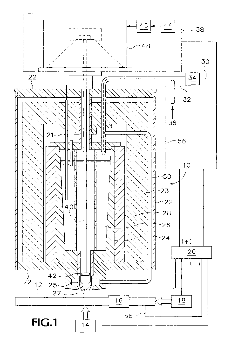 The ejection head 10 comprises a shell 22 having a hollow, tapered wall vessel 24 located in it which carries the liquid material 26 that will be ejected from the ejection head, in this case molten metal or another electrically conductive material. The vessel 24 is surrounded by a heater 28 that melts the material and keeps it liquid. An insulation material 23 is located between the heater and the shell. A nozzle 25 having an orifice 27 is located at the bottom of the vessel 24. Solid material is fed into the vessel through a feed supply line 32 by a motor 34. Pressurized inert gas 36 is also fed into the vessel through the feed supply line 32. An impulse generator 38 oscillates an impulse rod 40 having a plunger 42 at its lower extremity to eject elongate extrusions of molten metal out of the orifice of a desired size and at a desired frequency. The impulse generator comprises a pulse generator 44 whose signal is amplified by an amplifier 46 and fed to a loudspeaker 48 to move the impulse rod at the desired frequency. The pulse generator is controlled by the controller 20. Cool inert gas 36 is fed outside of the vessel through a line 50 and exhausted normal to the orifice. As explained in U.S. Patent No. 5,598,200, the amplitude and frequency of the impulse generator and the pressure of the inert gas on top of the vessel controls the size and shape of the extrusions that are ejected from the injector head.