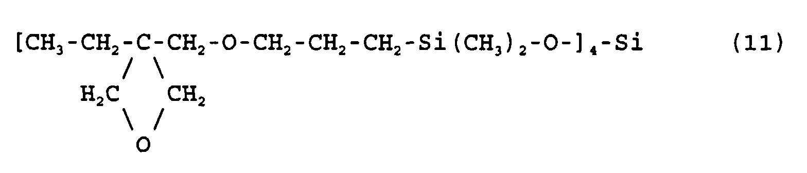 wherein R1 represents the same group as defined in the formula (2), R8 represents the same group as defined in the formula (7), R11 represents an alkyl group having from 1 to 4 carbon atoms such as a methyl group, ethyl group, propyl group, butyl group, or the like or a trialkylsilyl group, wherein the alkyl groups may be either the same or different and have from 3 to 12 carbon atoms, such as a trimethylsilyl group, triethylsilyl group, tripropylsilyl group, or tributylsilyl group, and z' is an integer from 1 to 10.These compounds having oxetane rings may be used either individually or in combinations of two or more.