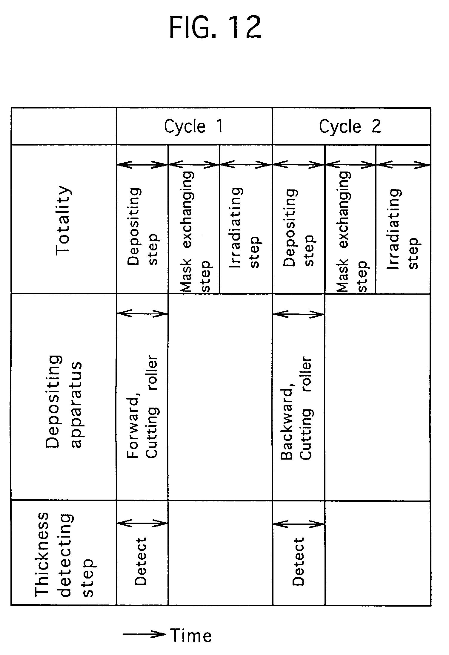 Figure 25 shows operational cycles in Example 6. As appreciated in Figure 25, between T0-T2, the controller executes a starting movement in which the laser beam M is returned to the starting point, and it lowers the lift table 1 and executes the depositing step by using the depositing apparatus 5. Further, between T0-T2, the controller withdraws the odd-numbered-mask 12odd from the station ST, and inserts the even-numbered-mask 12even into the station ST. Between T2-T6, the controller executes the irradiating step by using the even-numbered-mask 12even and by emitting the laser beam M from the laser oscillator 8, while executing the mask exchanging step of the odd-numbered-mask 12odd.
