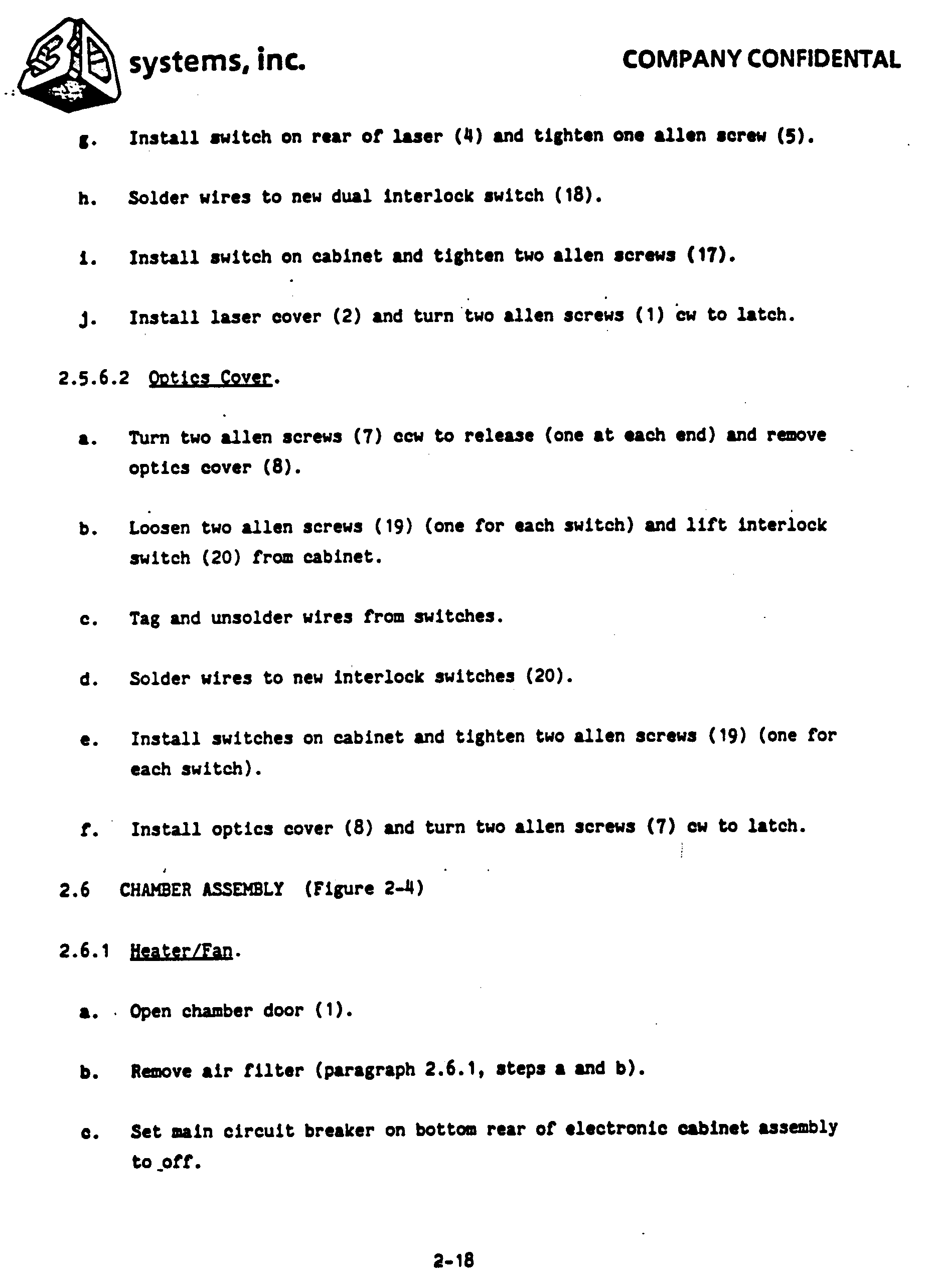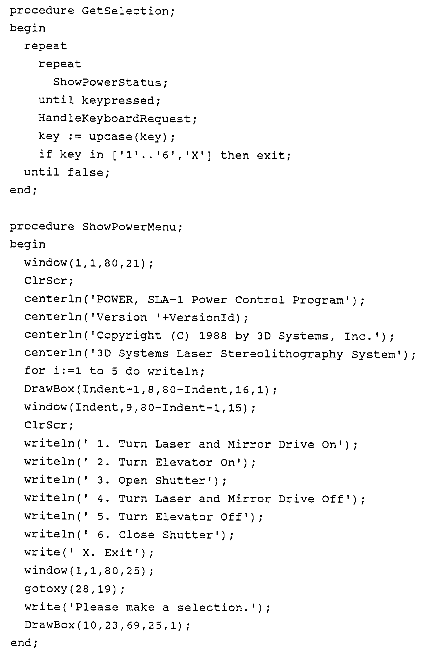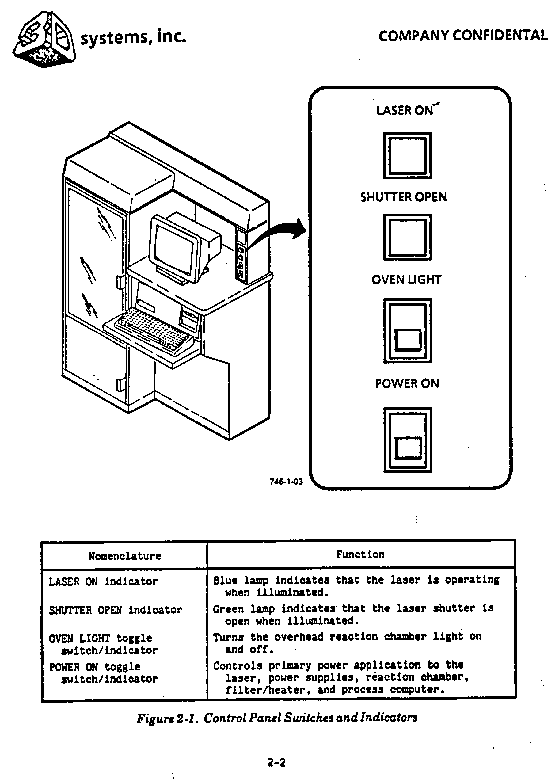 The electronic cabinet assembly includes the process computer, keyboard, monitor, power supplies, ac power distribution panel, and control panel. The computer assembly includes plug-in circuit boards for control of the terminal, high-speed scanner mirrors, and vertical (z-stage) elevator. Power supplies for the laser, dynamic mirrors, and elevator motor are mounted in the lower portion of the cabinet.