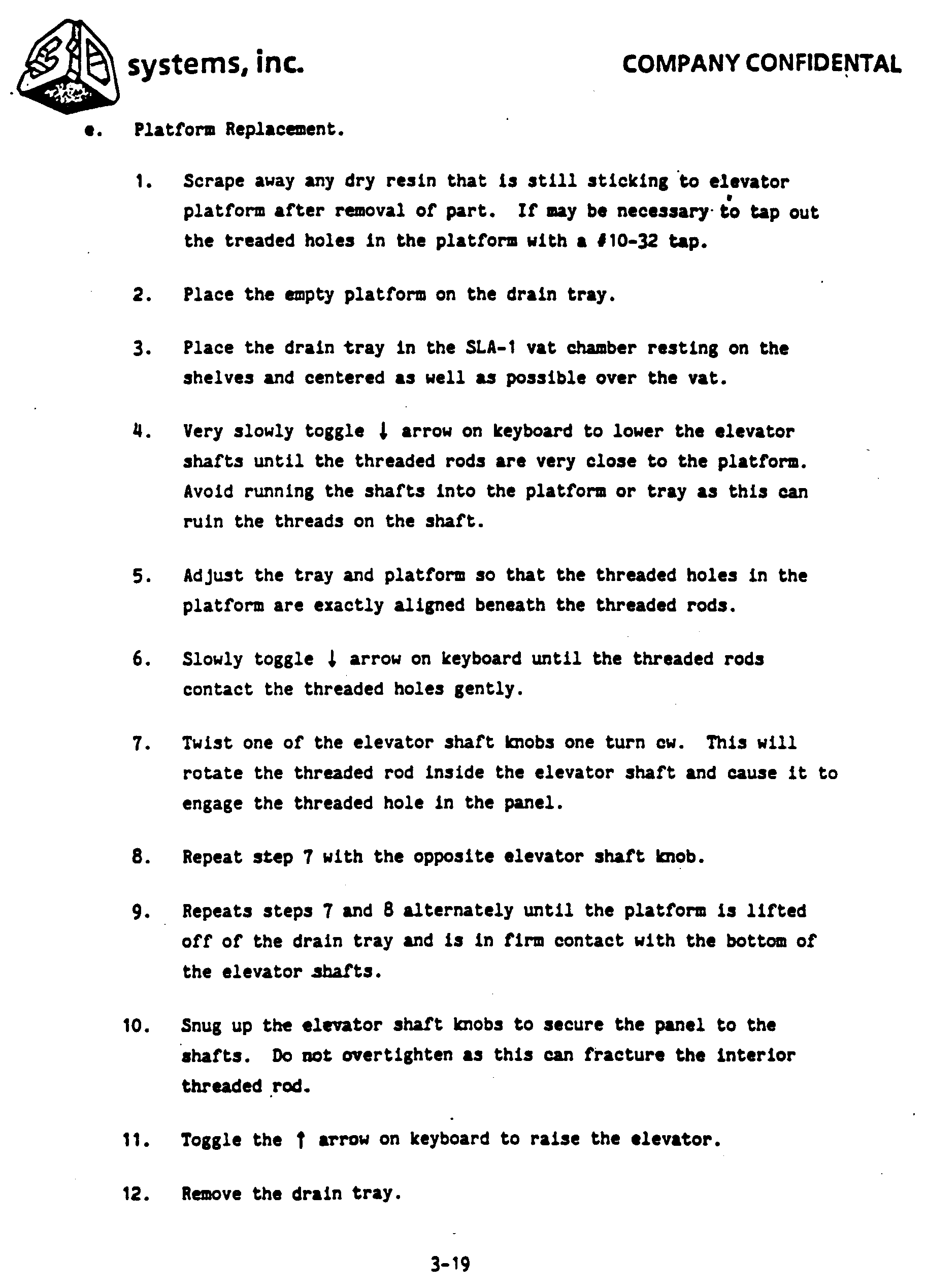 The object is formed on a platform attached to the vertical axis elevator, or Z-stage. The platform is immersed in the resin vat and it is adjusted incrementally downward while the object is being formed. To remove the formed part, it is raised to a position above the vat. The platform is then disconnected from the elevator and removed from the chamber for post processing. Handling trays are usually provided to catch dripping resin.
