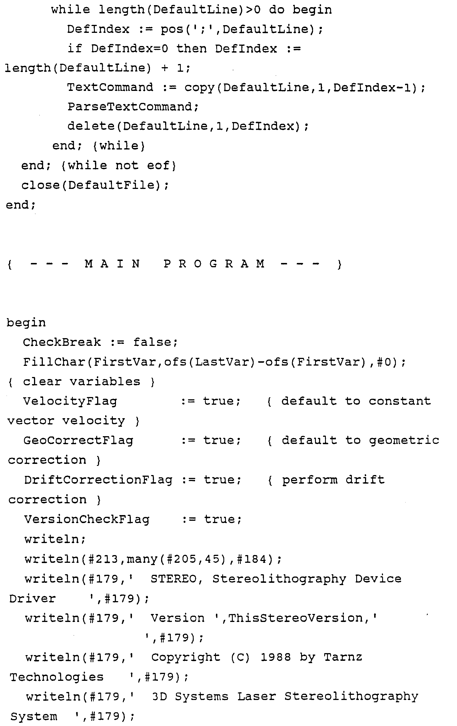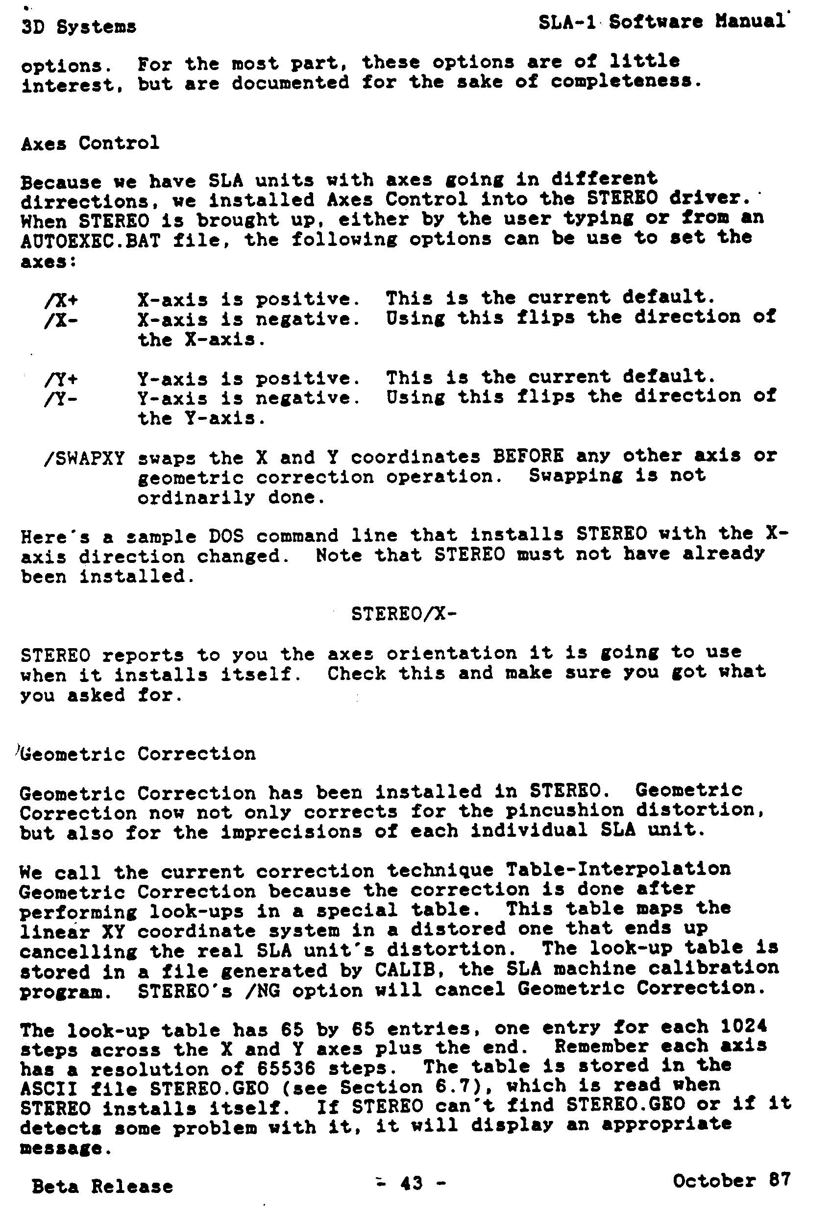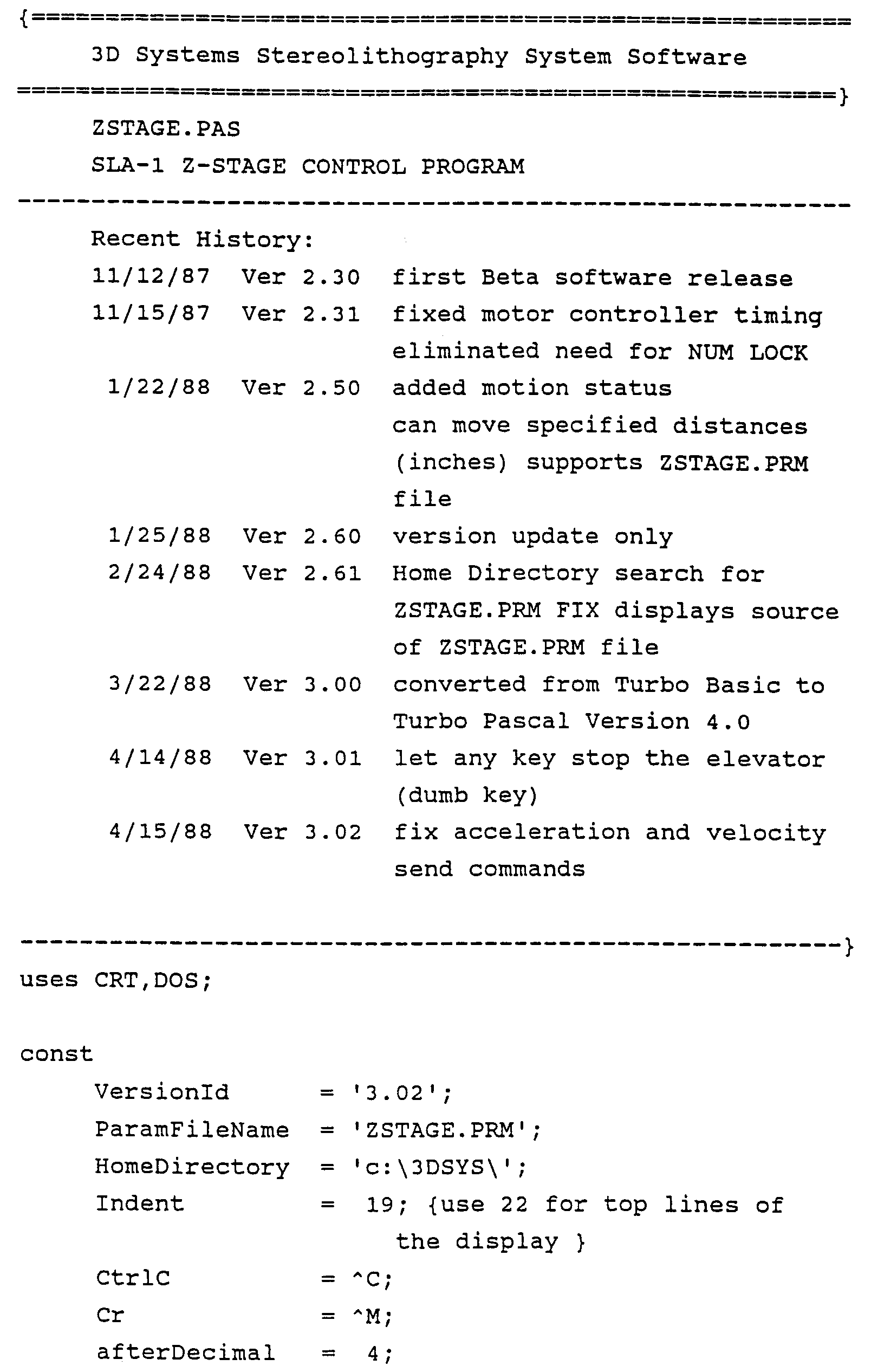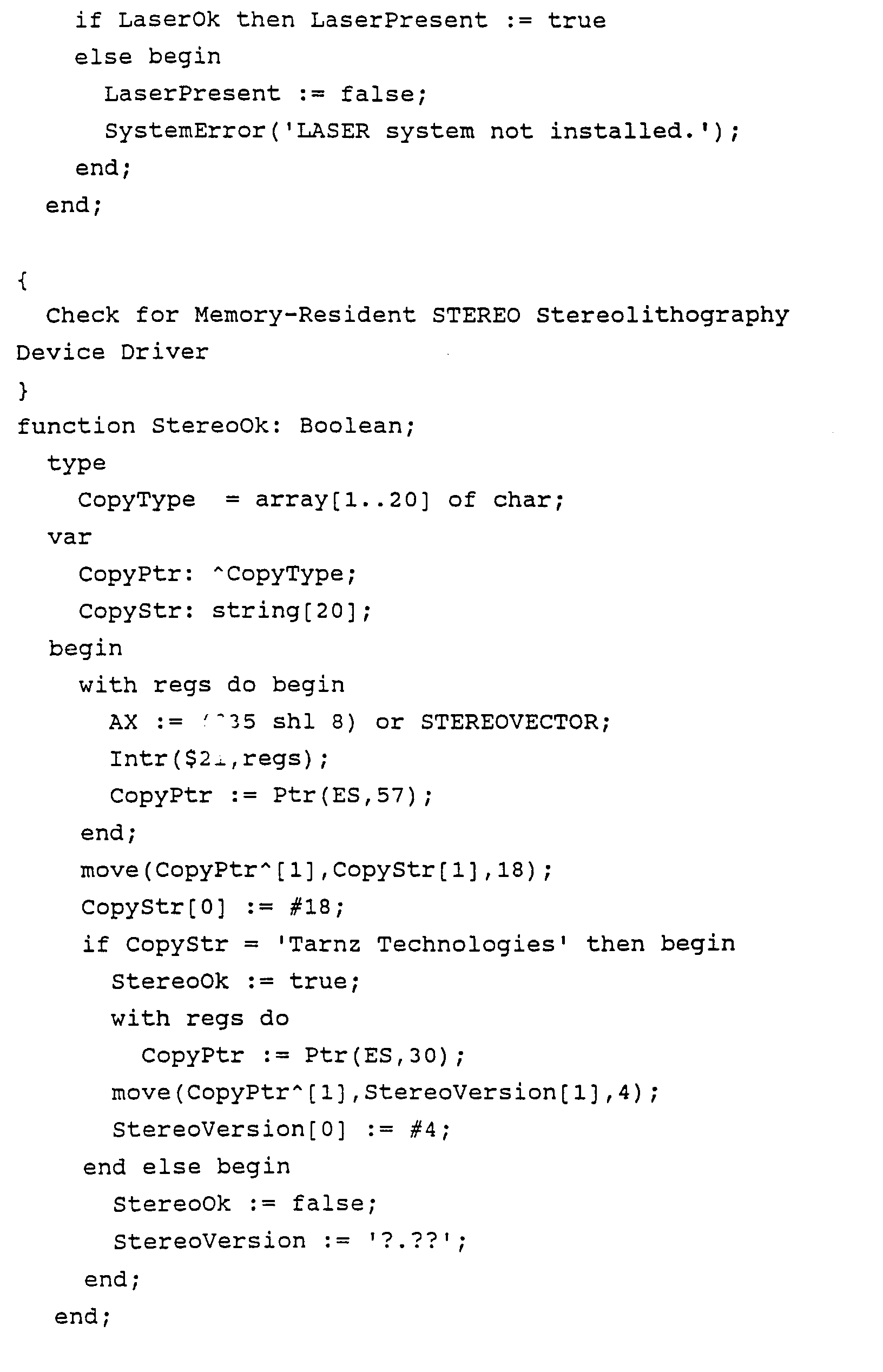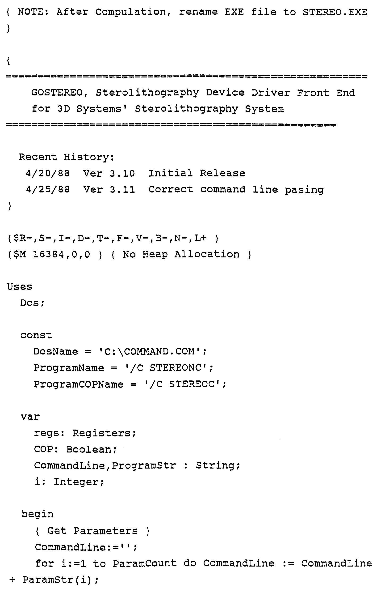 BUILD STEREO an applications program used to build parts; it passes along profile position info for each layer the memory-resident driver that performs several Stereolithography related tasks, one of which is drift correction -->