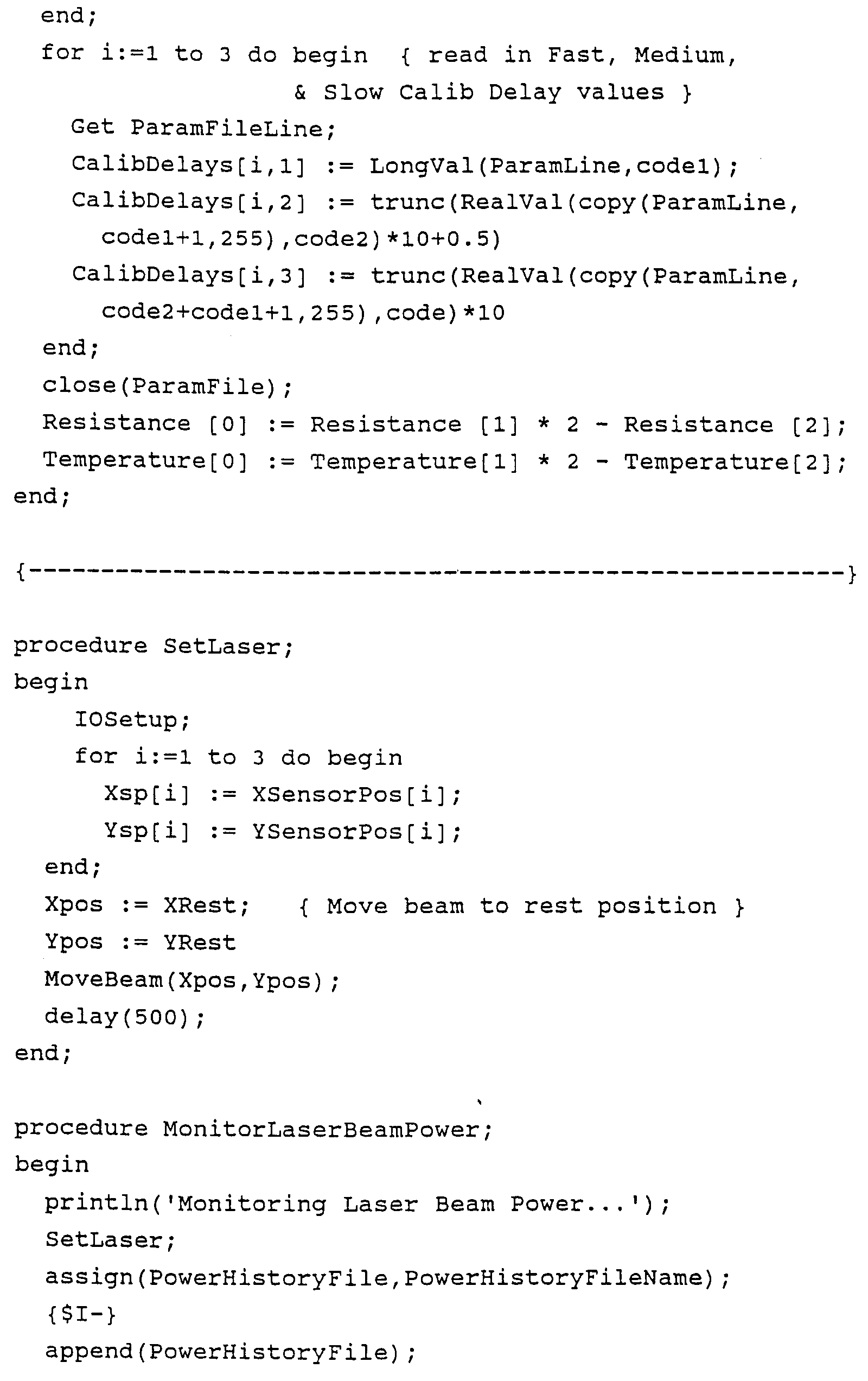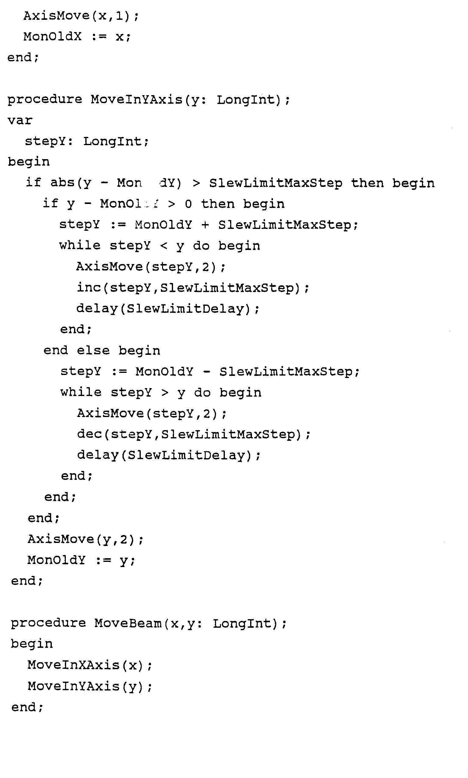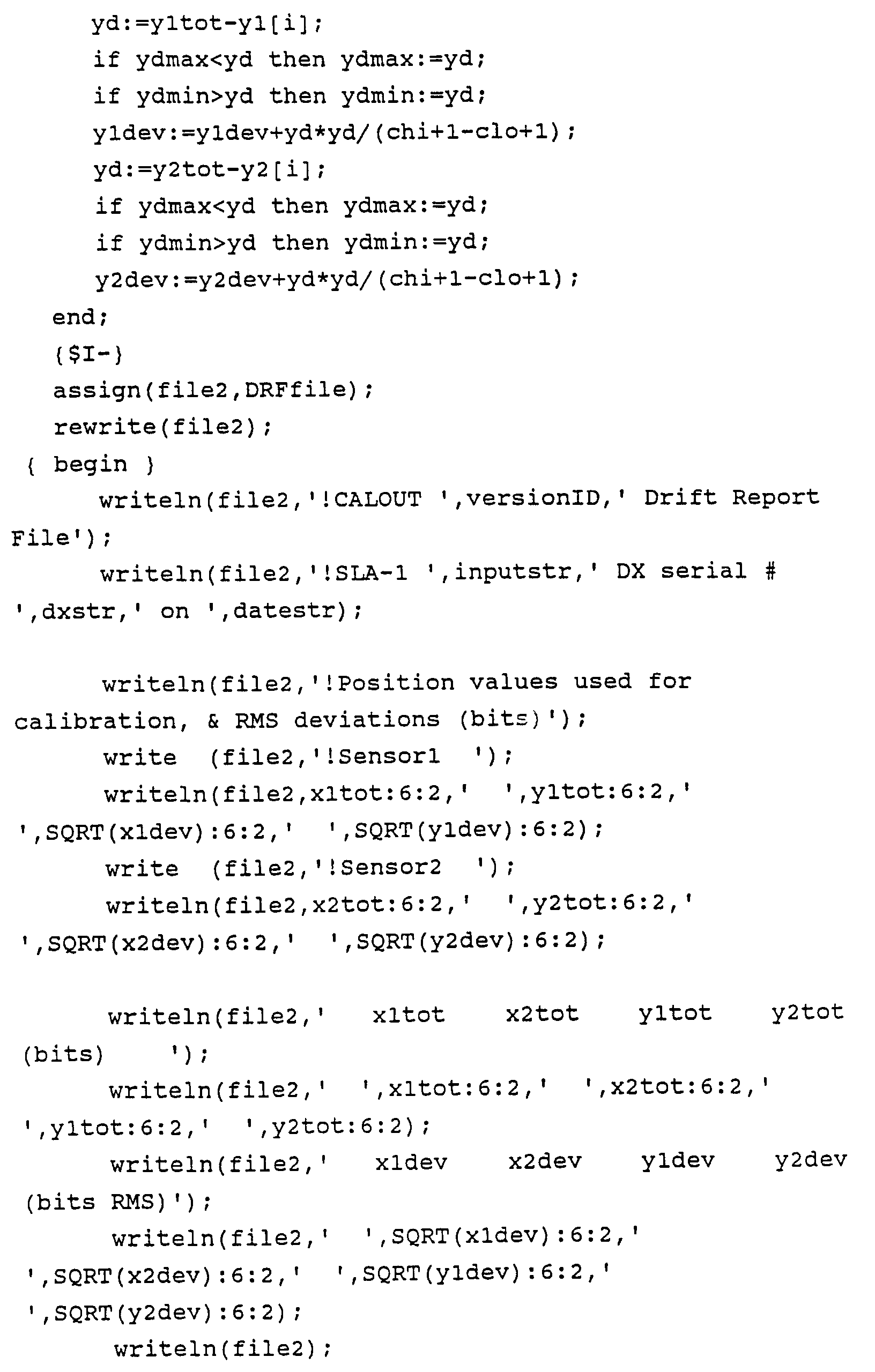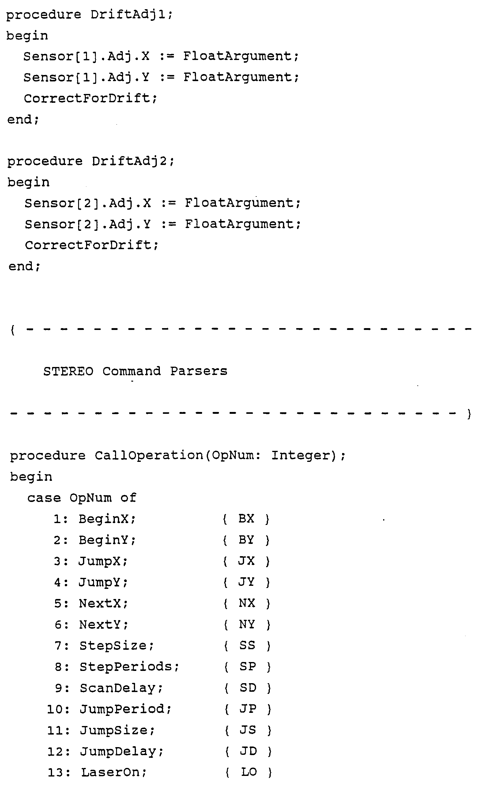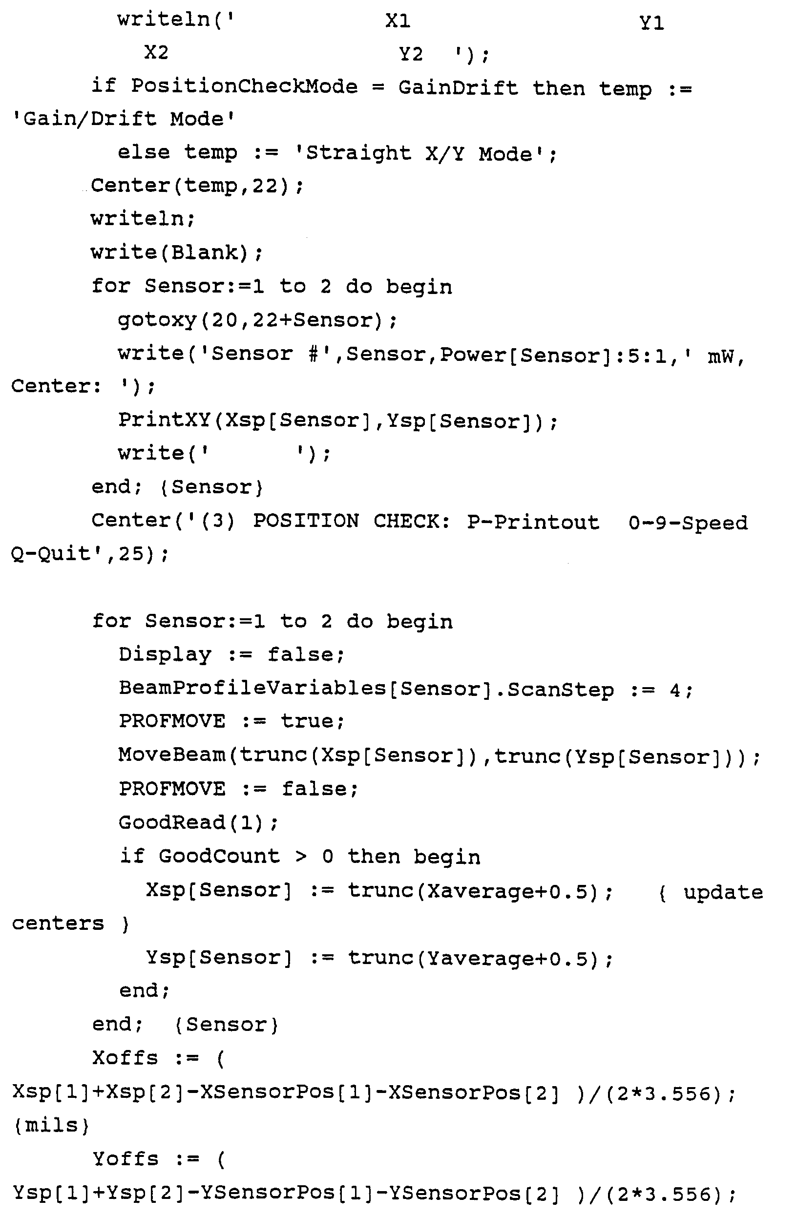 The Pascal function below is a sample for computing the values of the drift correction variables. The 'Ref' variables are the reference positions of the two beam profile sensors read from the disk data file. The 'Now' variables are the most recently determined positions of the two profile sensors. Because of dynamic changes in the physical characteristics of the laser scanning system, the positions held in the 'Now' variables will differ slightly from the ideal reference positions. The goal is to use these position differences to adjust upcoming mirror positions.