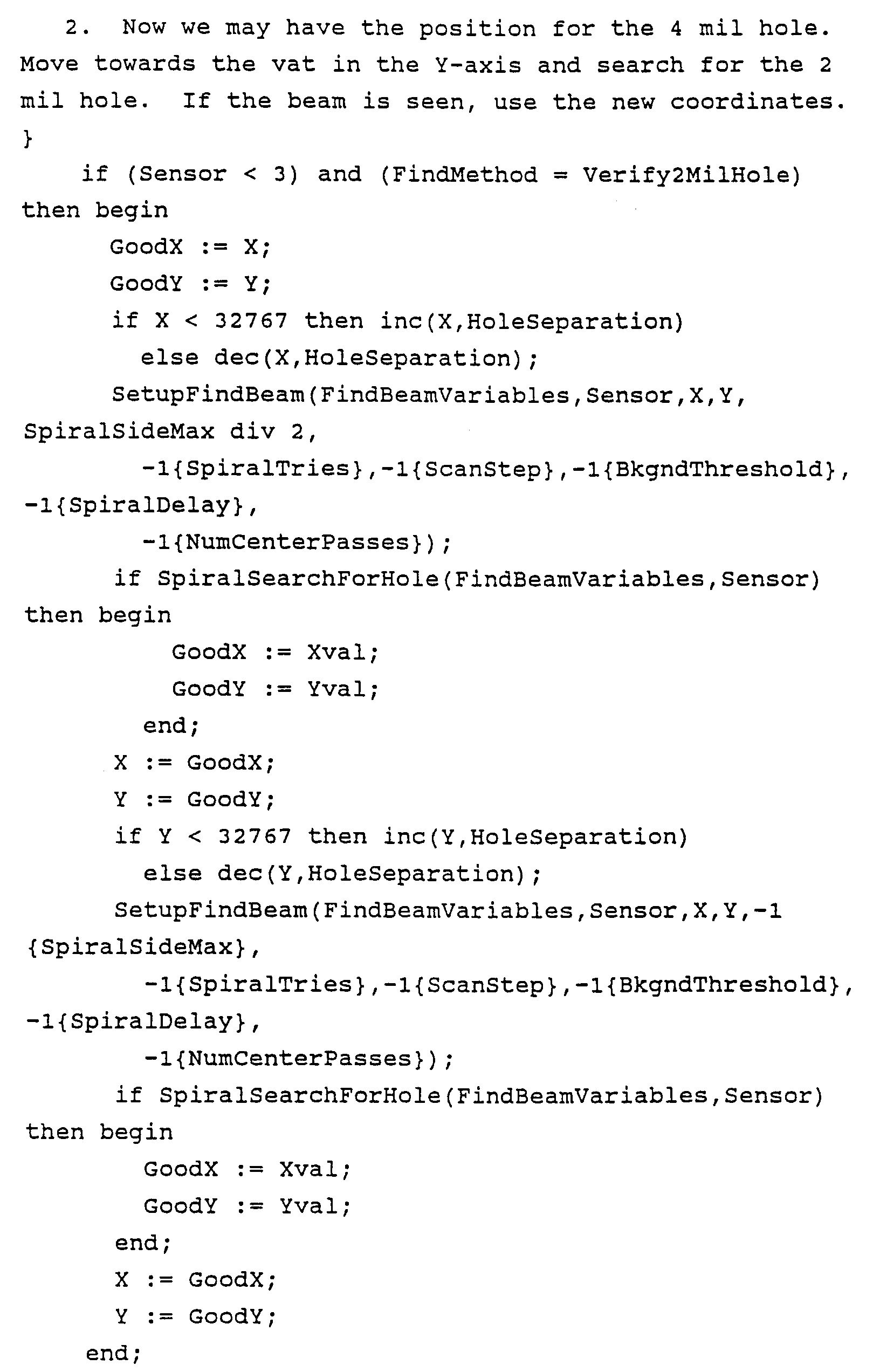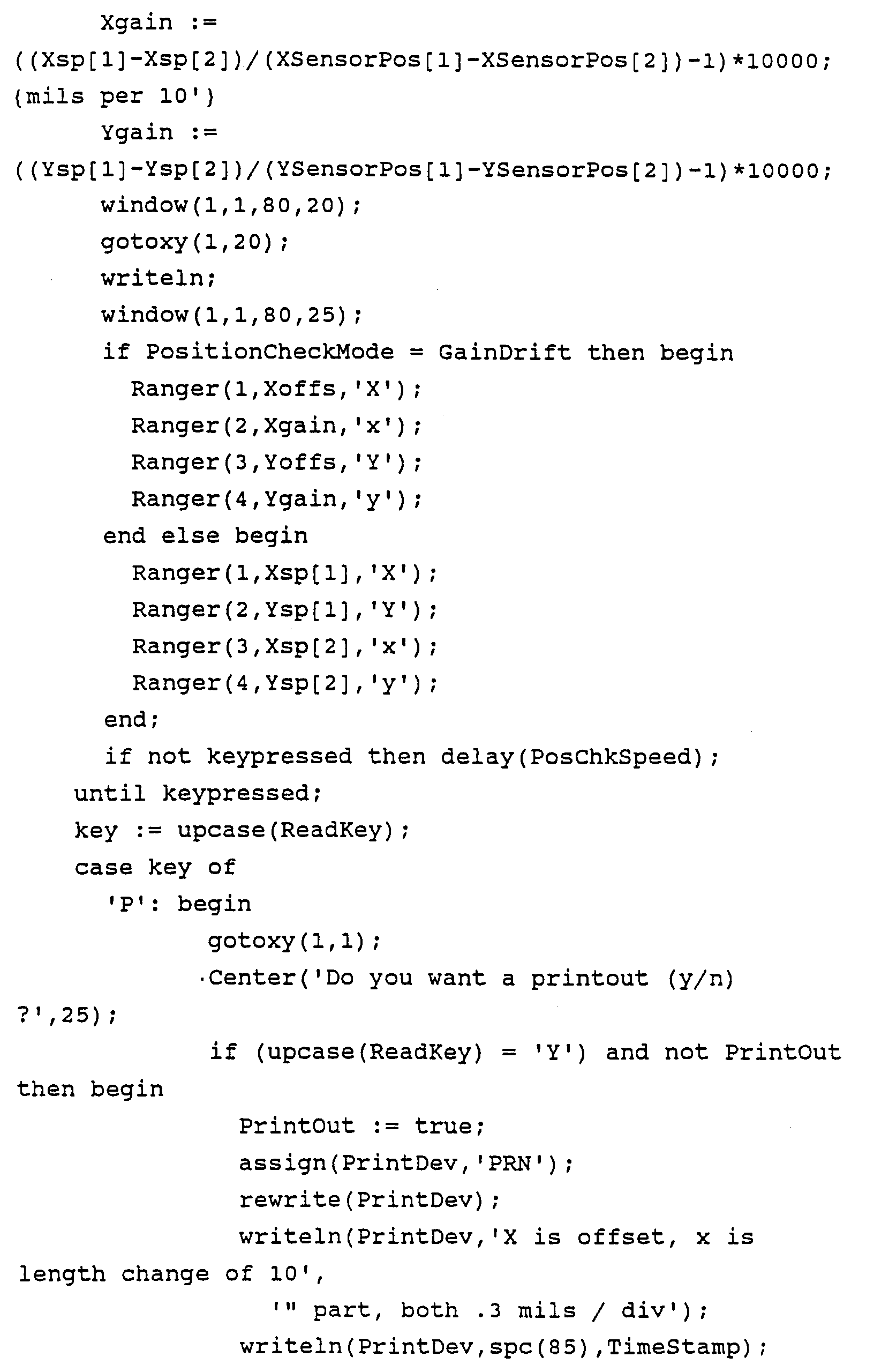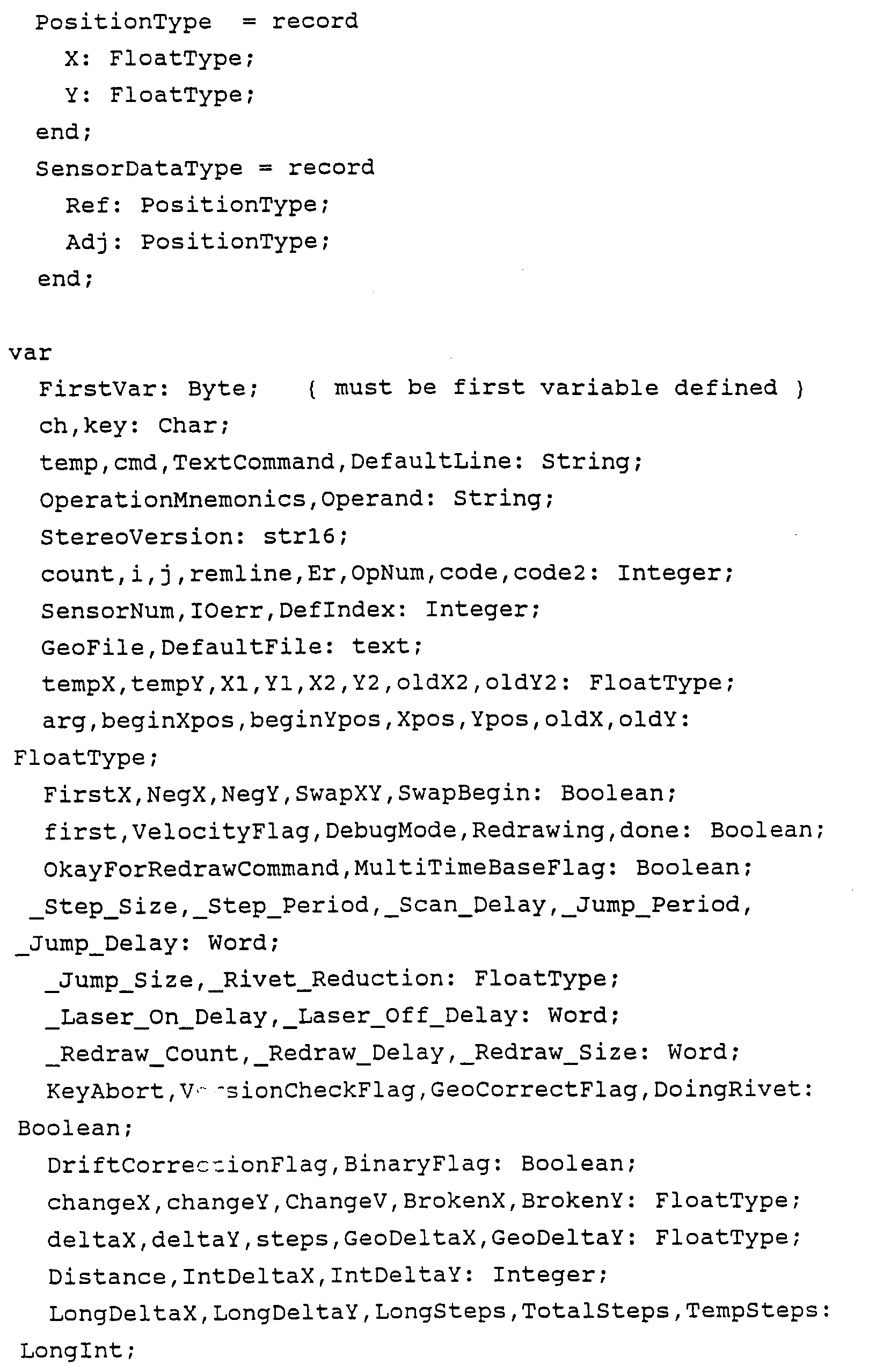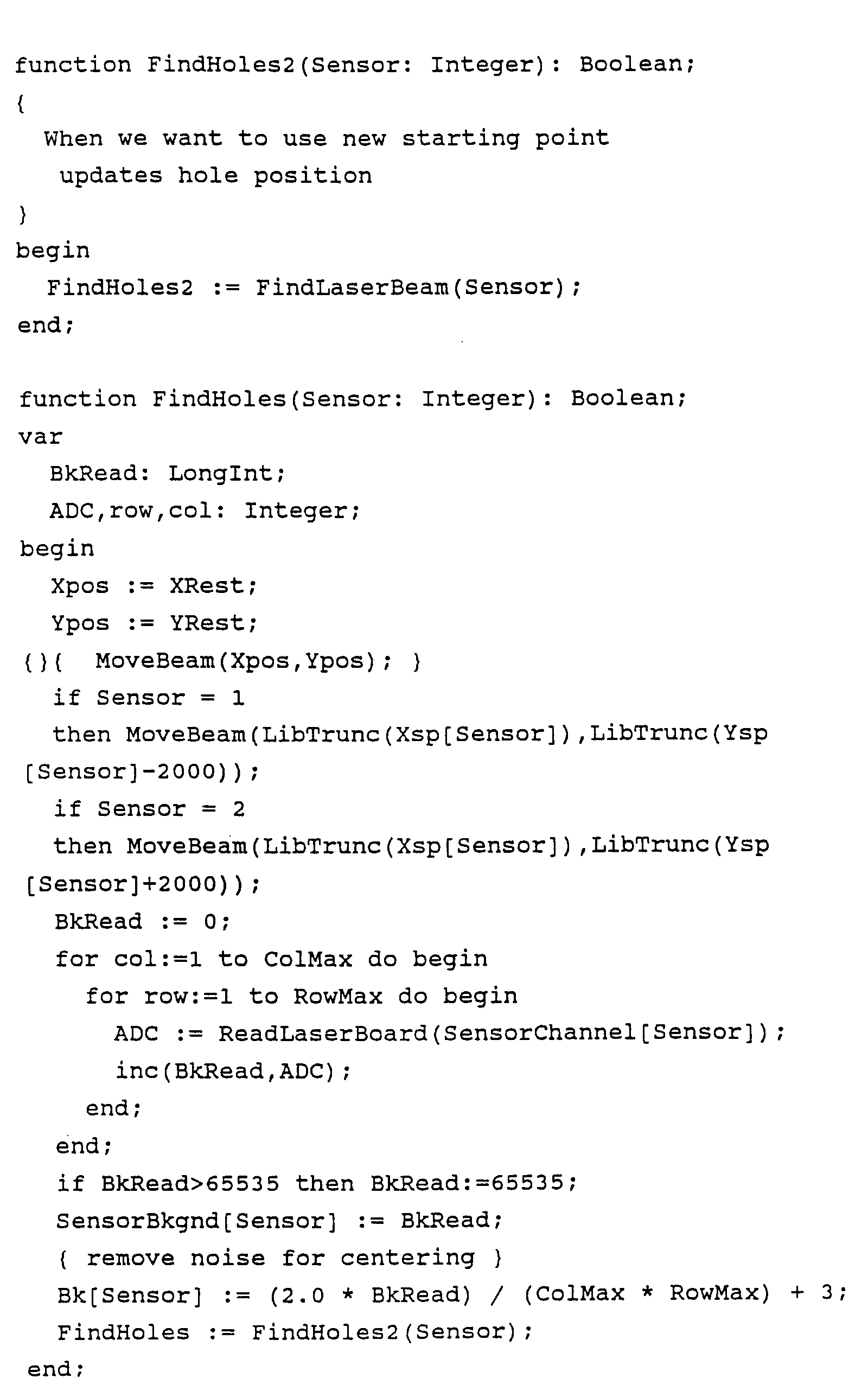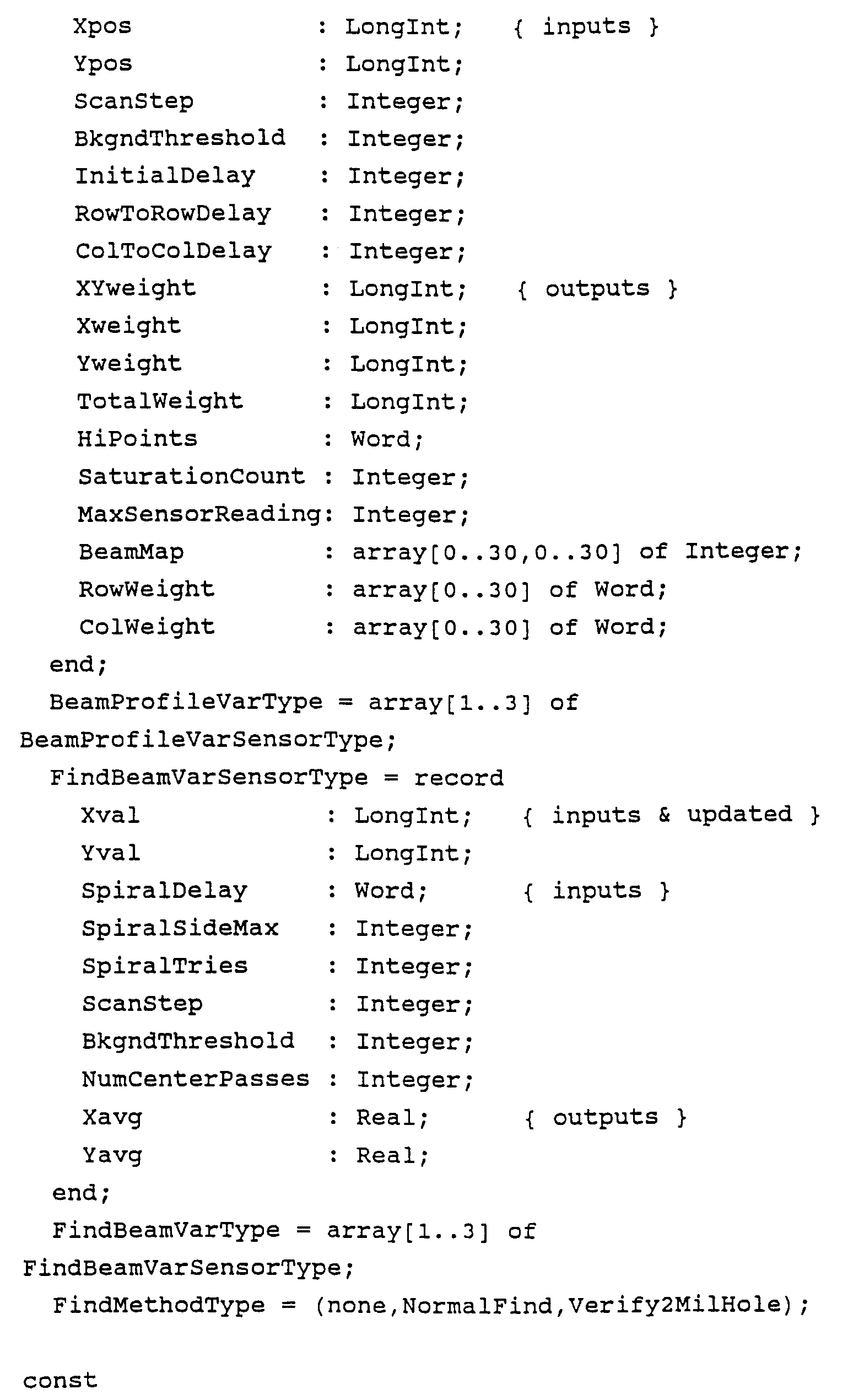 The Pascal function below is a sample for computing the values of the drift correction variables. The 'Ref' variables are the reference positions of the two beam profile sensors read from the disk data file. The 'Now' variables are the most recently determined positions of the two profile sensors. Because of dynamic changes in the physical characteristics of the laser scanning system, the positions held in the 'Now' variables will differ slightly from the ideal reference positions. The goal is to use these position differences to adjust upcoming mirror positions.