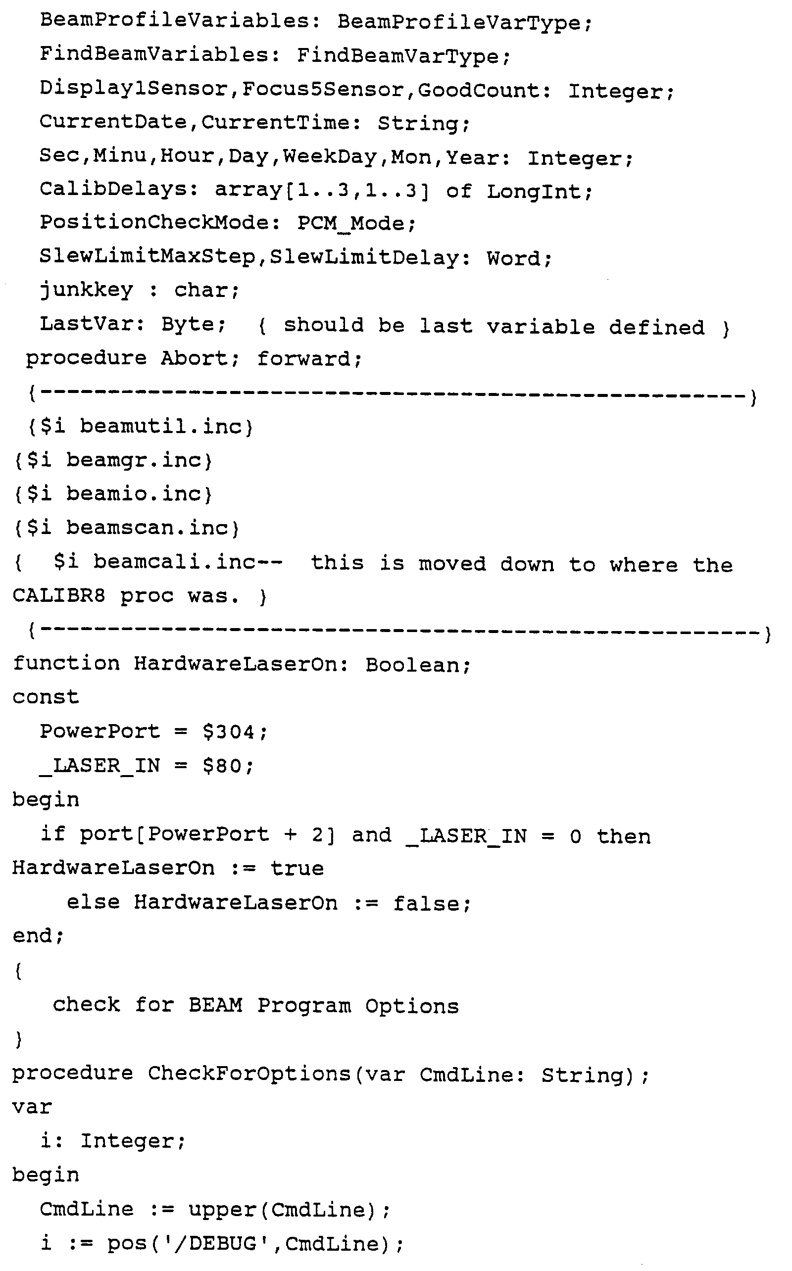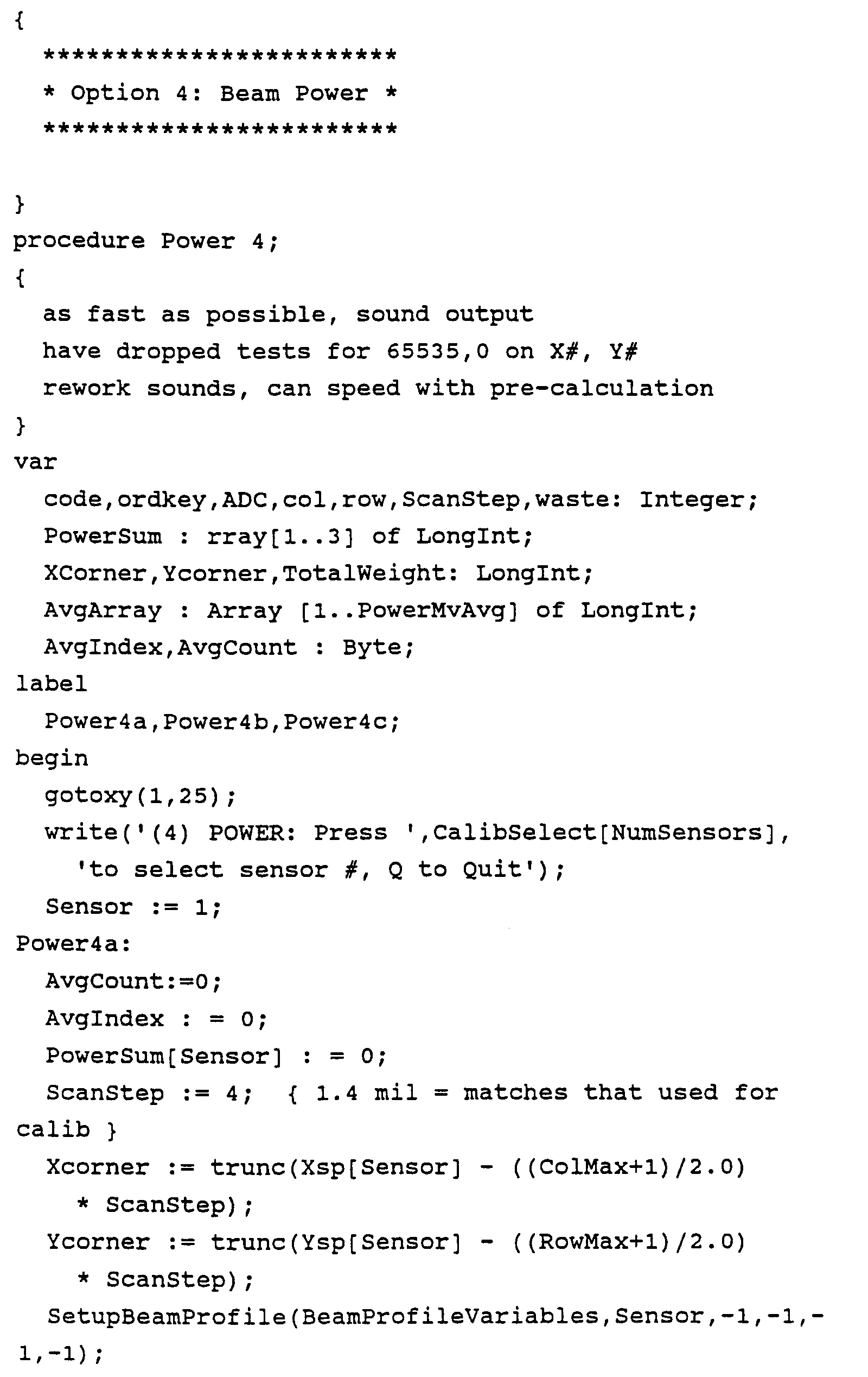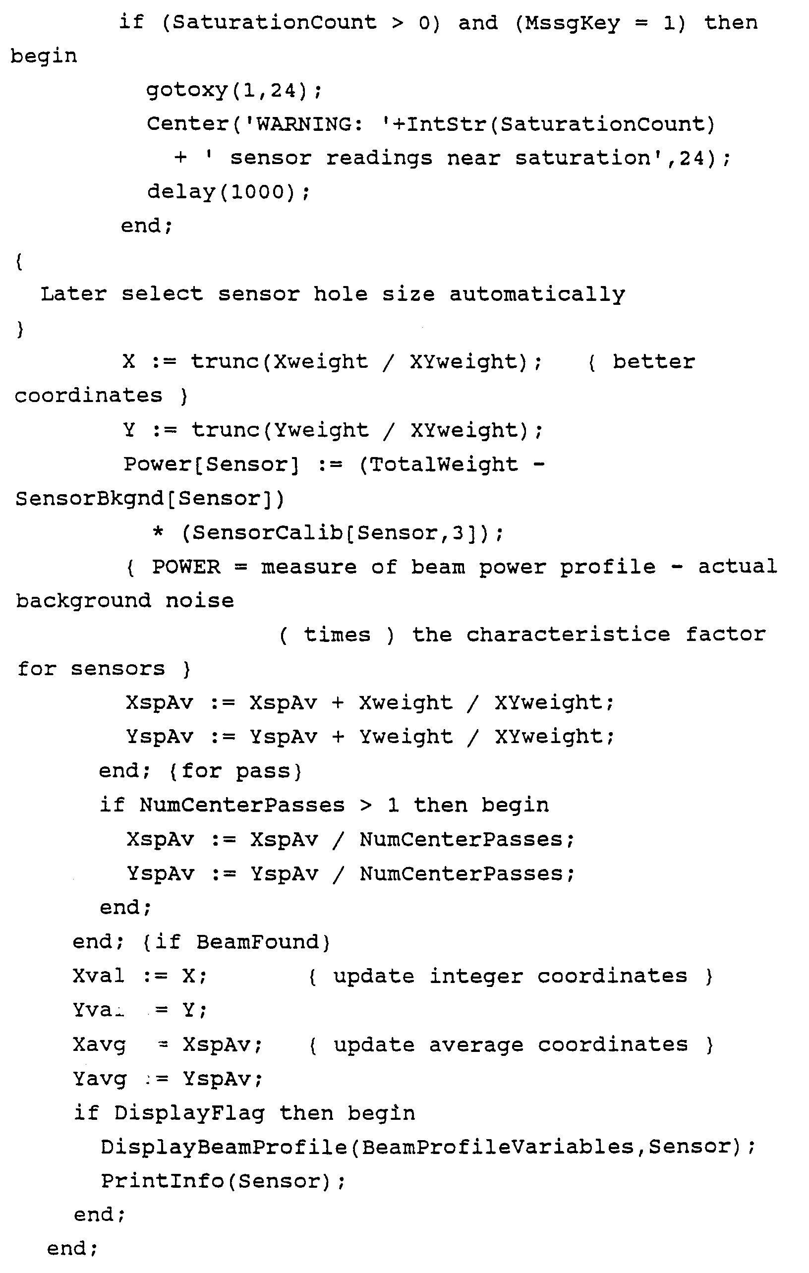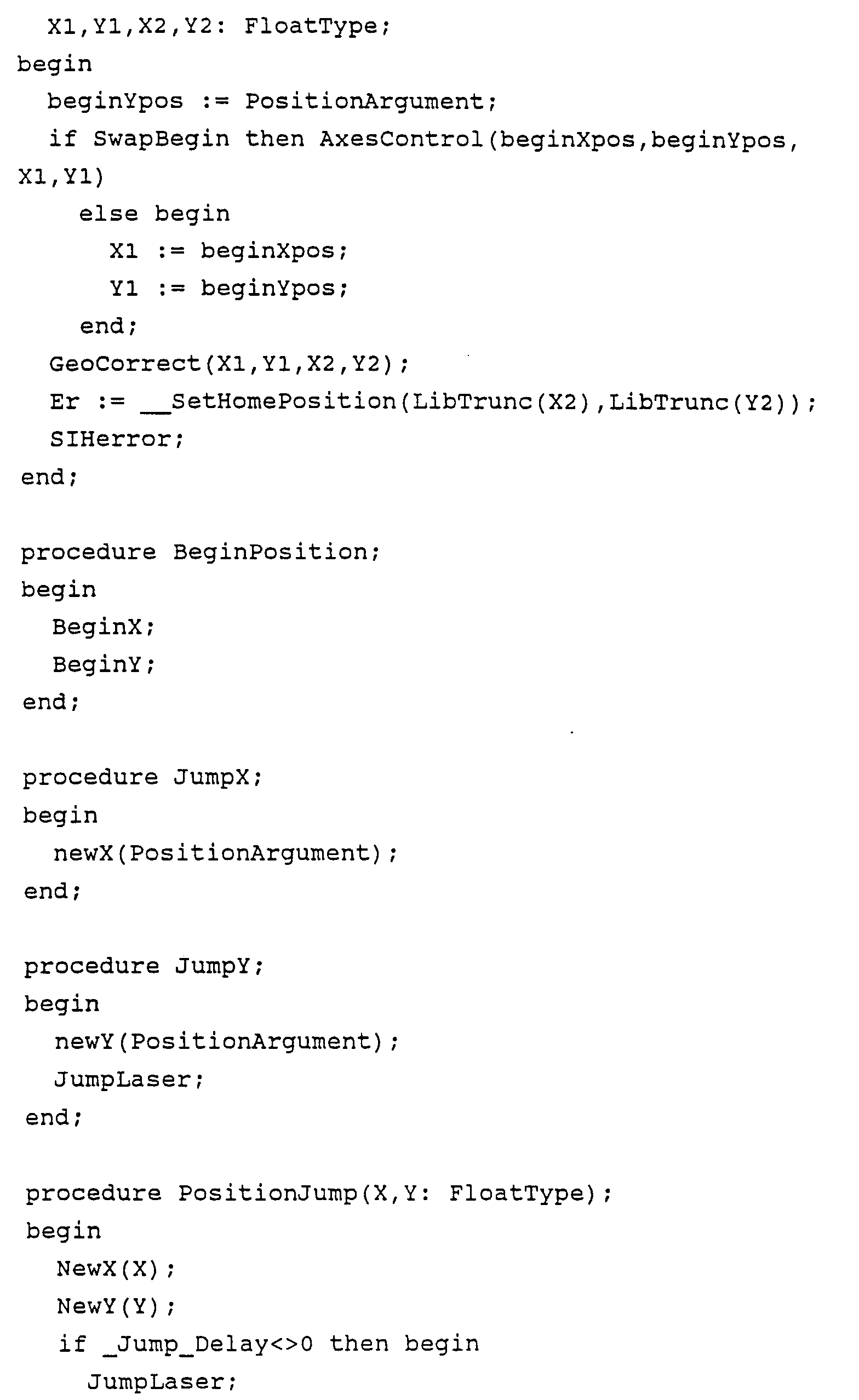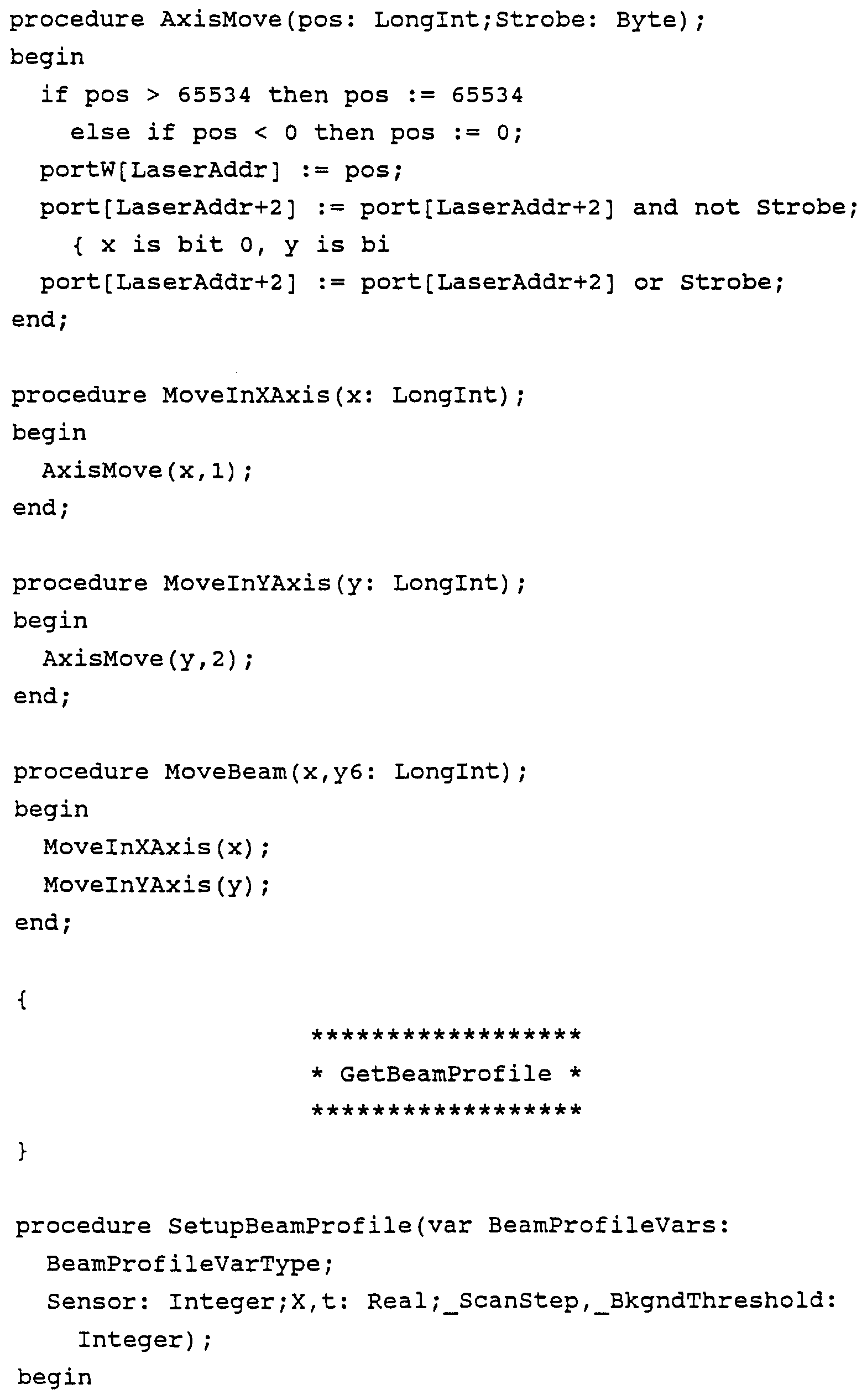 The Pascal function below is a sample for computing the values of the drift correction variables. The 'Ref' variables are the reference positions of the two beam profile sensors read from the disk data file. The 'Now' variables are the most recently determined positions of the two profile sensors. Because of dynamic changes in the physical characteristics of the laser scanning system, the positions held in the 'Now' variables will differ slightly from the ideal reference positions. The goal is to use these position differences to adjust upcoming mirror positions.