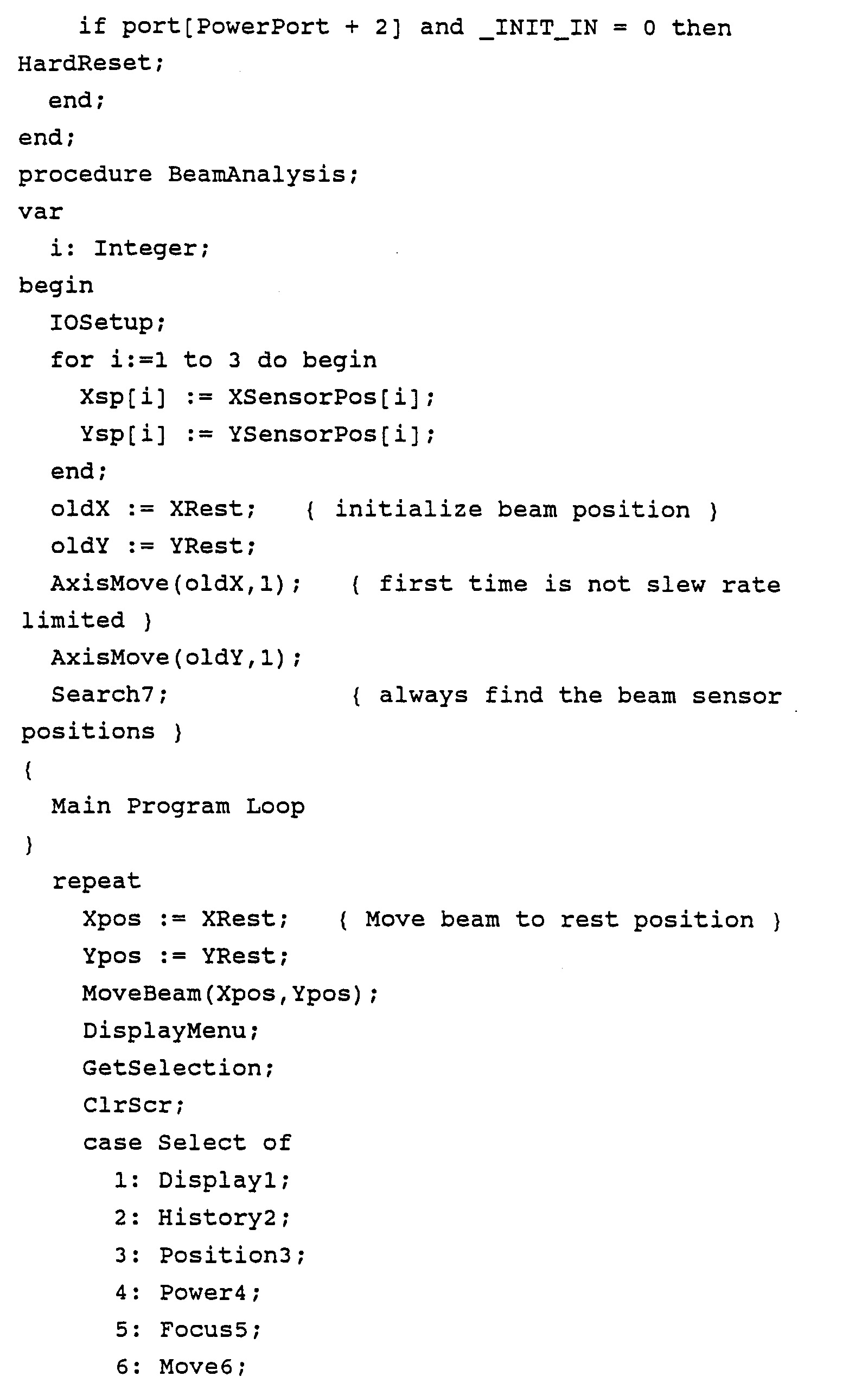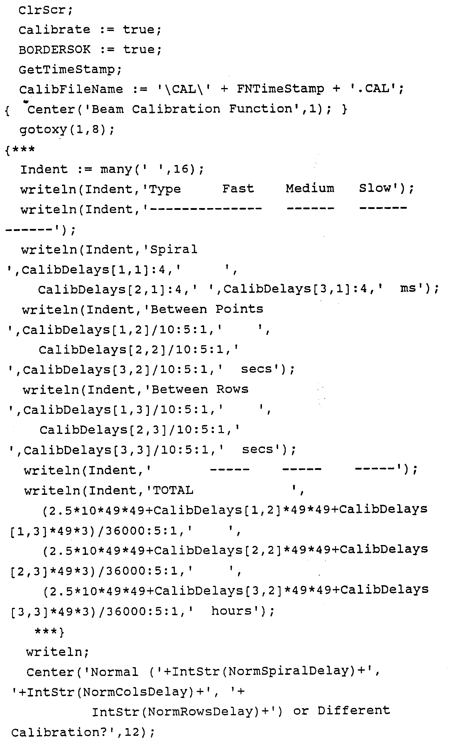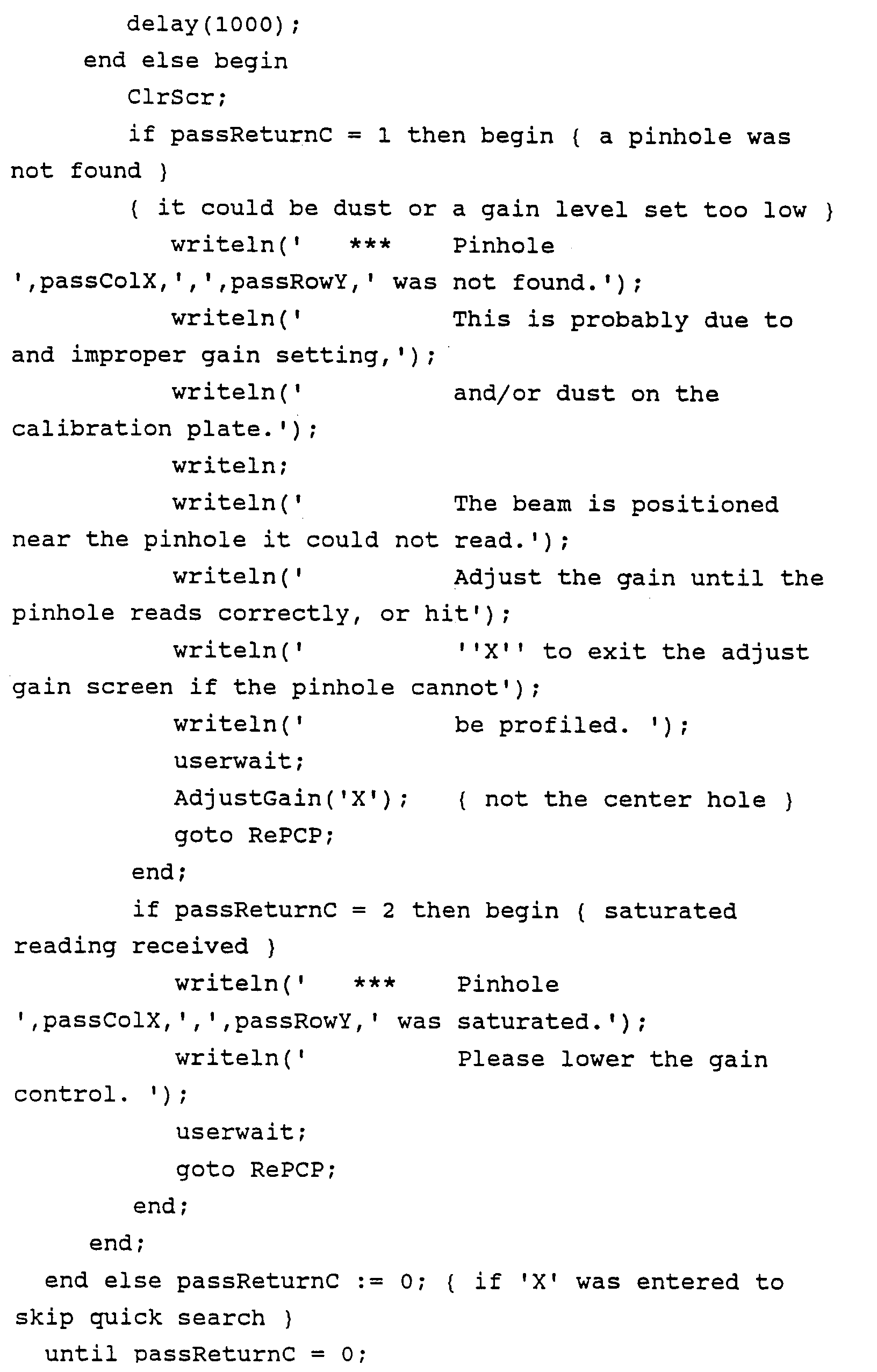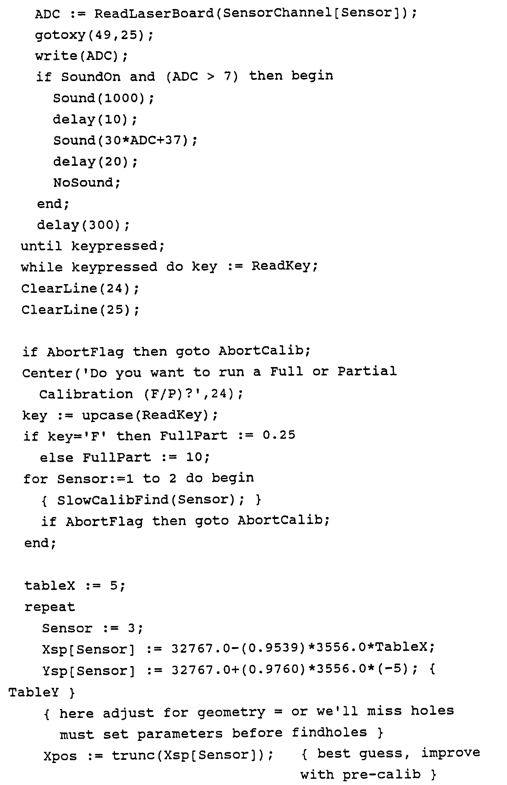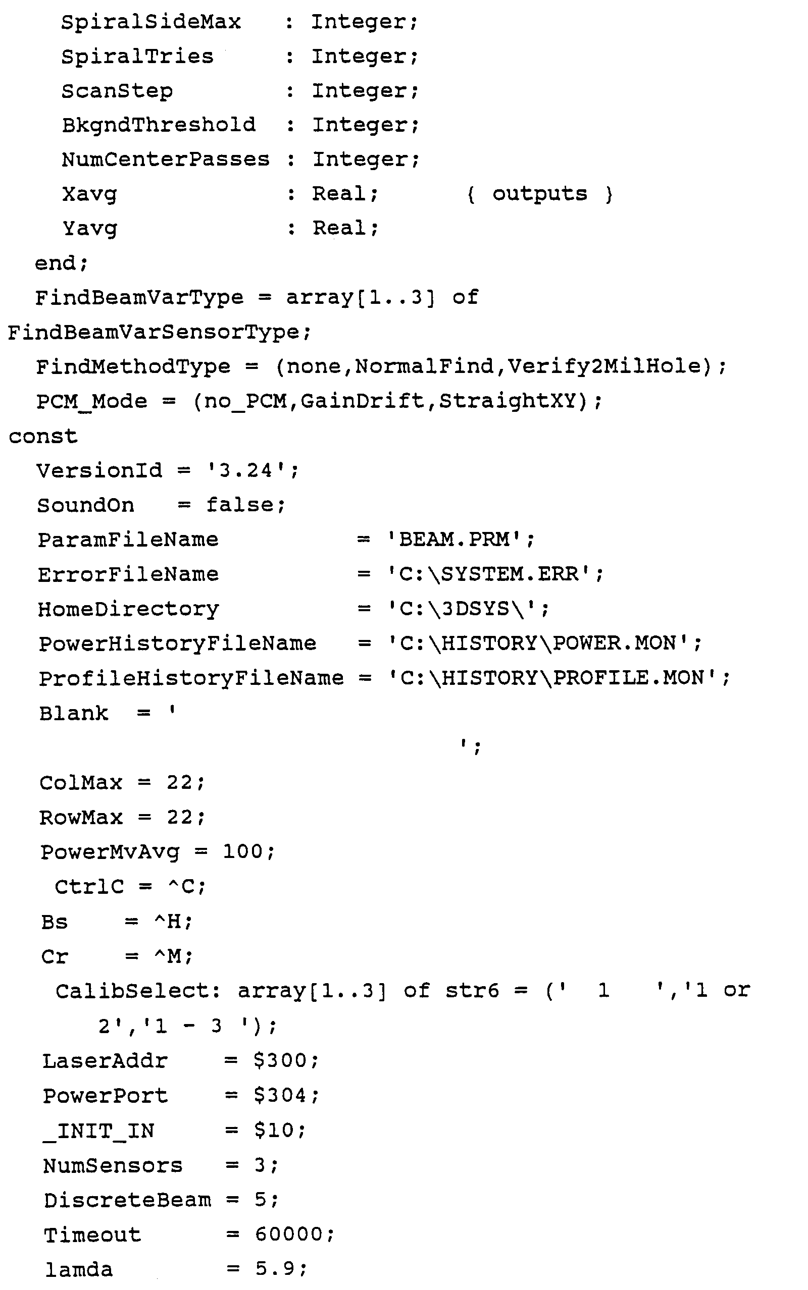 The Pascal function below is a sample for computing the values of the drift correction variables. The 'Ref' variables are the reference positions of the two beam profile sensors read from the disk data file. The 'Now' variables are the most recently determined positions of the two profile sensors. Because of dynamic changes in the physical characteristics of the laser scanning system, the positions held in the 'Now' variables will differ slightly from the ideal reference positions. The goal is to use these position differences to adjust upcoming mirror positions.