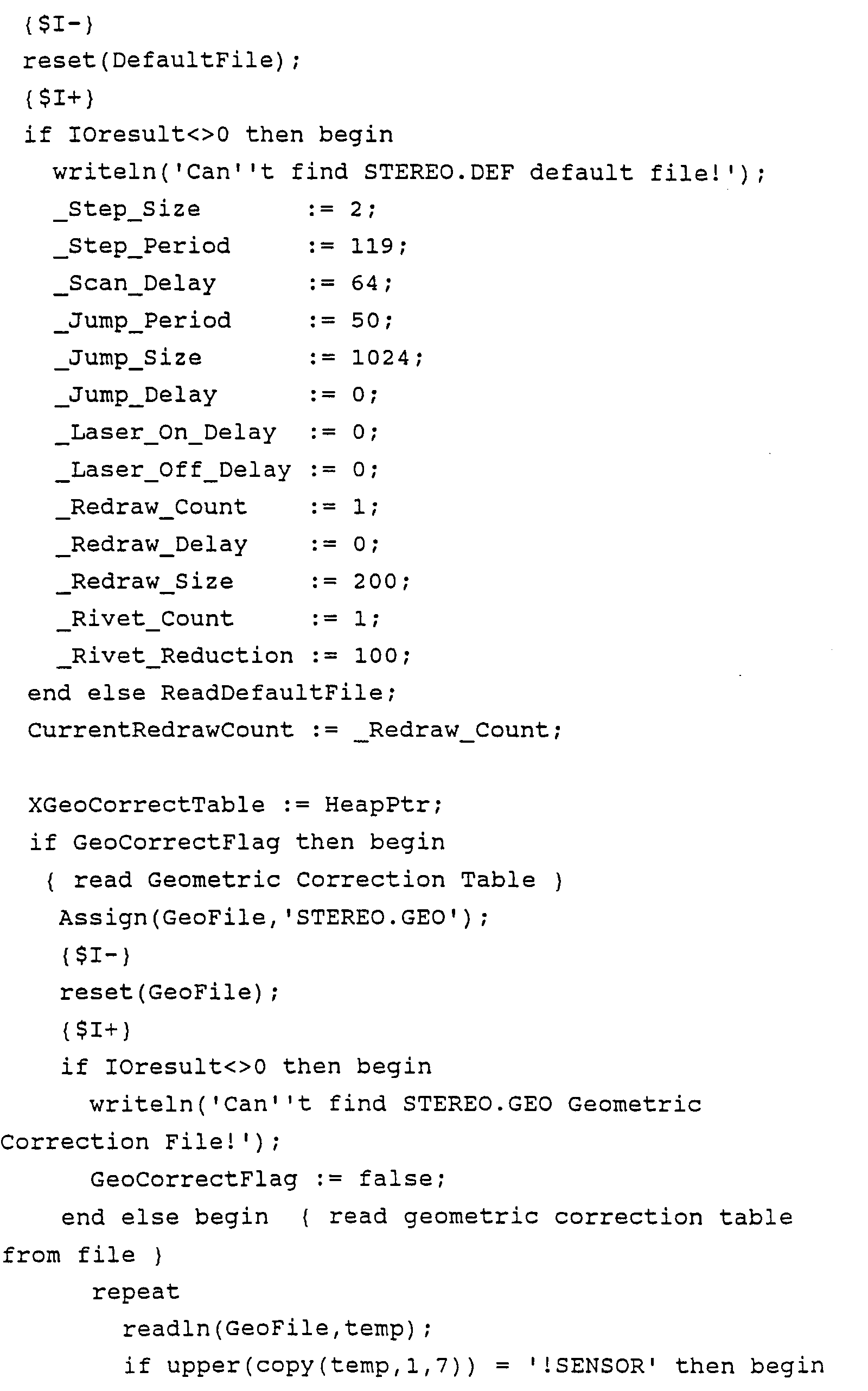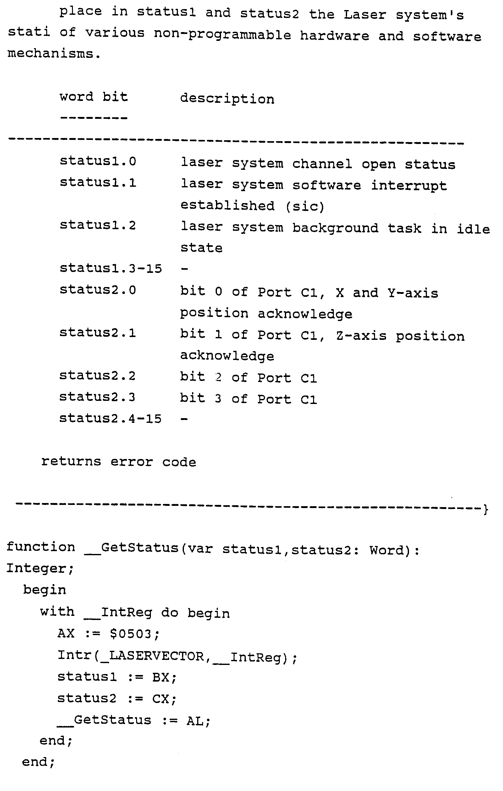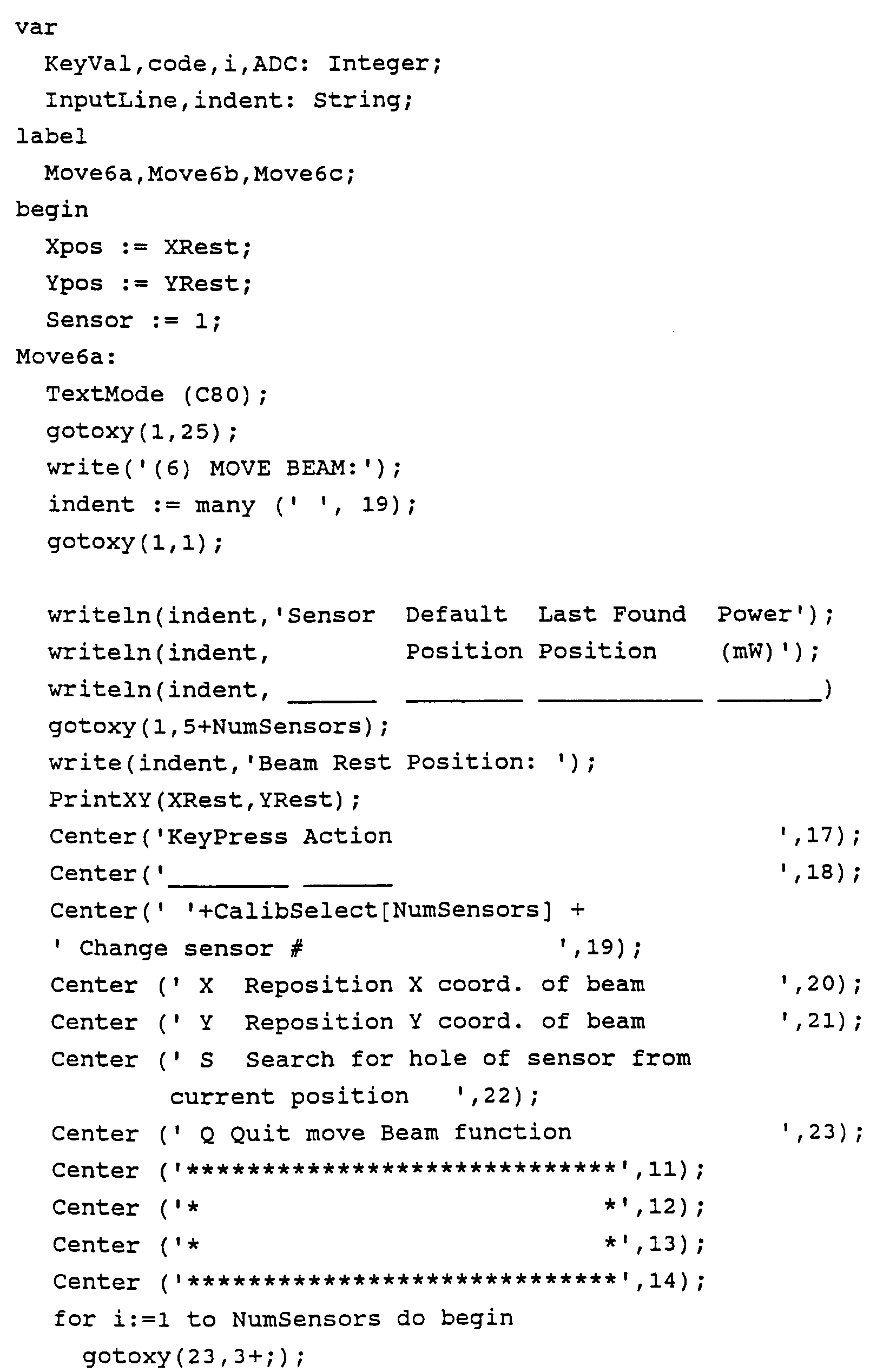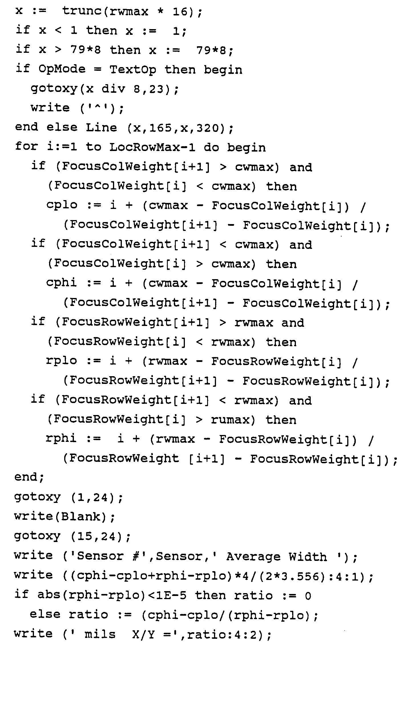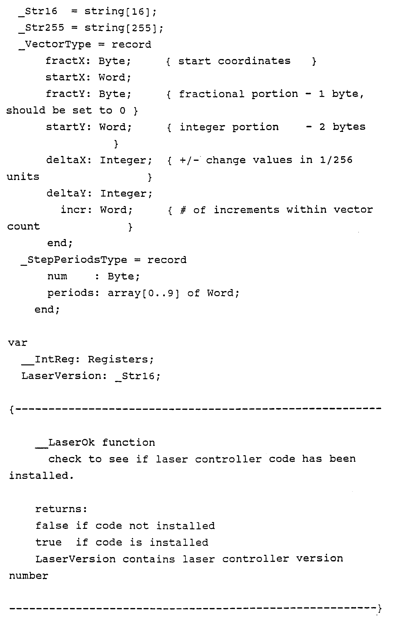 The Pascal function below is a sample for computing the values of the drift correction variables. The 'Ref' variables are the reference positions of the two beam profile sensors read from the disk data file. The 'Now' variables are the most recently determined positions of the two profile sensors. Because of dynamic changes in the physical characteristics of the laser scanning system, the positions held in the 'Now' variables will differ slightly from the ideal reference positions. The goal is to use these position differences to adjust upcoming mirror positions.