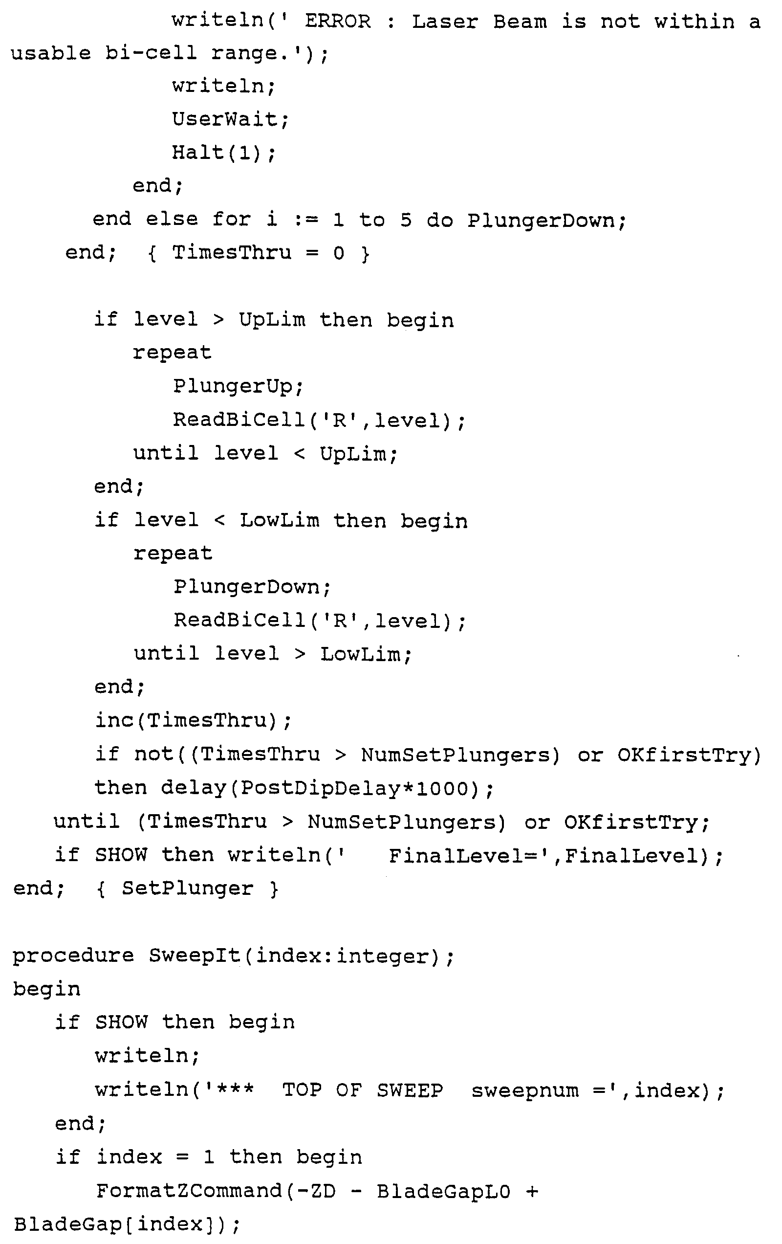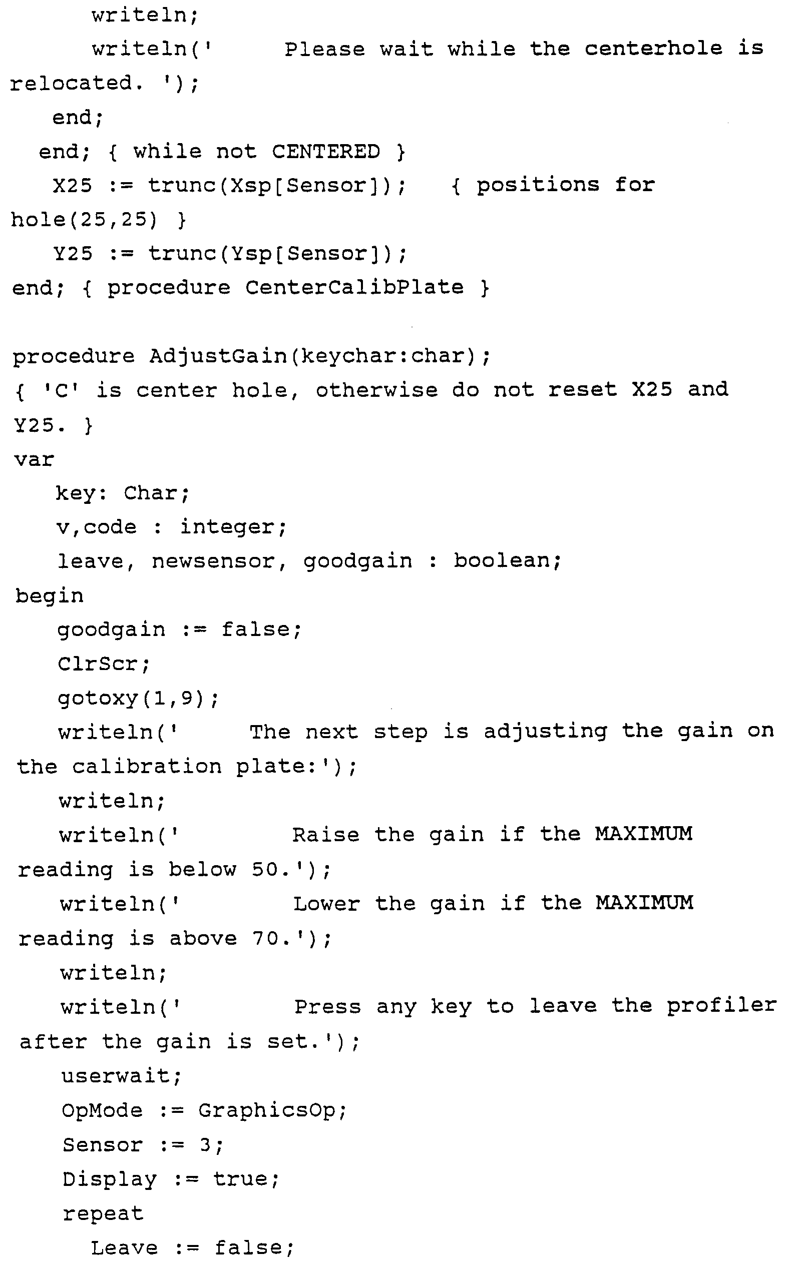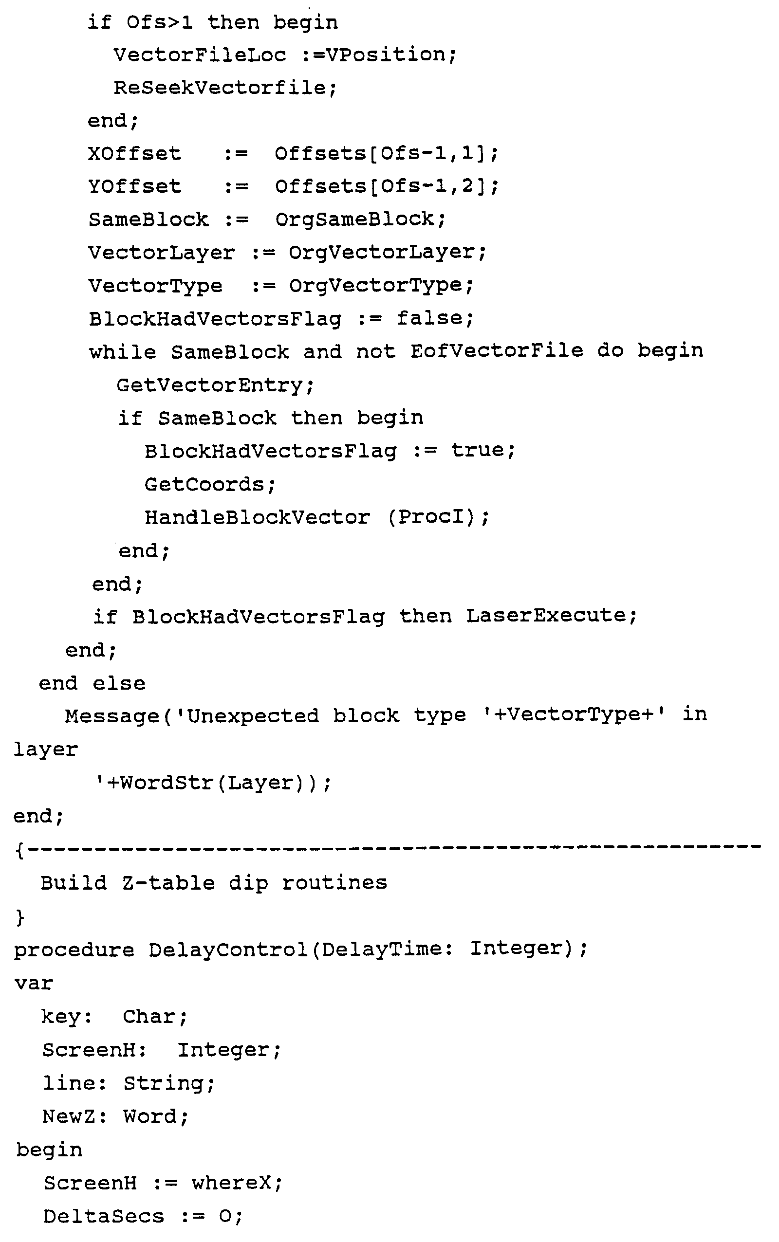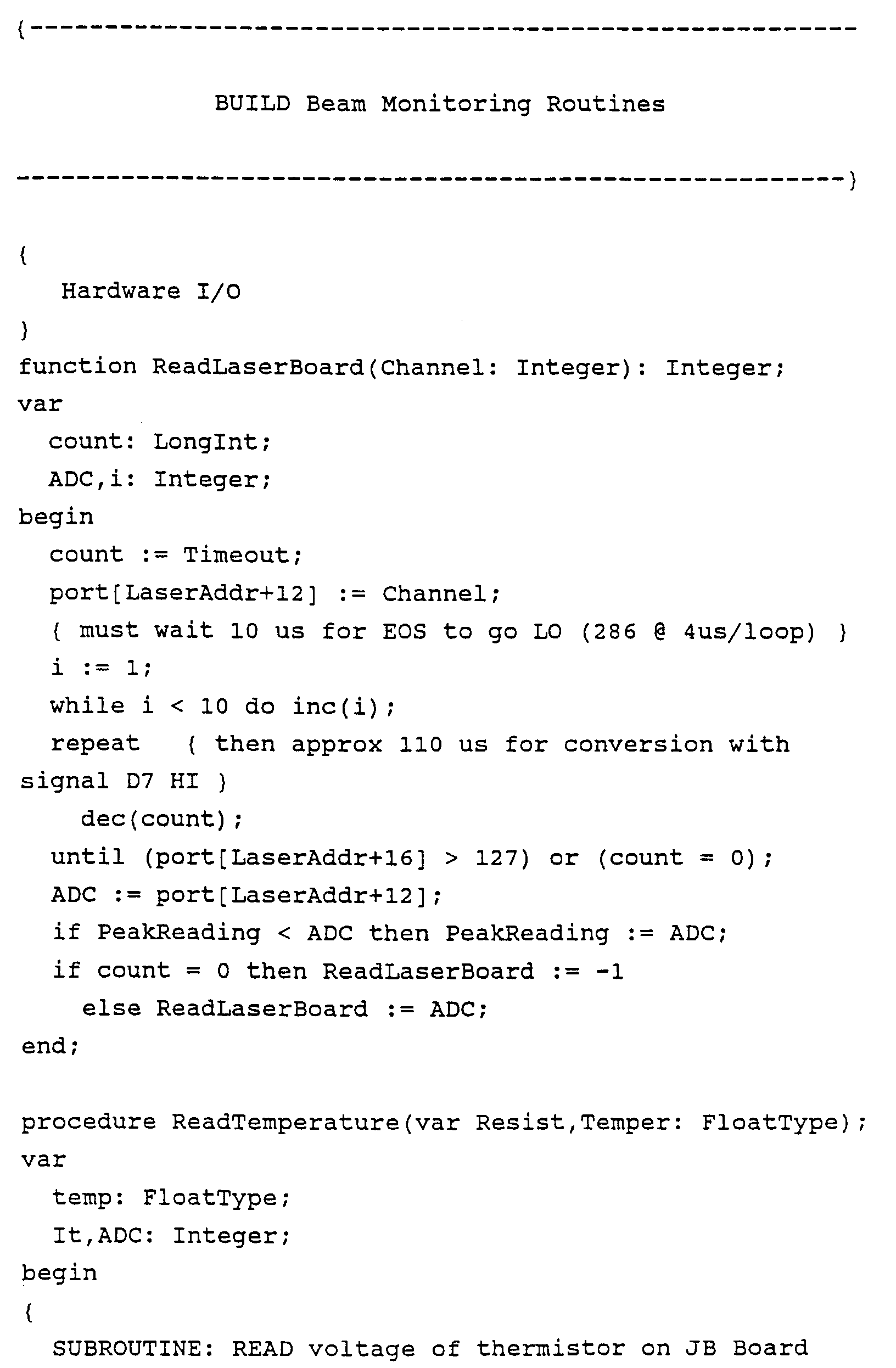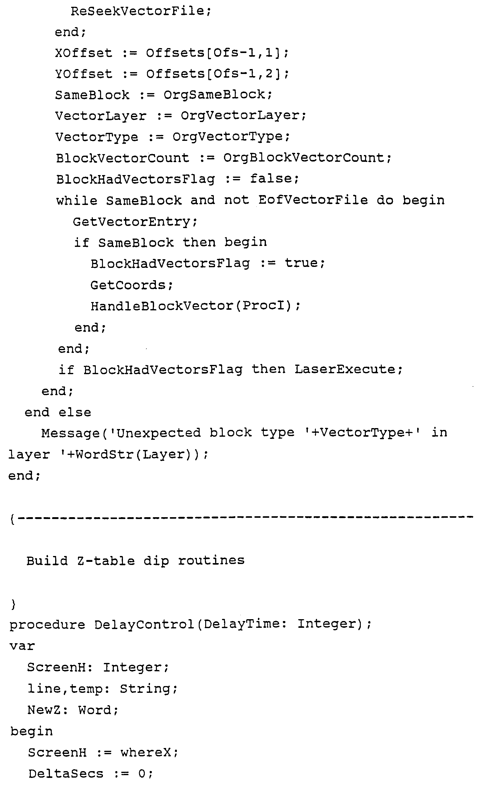 The Pascal function below is a sample for computing the values of the drift correction variables. The 'Ref' variables are the reference positions of the two beam profile sensors read from the disk data file. The 'Now' variables are the most recently determined positions of the two profile sensors. Because of dynamic changes in the physical characteristics of the laser scanning system, the positions held in the 'Now' variables will differ slightly from the ideal reference positions. The goal is to use these position differences to adjust upcoming mirror positions.