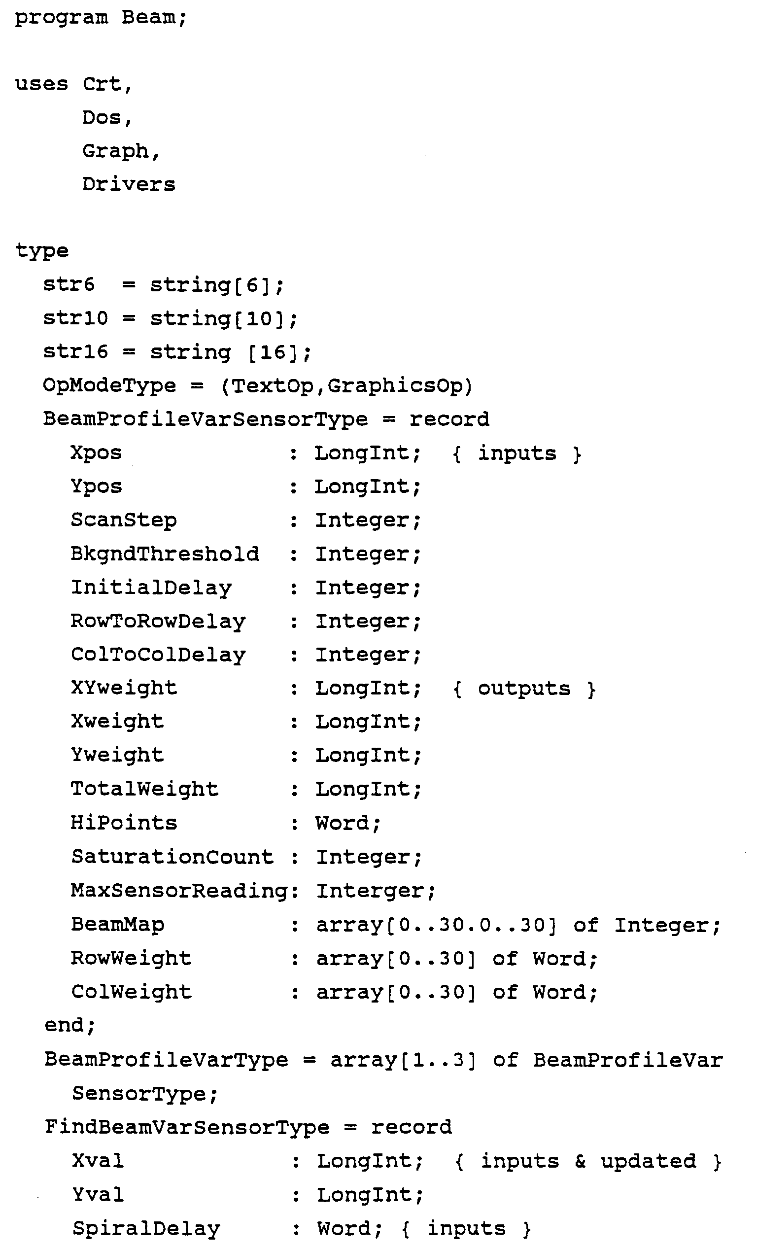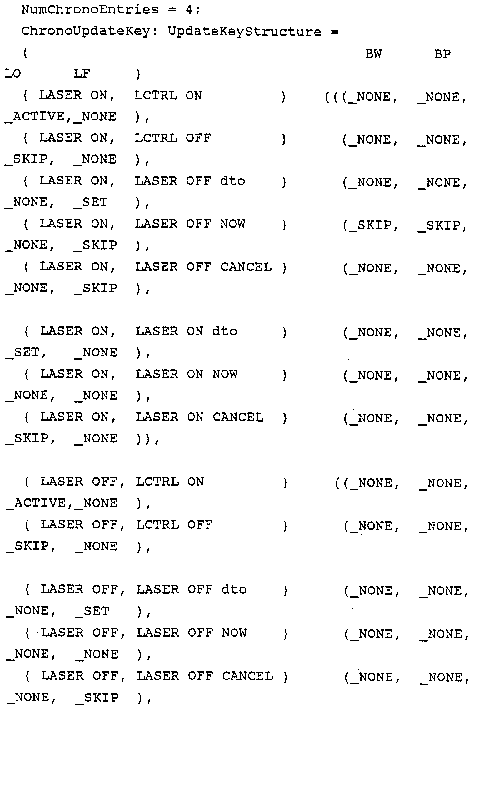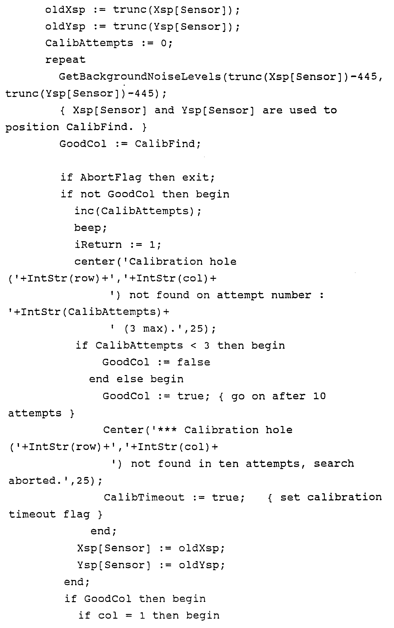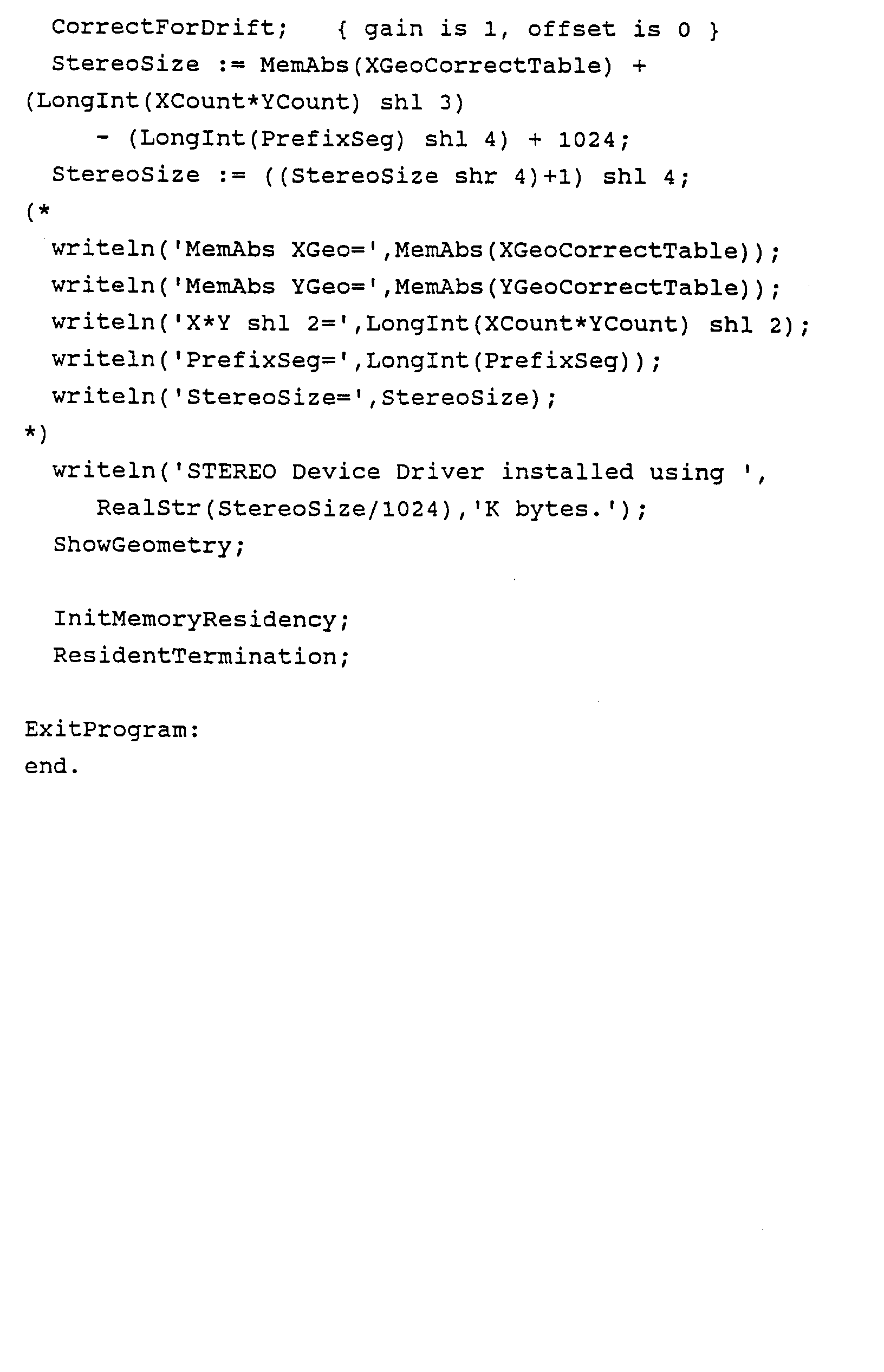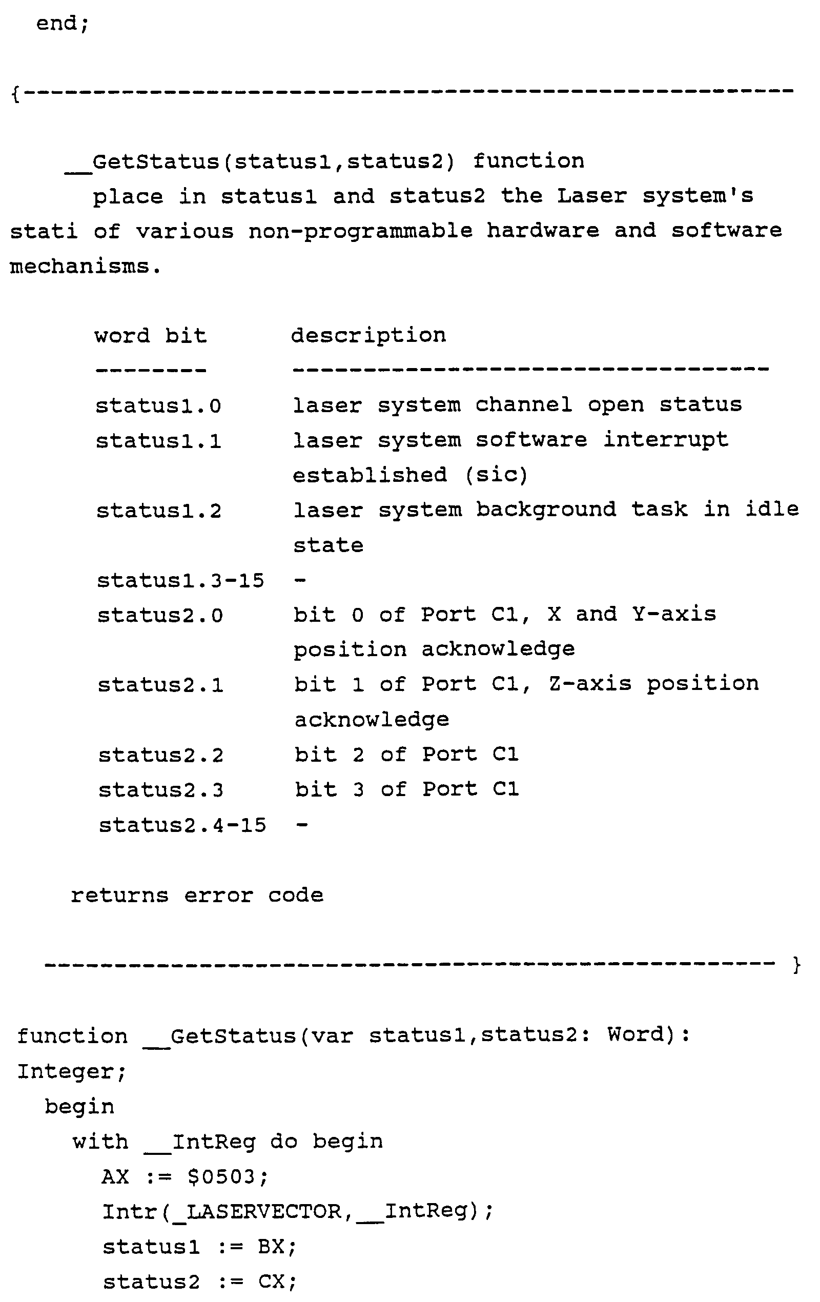 The Pascal function below is a sample for computing the values of the drift correction variables. The 'Ref' variables are the reference positions of the two beam profile sensors read from the disk data file. The 'Now' variables are the most recently determined positions of the two profile sensors. Because of dynamic changes in the physical characteristics of the laser scanning system, the positions held in the 'Now' variables will differ slightly from the ideal reference positions. The goal is to use these position differences to adjust upcoming mirror positions.