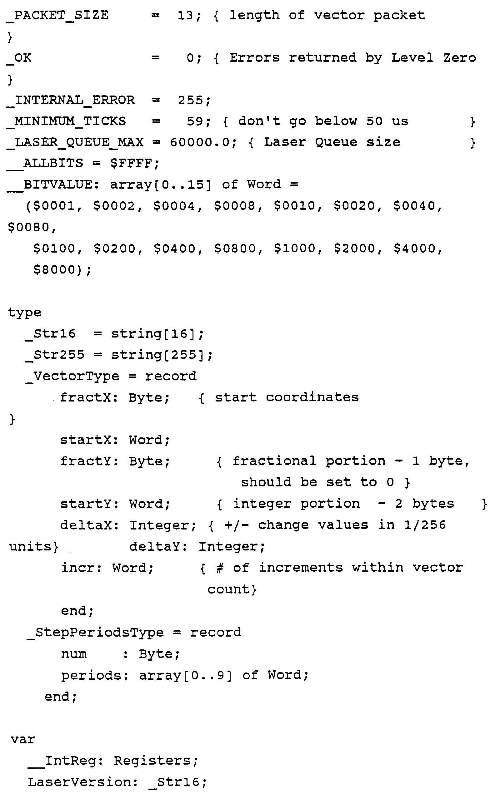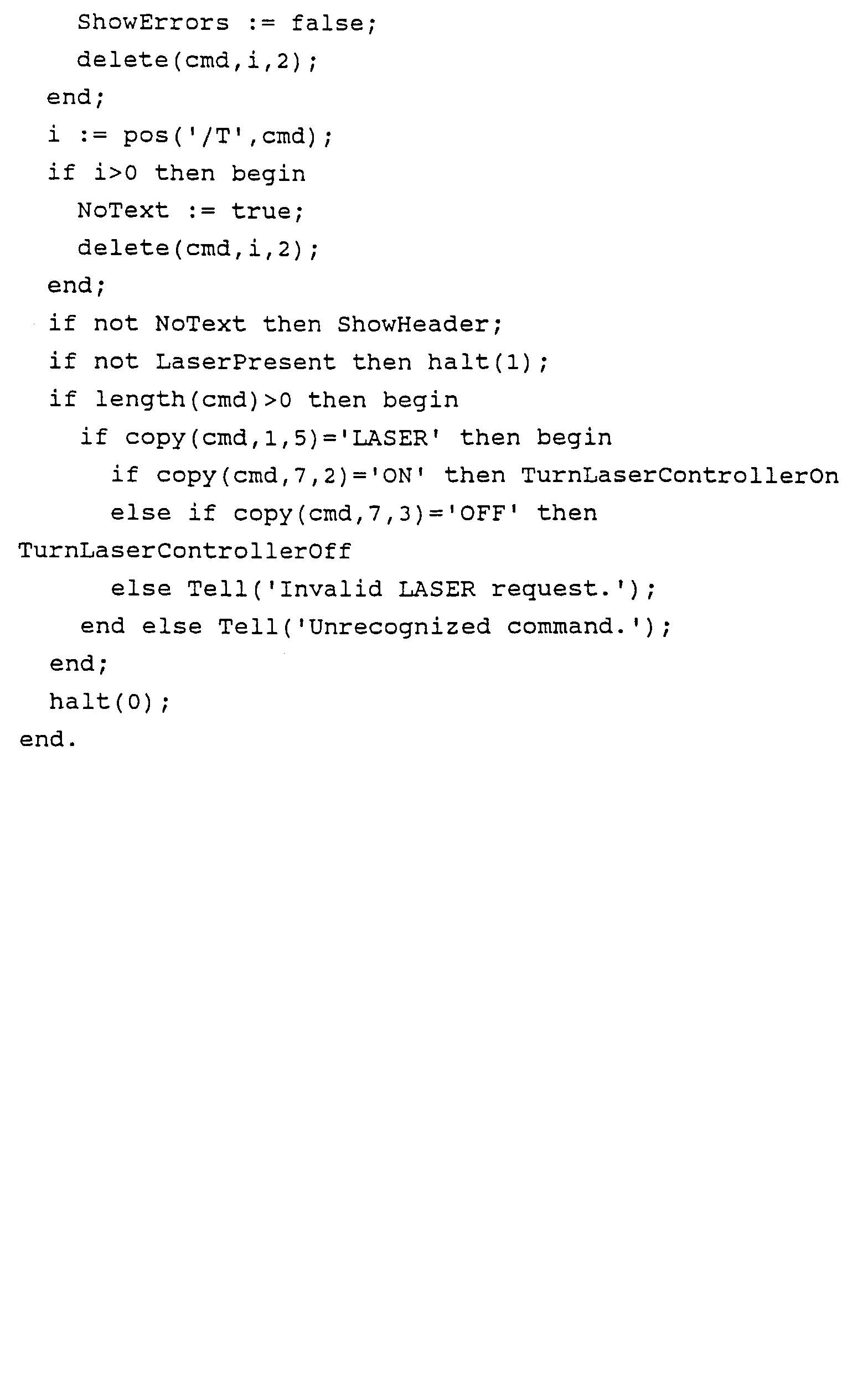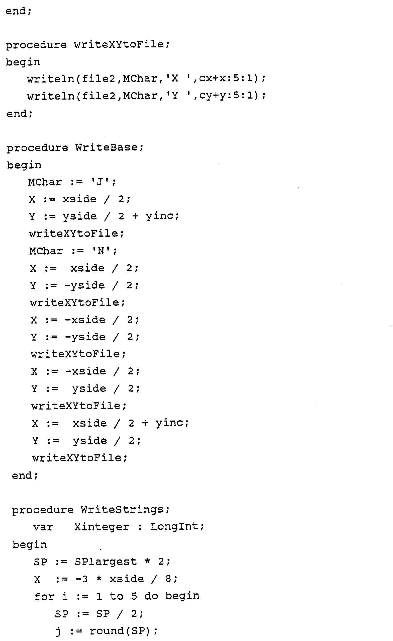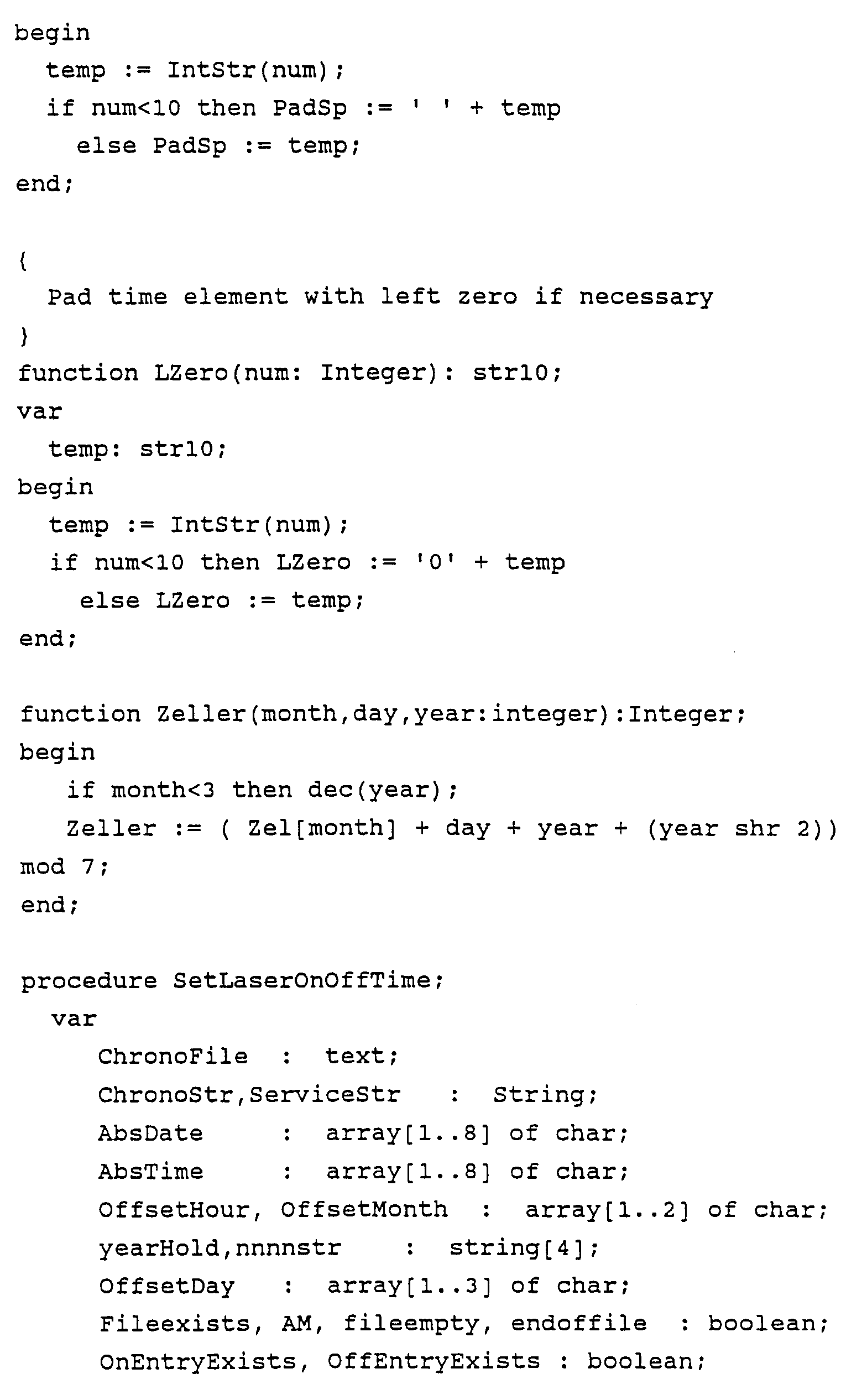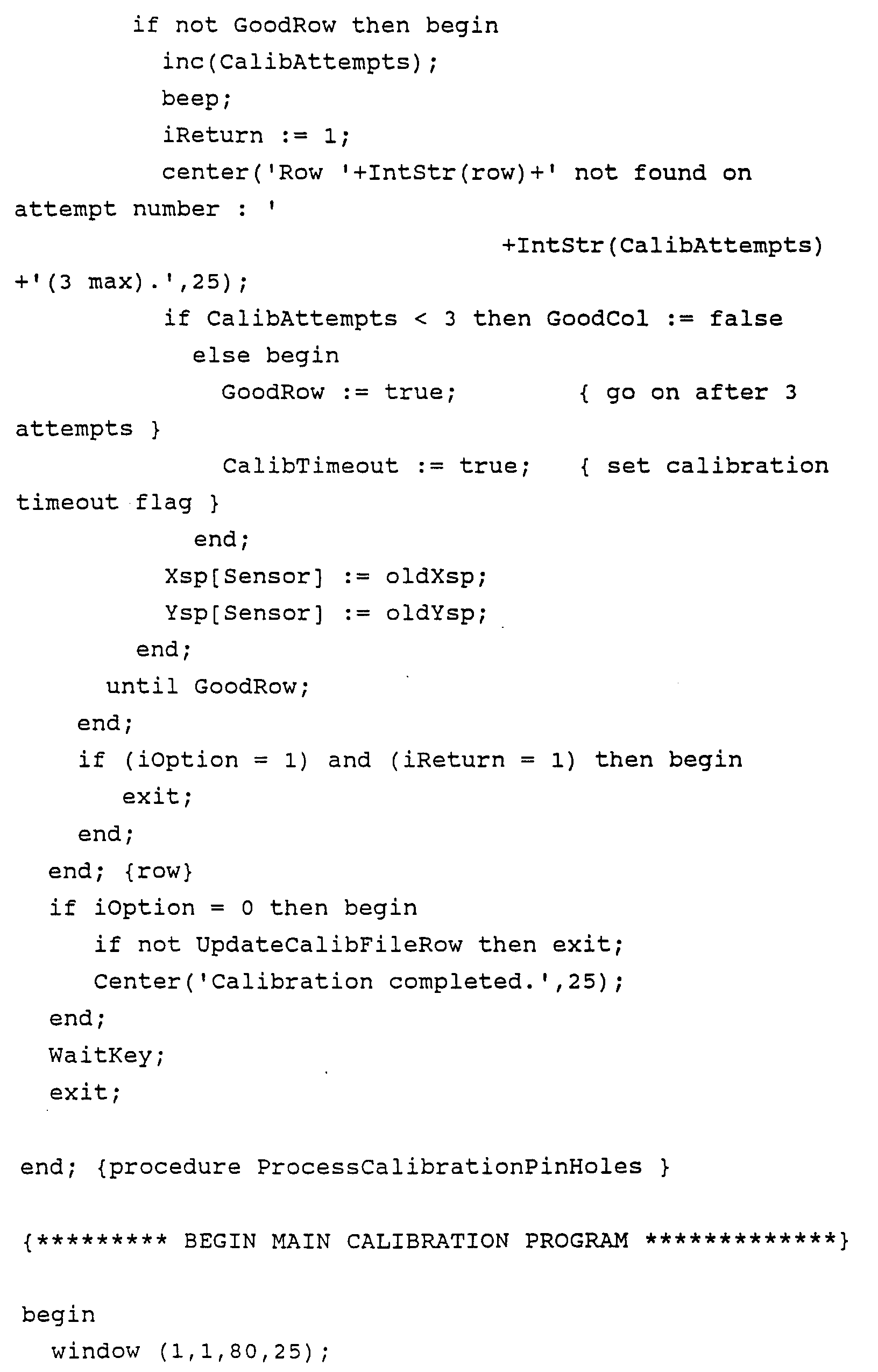 The Pascal function below is a sample for computing the values of the drift correction variables. The 'Ref' variables are the reference positions of the two beam profile sensors read from the disk data file. The 'Now' variables are the most recently determined positions of the two profile sensors. Because of dynamic changes in the physical characteristics of the laser scanning system, the positions held in the 'Now' variables will differ slightly from the ideal reference positions. The goal is to use these position differences to adjust upcoming mirror positions.